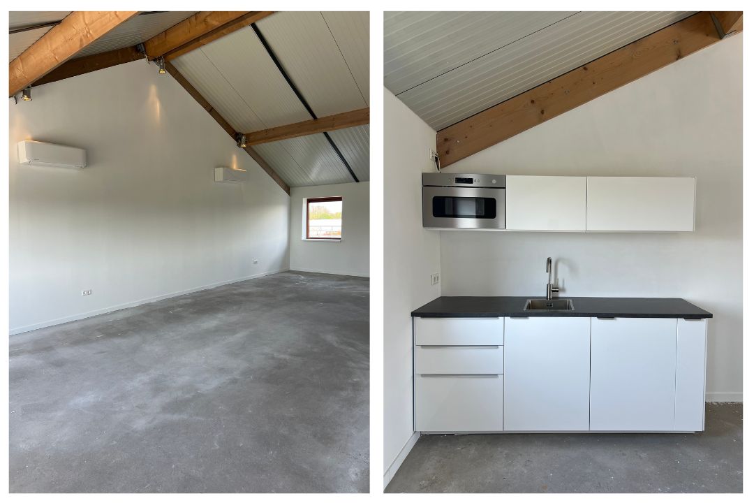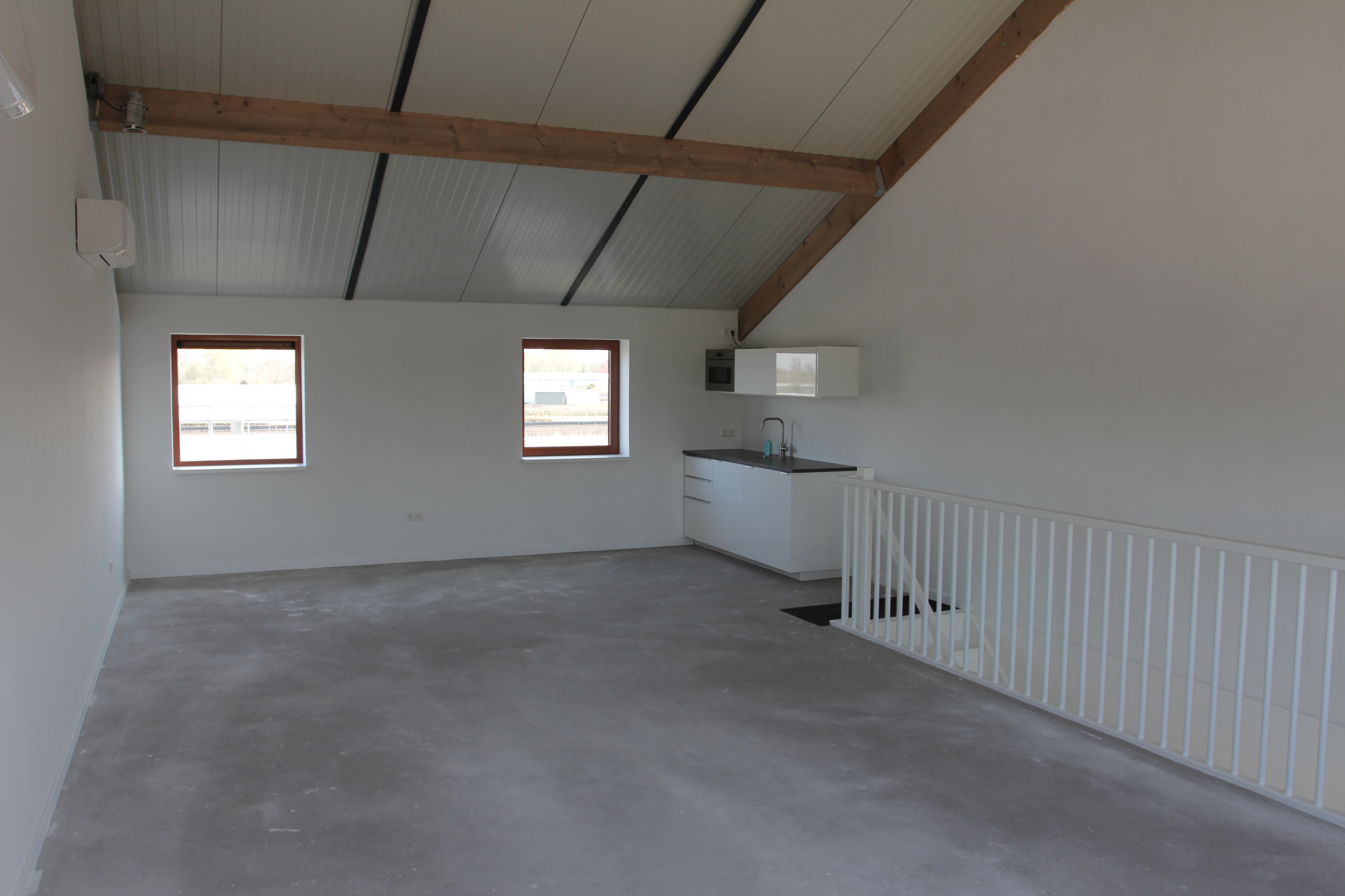 Ook op de 1e verdieping is er een mooie ruimte met wand-/plafondverlichting en een keukenblok met warm/koud water, koelkast en magnetron. Uitermate geschikt voor kantoor of een kantine.