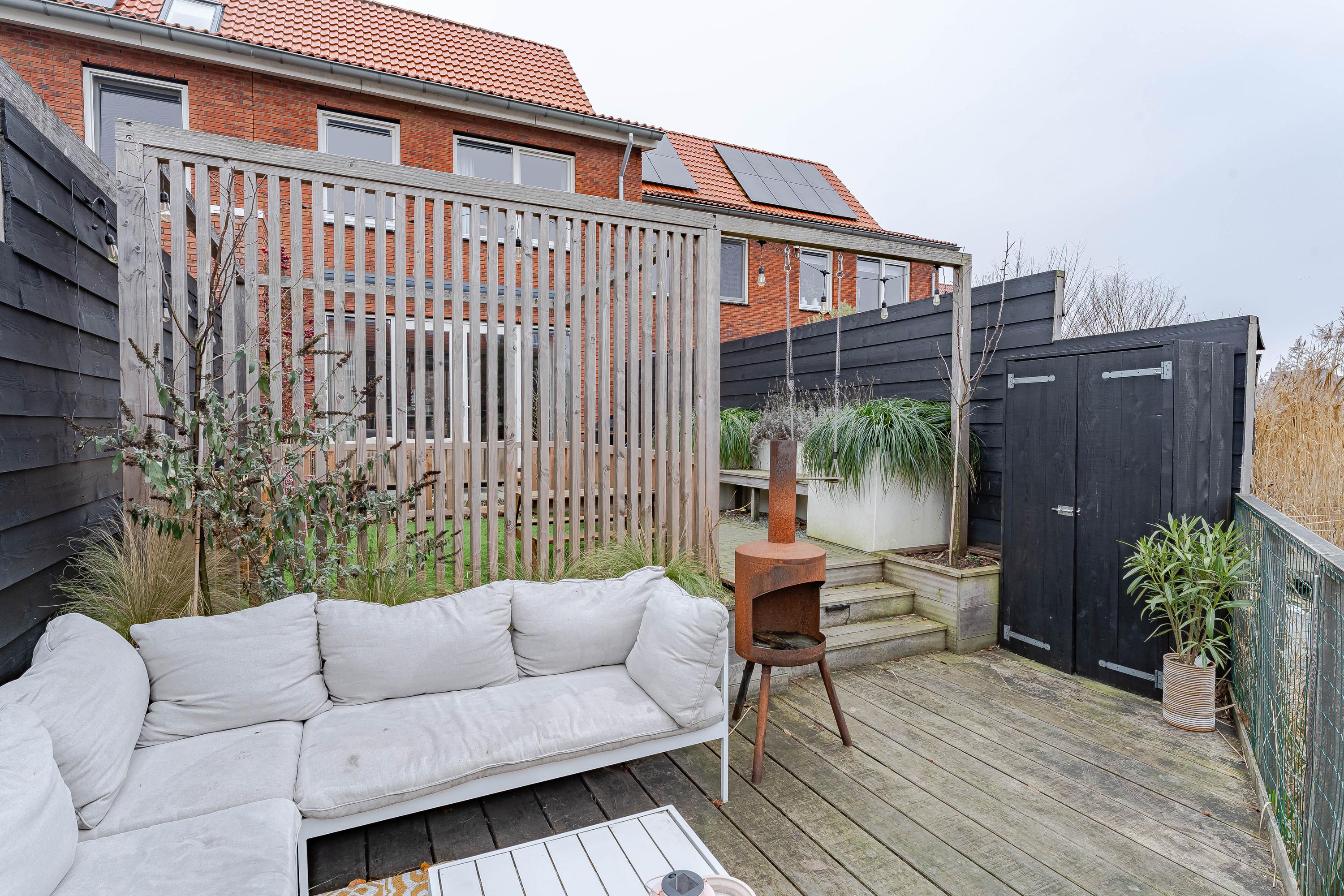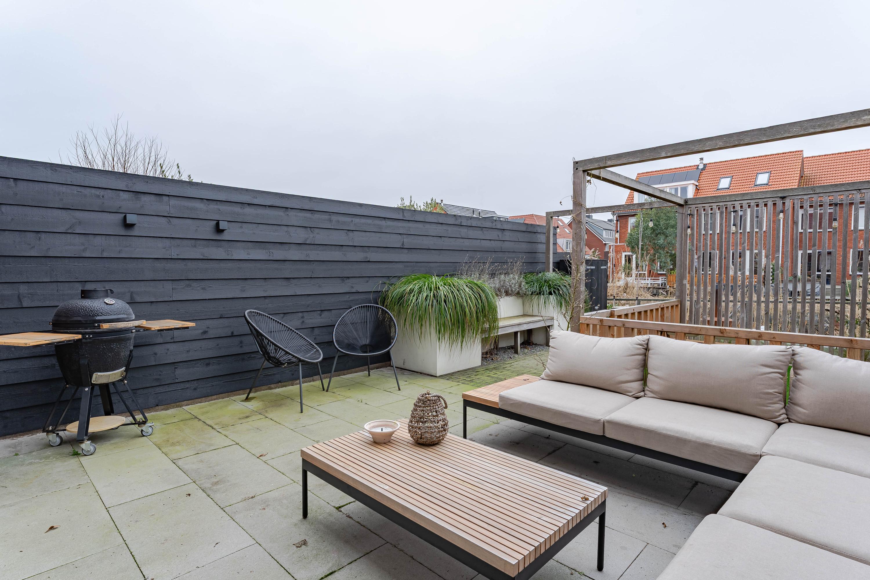 De diepe achtertuin van meer dan 10 meter ligt erg leuk aan het water. De lager gelegen vlonder is een heerlijke plek om van de zon te genieten. Door de ligging op het westen is er de hele dag zon op het terras aan het water en direct achter de woning. Verder is de tuin ingericht met een leuke speelplek voor uw kinderen met kunstgras.