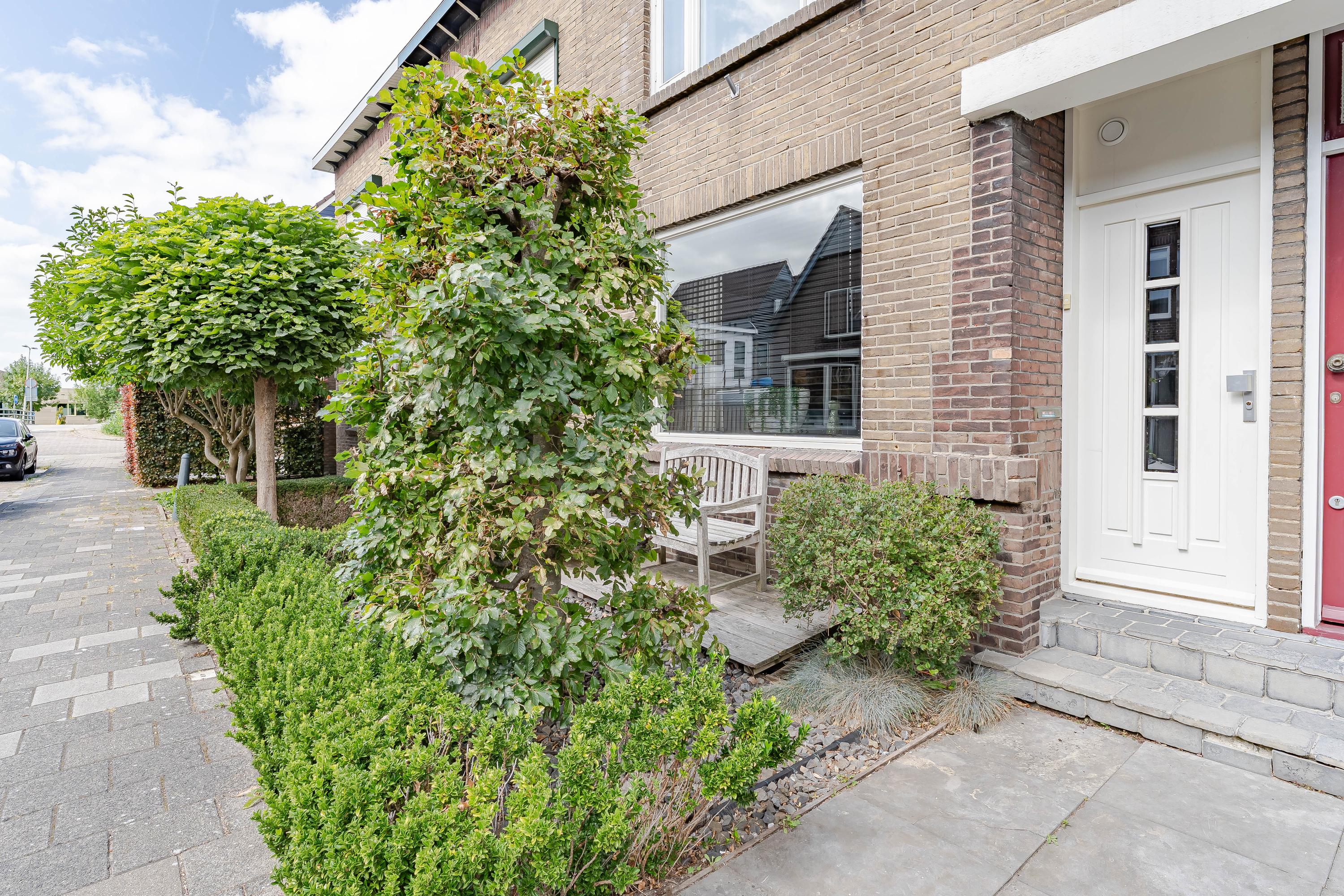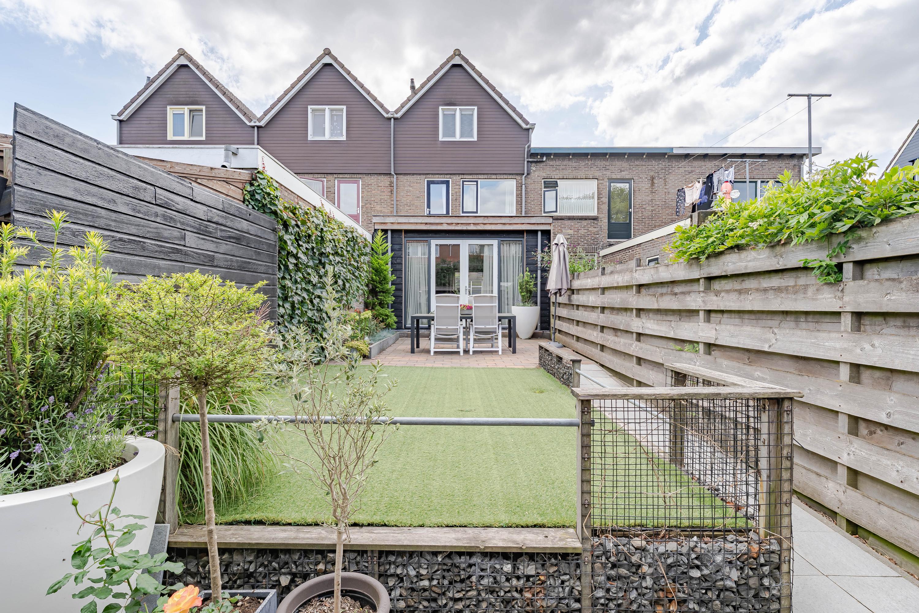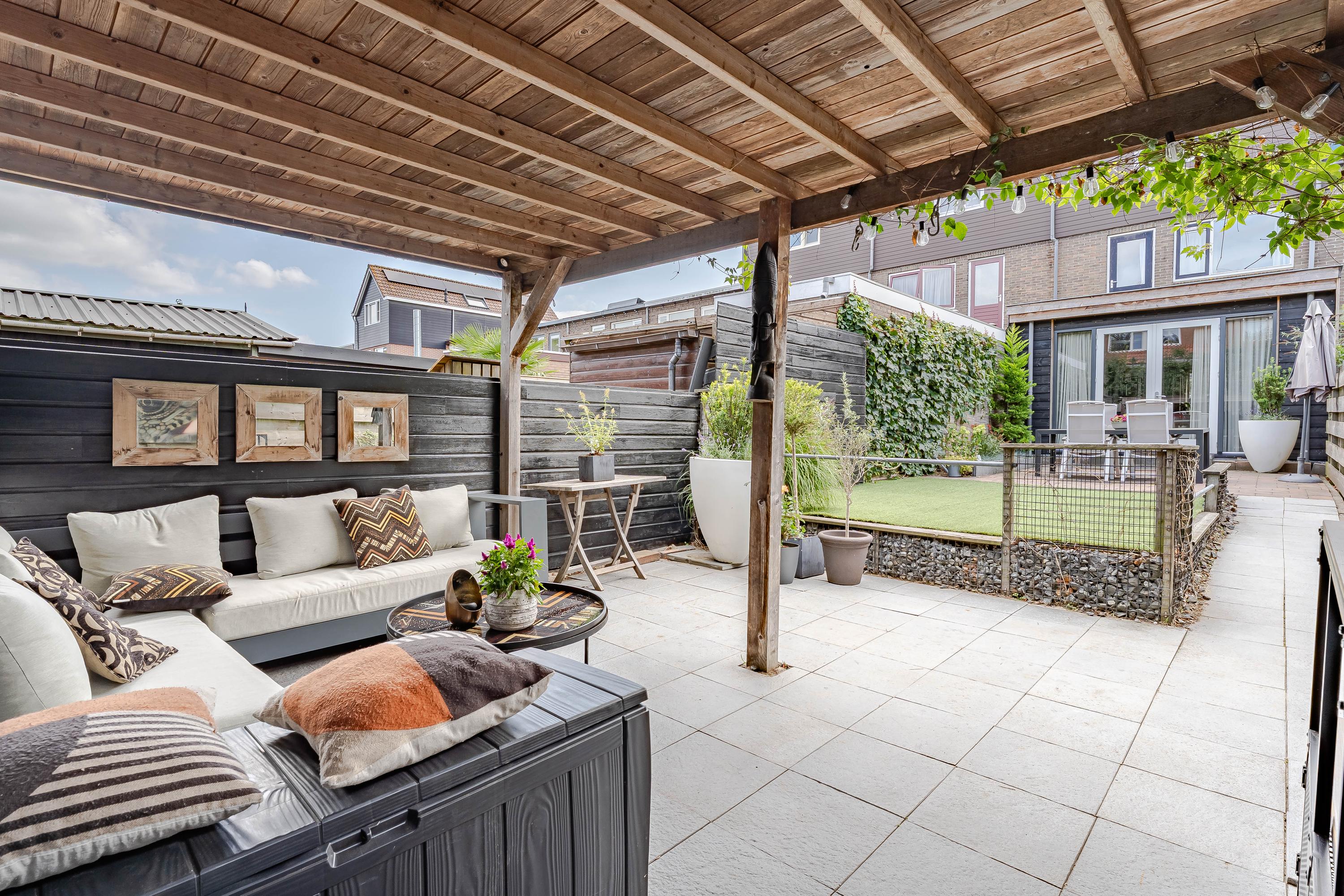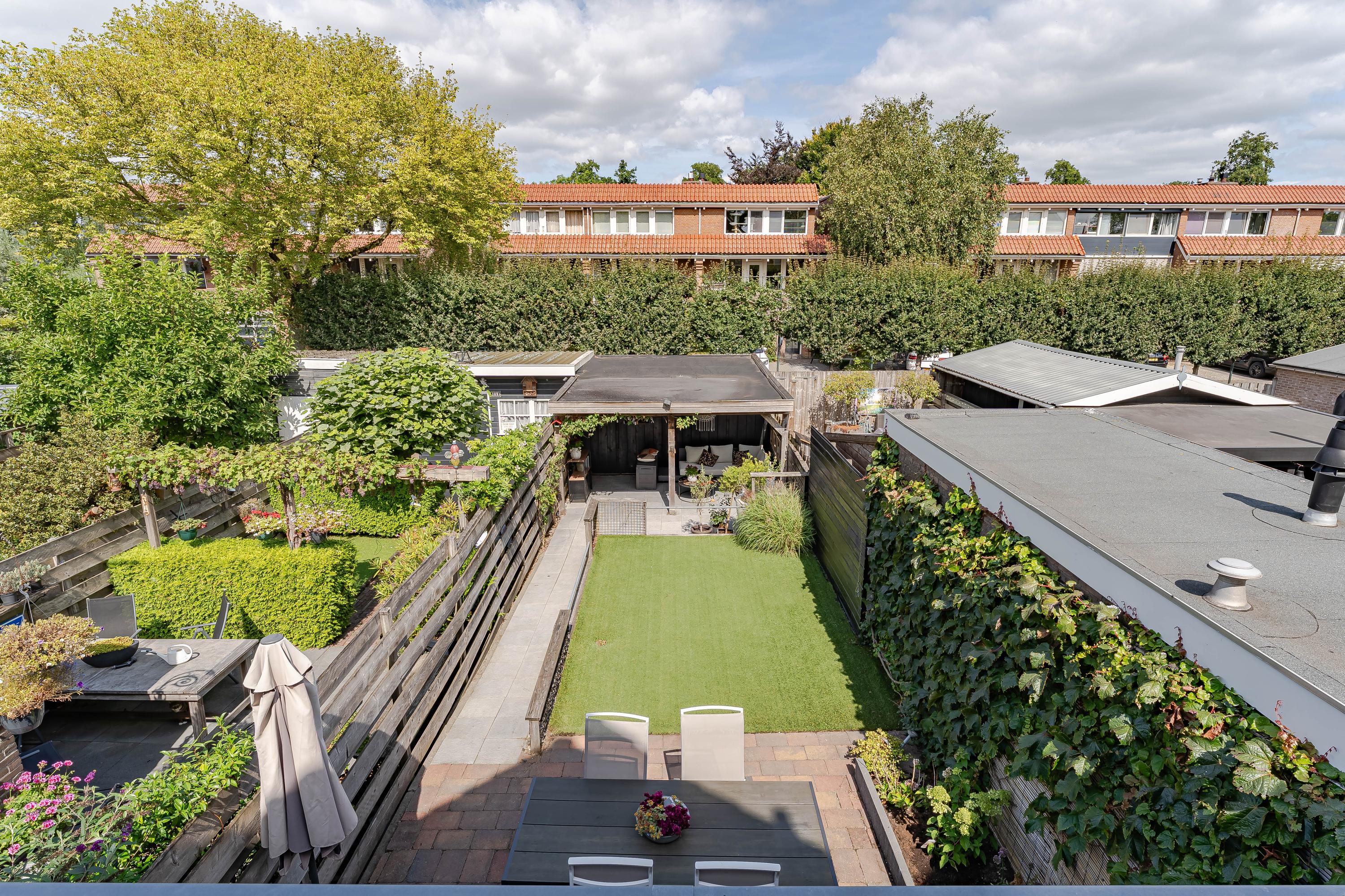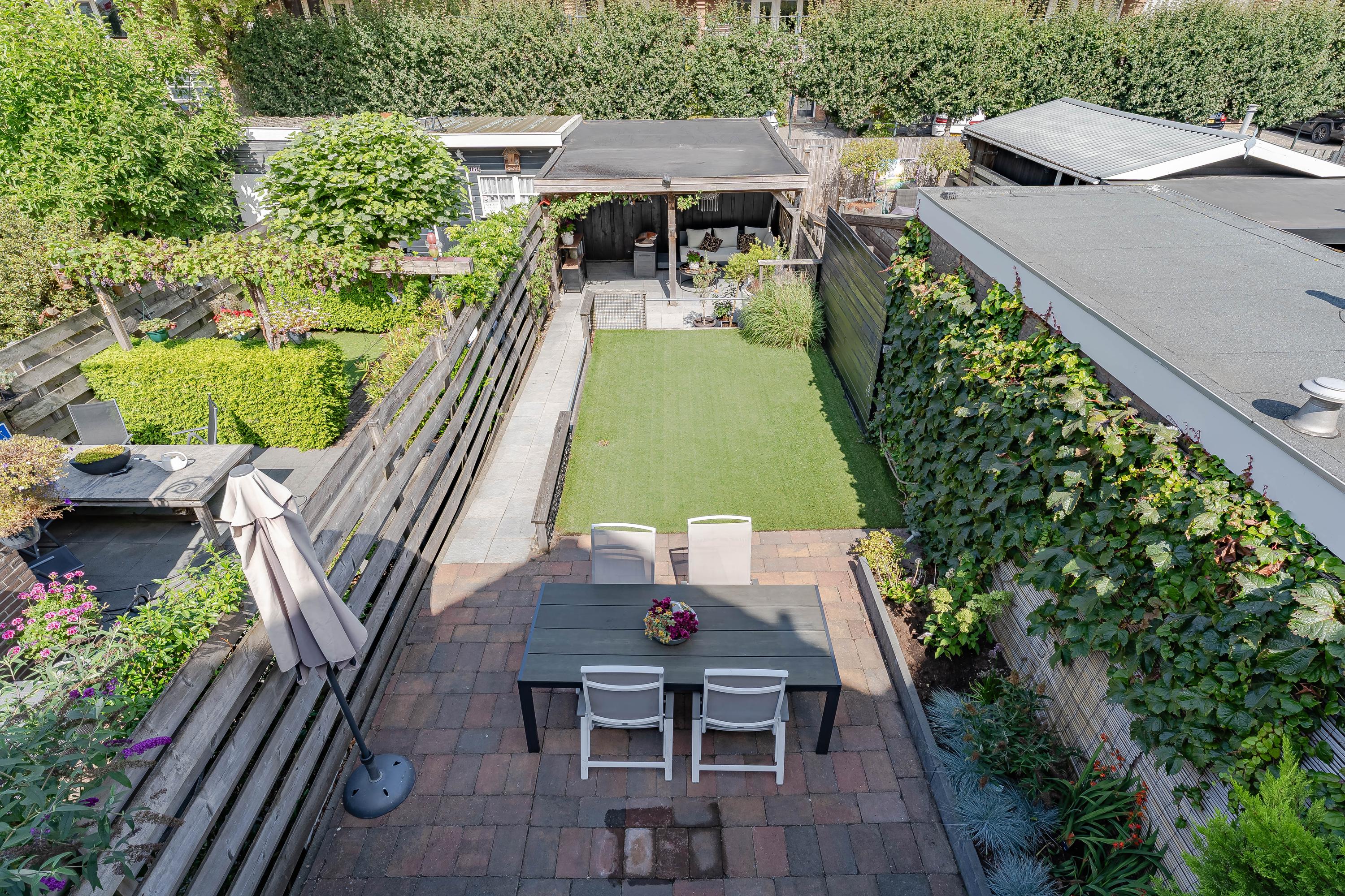 De diepe achtertuin is prachtig aangelegd. Onder de overkapping kunt u genieten van gezellige momenten. Achterin de tuin bevindt zich een ruime berging, die is voorzien van elektra.