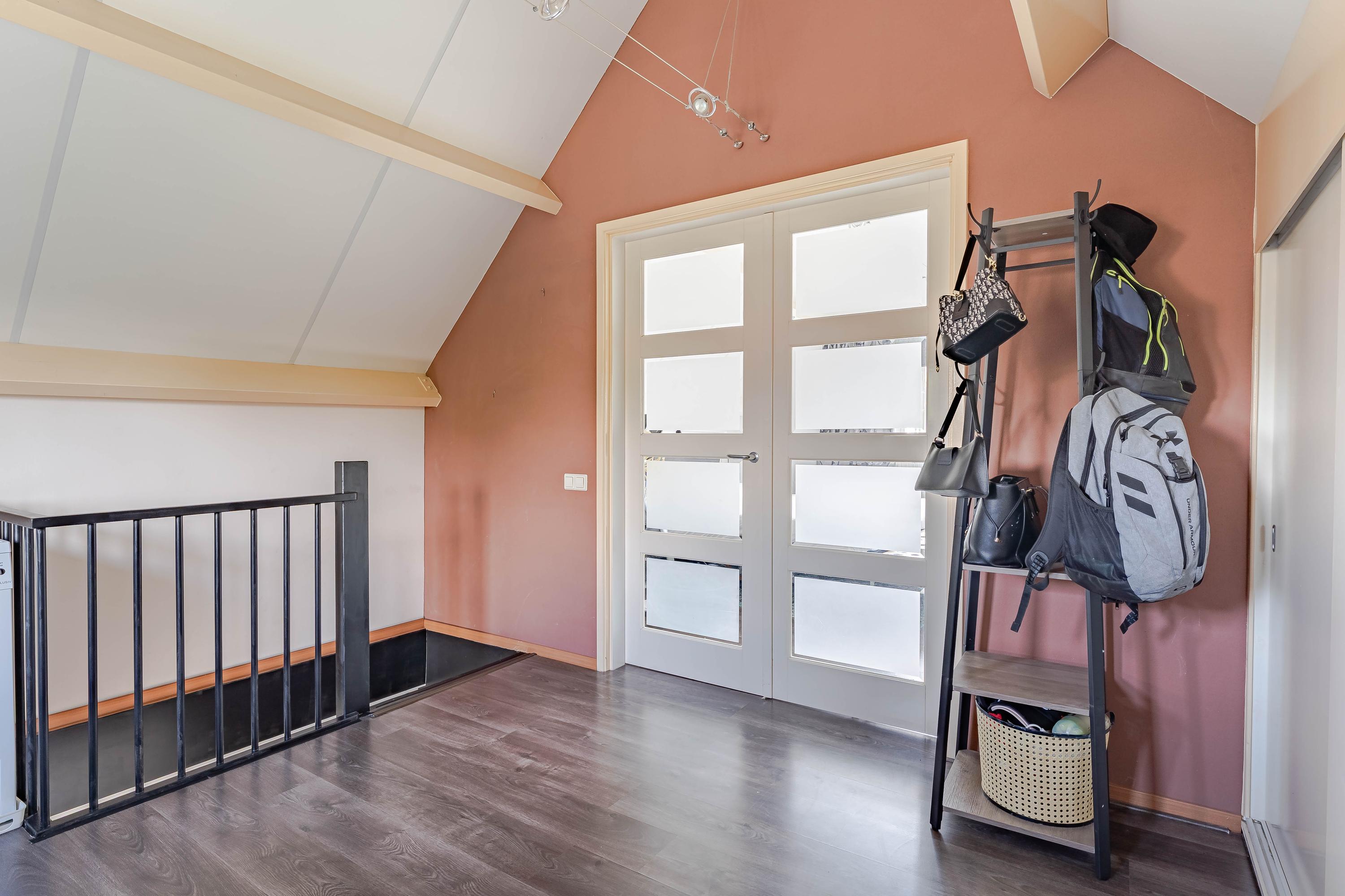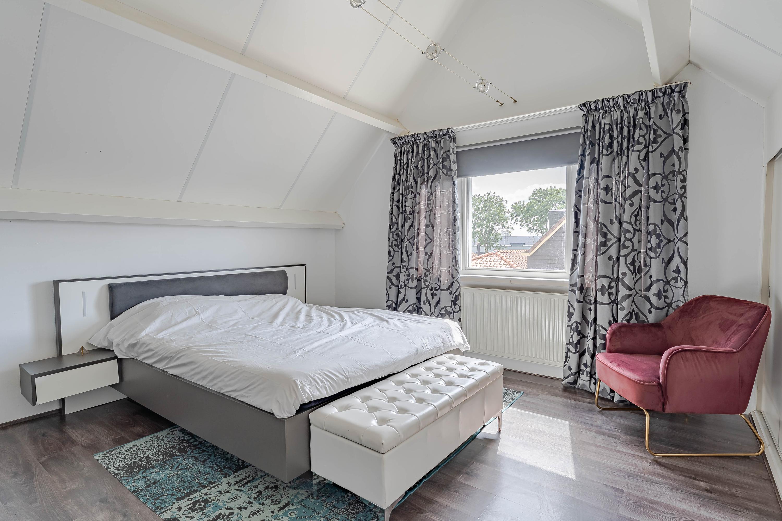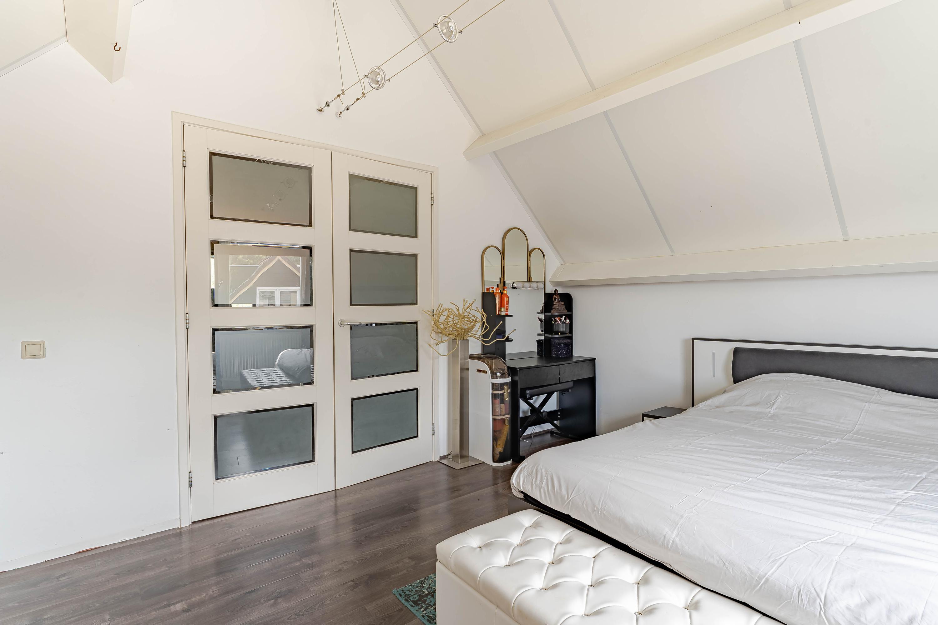 De overloop met vaste trap biedt toegang tot twee slaapkamers, de badkamer en het platte dak van de uitbouw. De slaapkamer aan de achterzijde is van goed formaat en heeft door het grote raam veel lichtinval. De slaapkamer aan de voorzijde is royaal, voorzien van vaste kasten en biedt eveneens veel licht. De betegelde badkamer is uitgerust met een douche, wastafel met meubel en kolomkasten.
