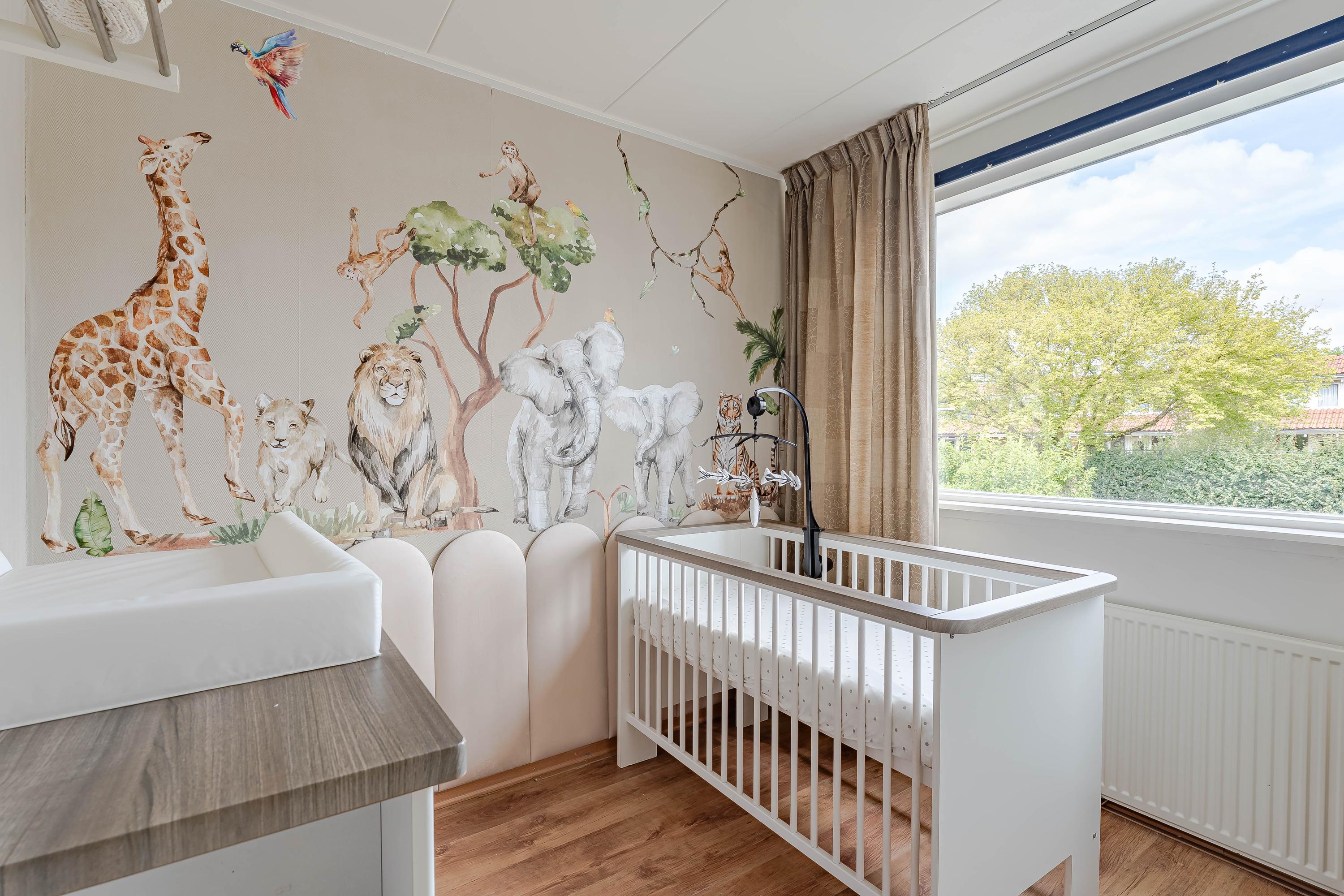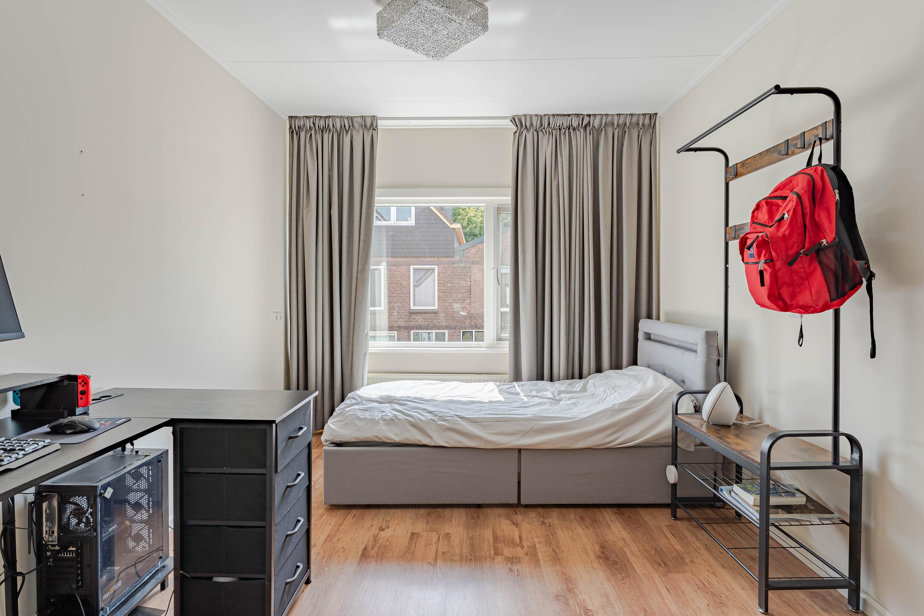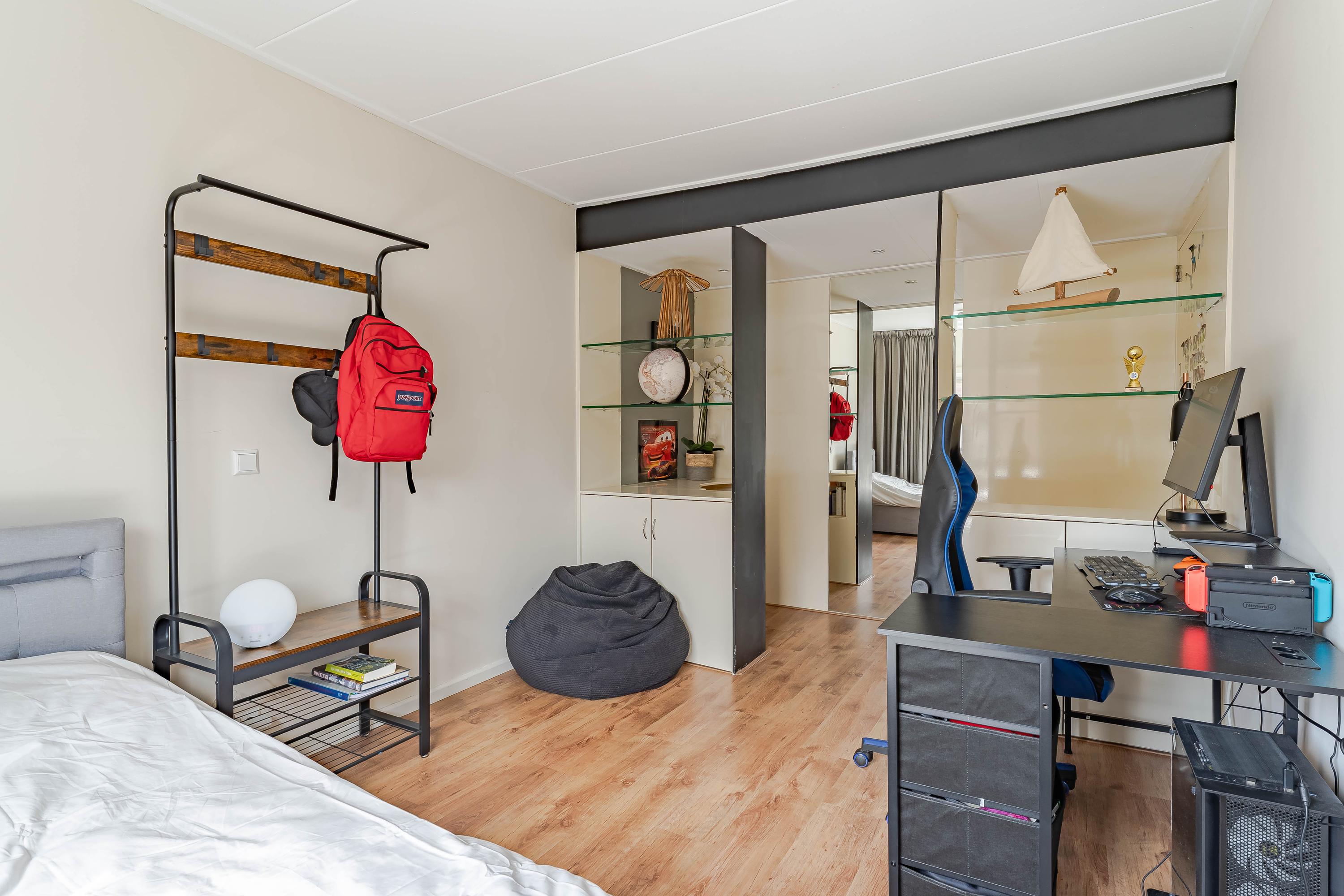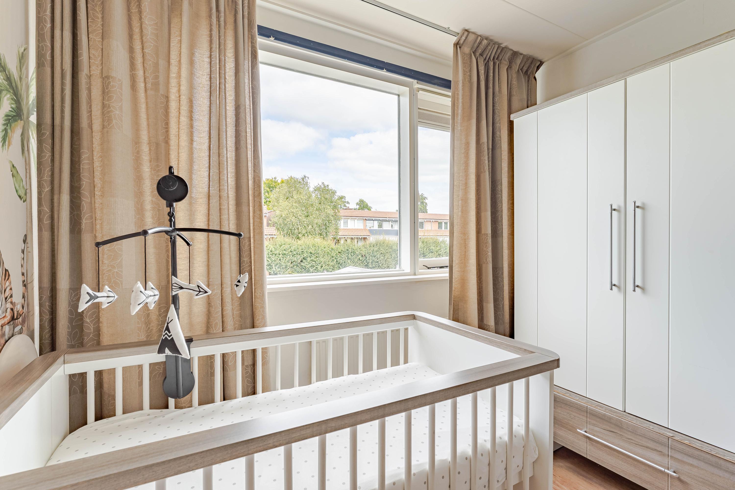 De overloop met vaste trap biedt toegang tot twee slaapkamers, de badkamer en het platte dak van de uitbouw. De slaapkamer aan de achterzijde is van goed formaat en heeft door het grote raam veel lichtinval. De slaapkamer aan de voorzijde is royaal, voorzien van vaste kasten en biedt eveneens veel licht. De betegelde badkamer is uitgerust met een douche, wastafel met meubel en kolomkasten.