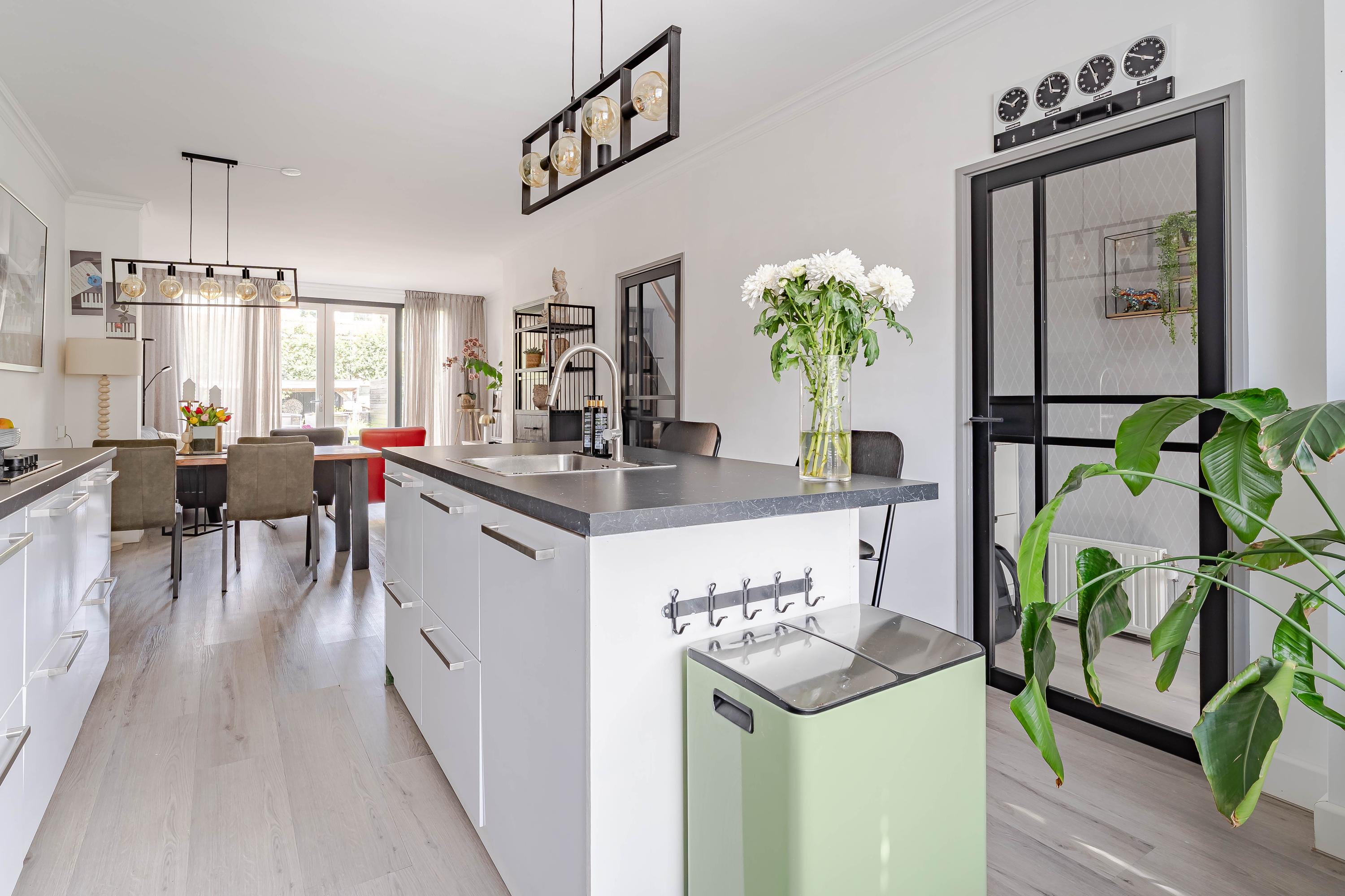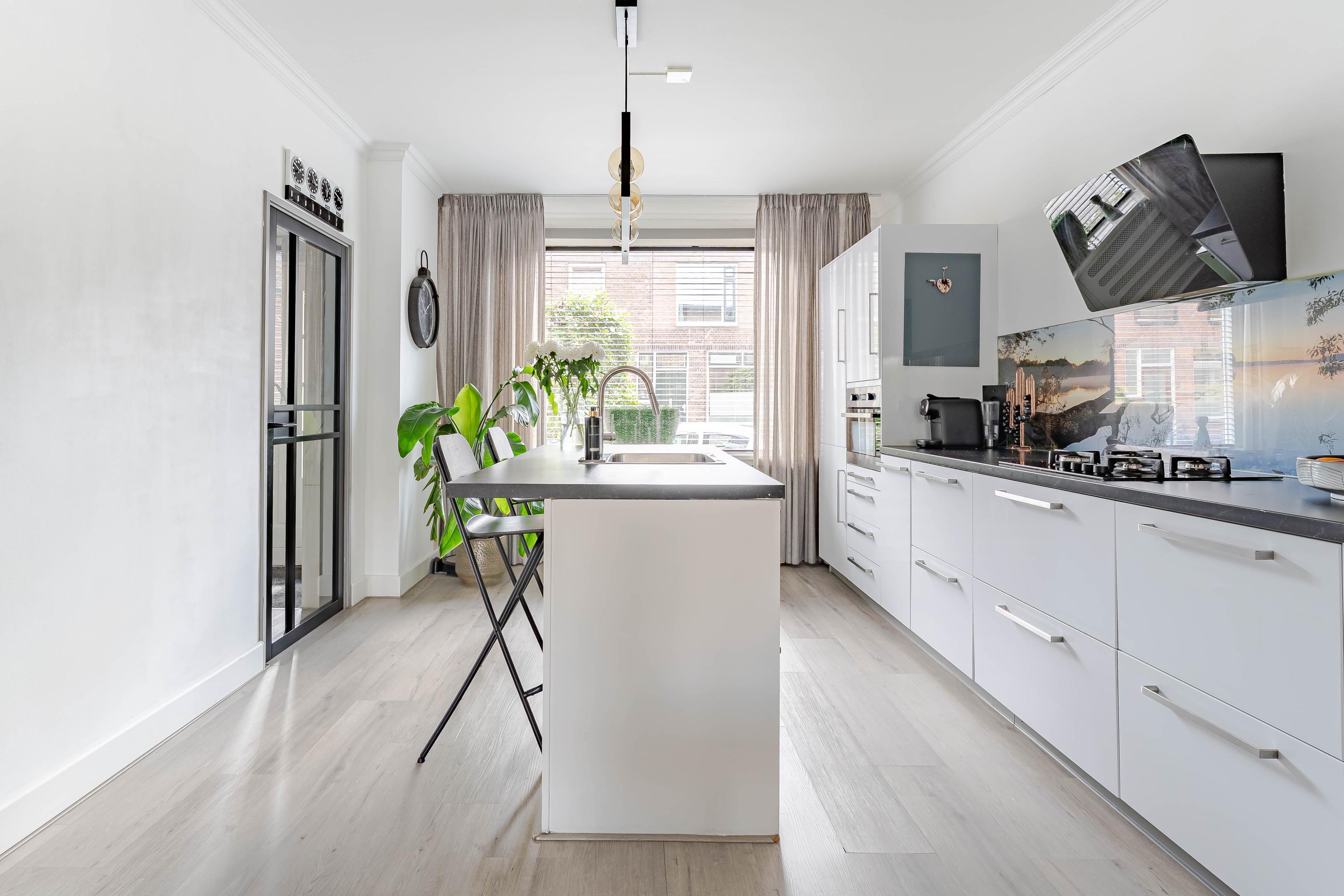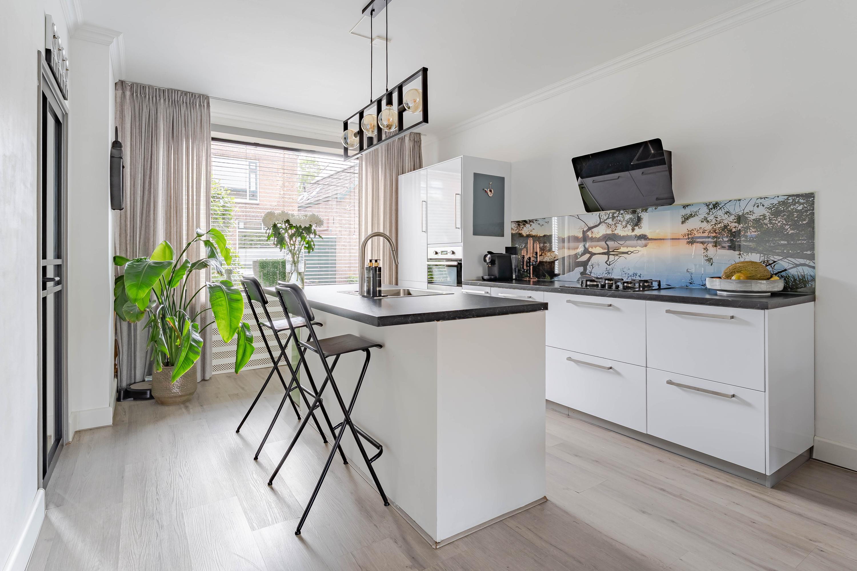 Entreehal met garderobe, meterkast en toegang tot de keuken en woonkamer. De lichte, uitgebouwde woonkamer is voorzien van een laminaatvloer en openslaande deuren naar de zonnige achtertuin. Aan de voorzijde bevindt zich de keuken, uitgerust met een vrijstaand spoeleiland. De keuken biedt voldoende kastruimte en is voorzien van een 4-pits gaskookplaat, afzuigkap, combioven, vaatwasser, koelkast, vriezer en kokend waterkraan. Het aanrecht van het spoeleiland steekt aan één zijde uit, zodat u daar gezellig kunt zitten.