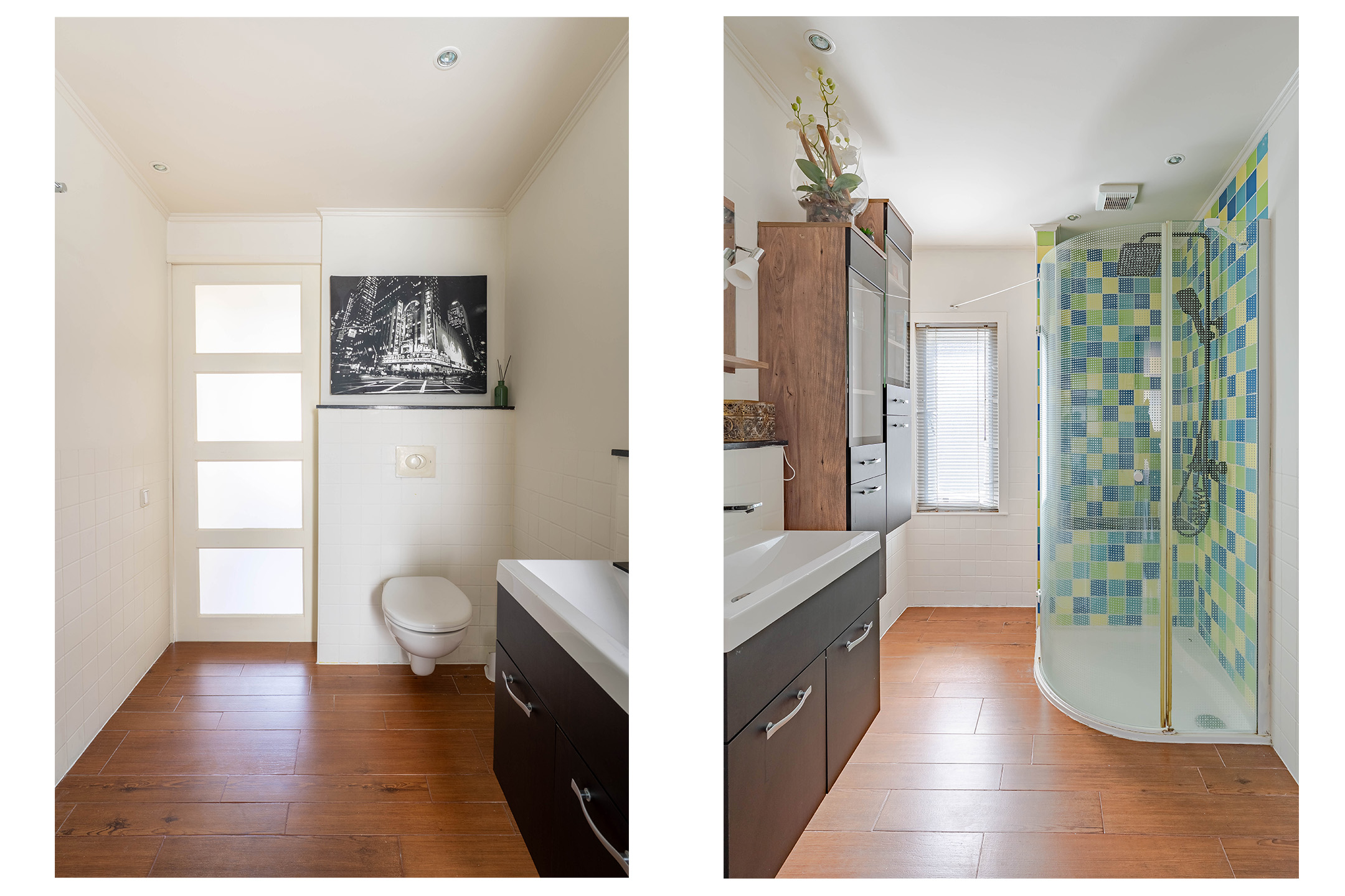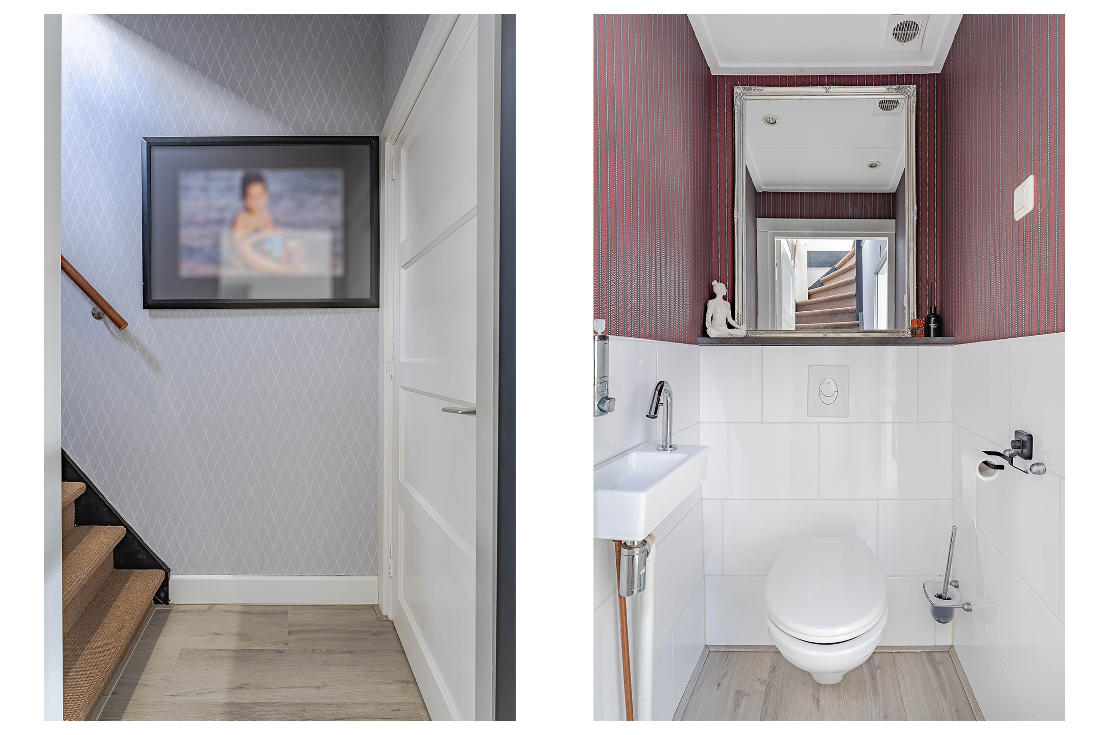 Vanuit de woonkamer is de tussenhal bereikbaar, waar de toiletruimte en de trap naar de eerste verdieping zich bevinden.