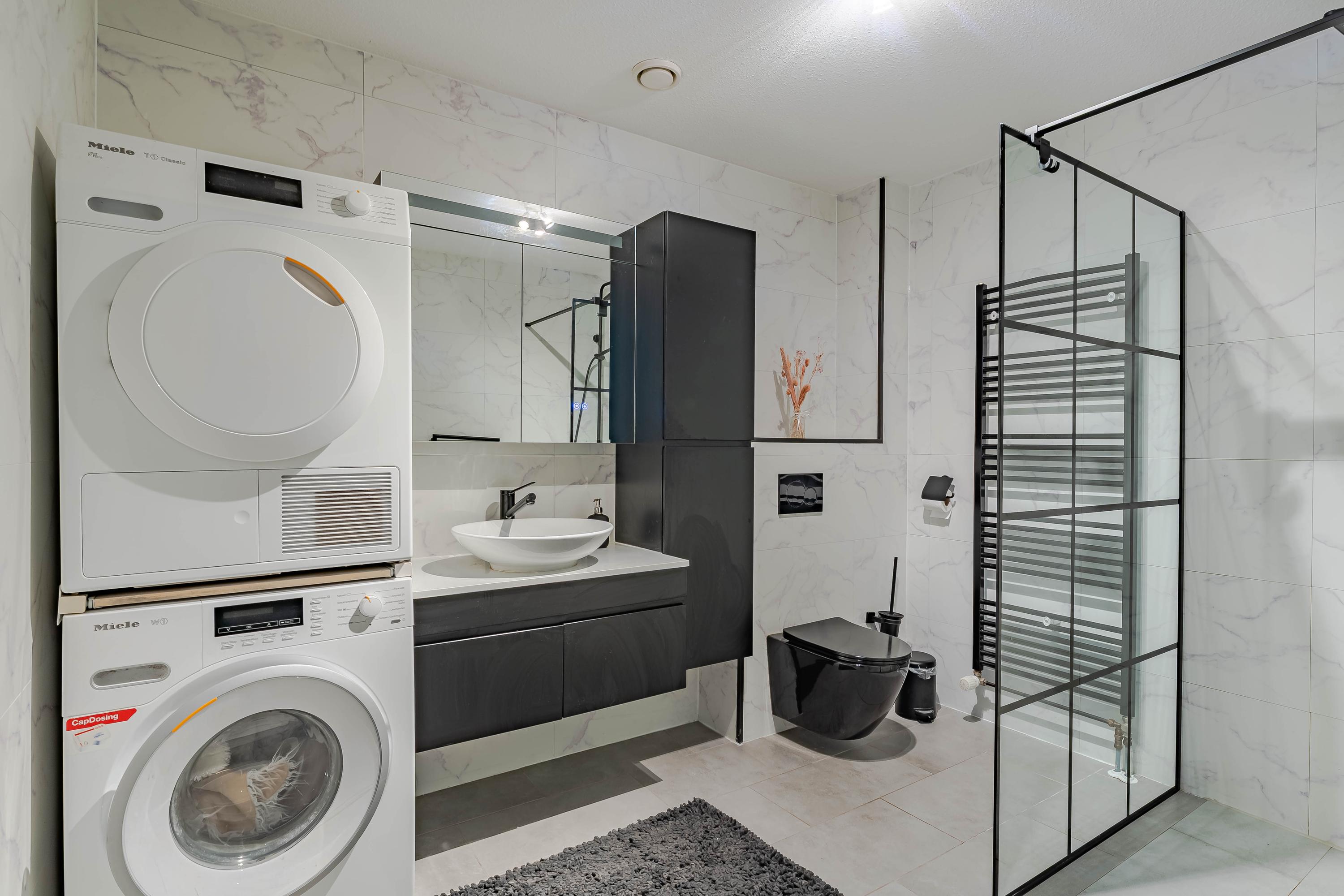 In 2022 zijn tevens de badkamer en toiletruimte vernieuwd. De badkamer is royaal, volledig betegeld en voorzien van een inloopdouche, zwevend closet, wastafel met meubel, spiegelkast en kolomkast. Daarnaast vindt u hier de wasmachine- en drogeropstelling. Uiteraard kunnen beiden ook met gemak in de technische ruimte/berging geplaatst worden. De separate toiletruimte is uitgevoerd met een zwevend closet en een fonteintje. Ook deze heeft een moderne uitstraling.