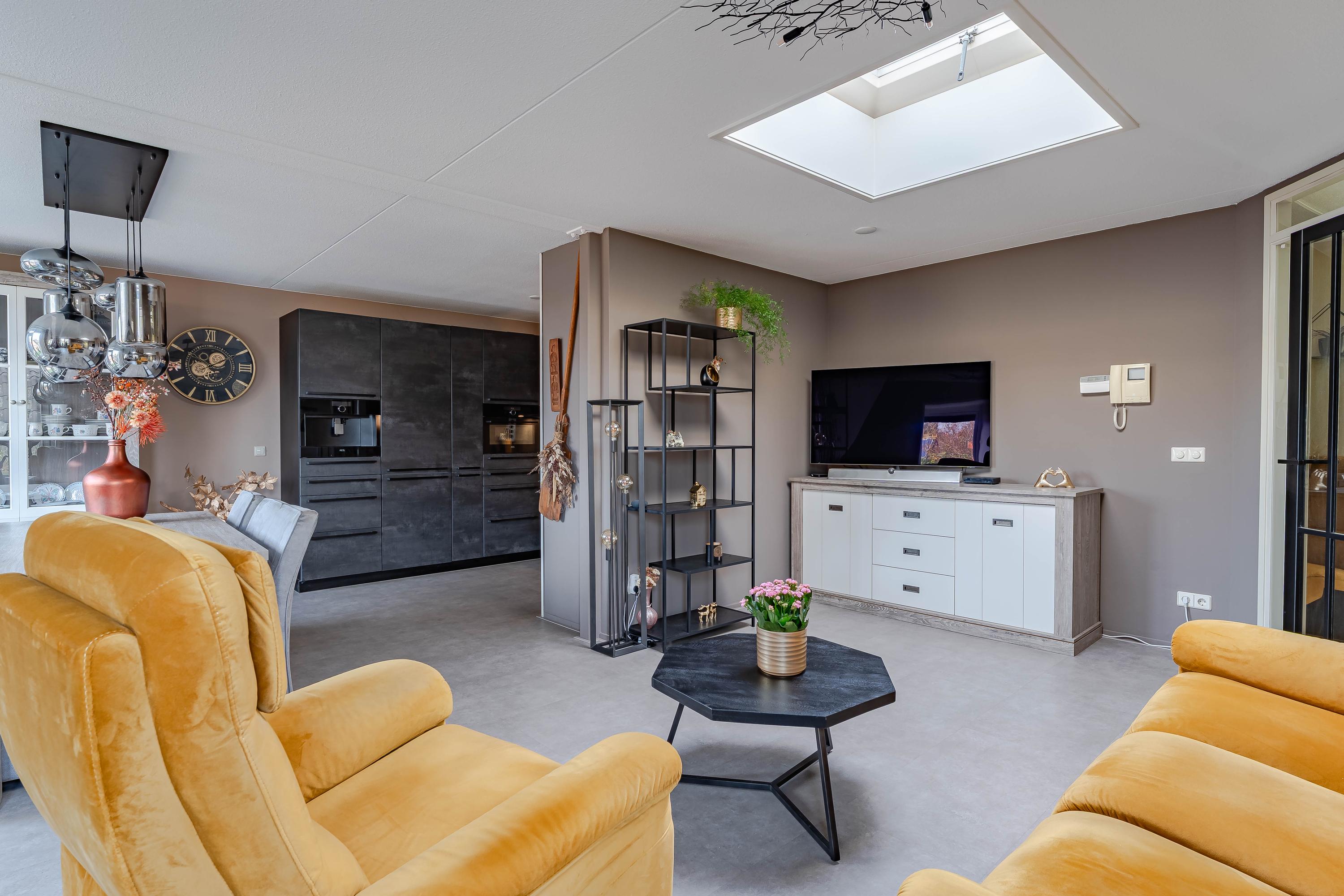 De woonkamer met open keuken is heerlijk licht, dit komt door de vele raampartijen en de lichtkoepel die in het midden van de kamer is geplaatst. Alle ruimte voor het plaatsen van al uw meubels. De in 2022 vernieuwde keuken is ruim opgezet en heeft een luxe uitstraling. Aan inbouwapparatuur treft u het volgende aan: 4-pits inductiekookplaat met geïntegreerde afzuiging, combioven, extra ruime koelkast, Quooker en een koffieautomaat. De kasten bieden voldoende bergruimte voor al uw voorraad en keukengerei. Het aanrecht is van kunststof.