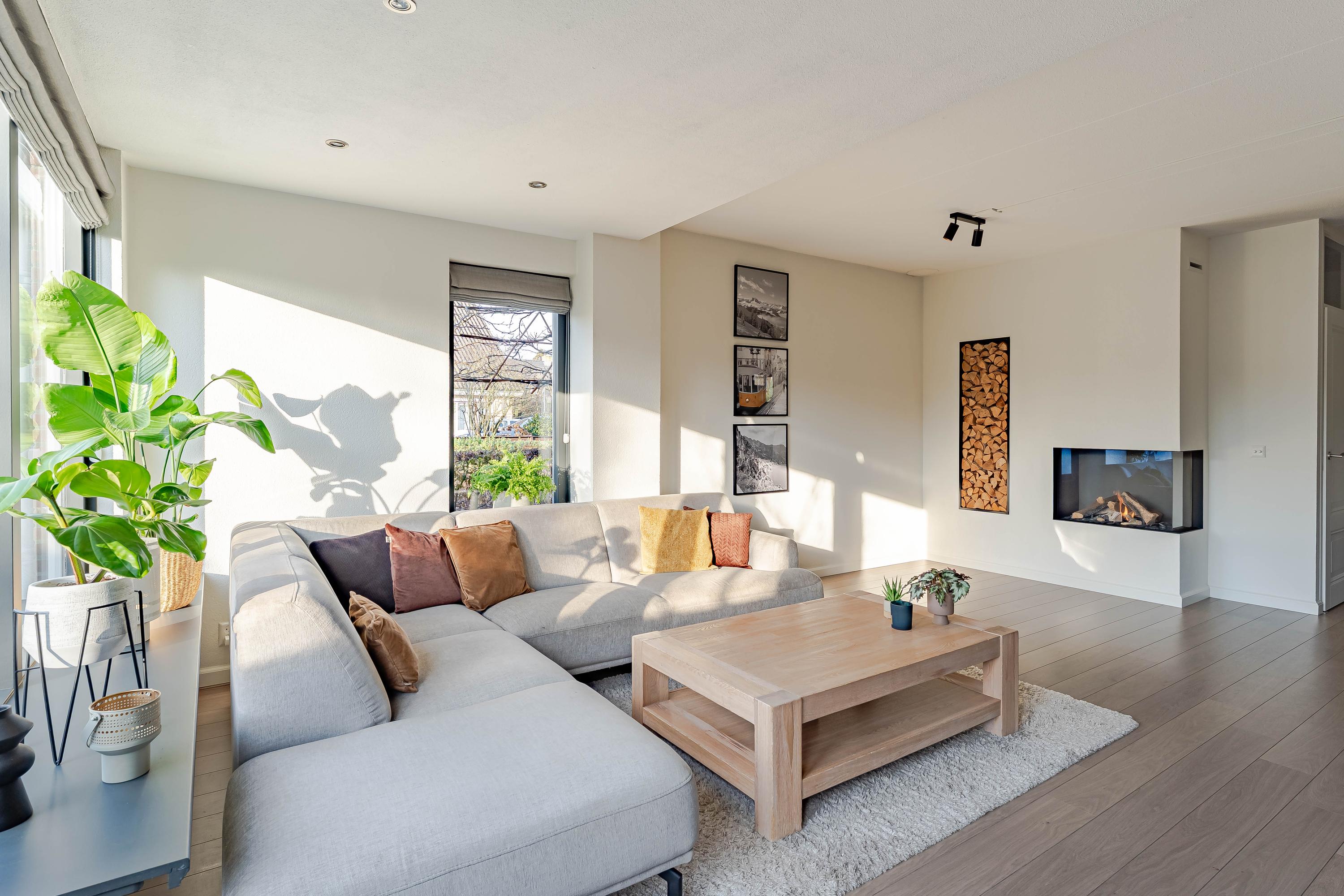 Dankzij de grote raampartijen en het zijraam beschikt de tuingerichte woonkamer over veel daglicht. Er is voldoende ruimte voor een eethoek en zithoek. Verder geeft de gashaard in de winter extra warmte en sfeer. Het elektrische zonnescherm zorgt in de zomermaanden juist voor schaduw.