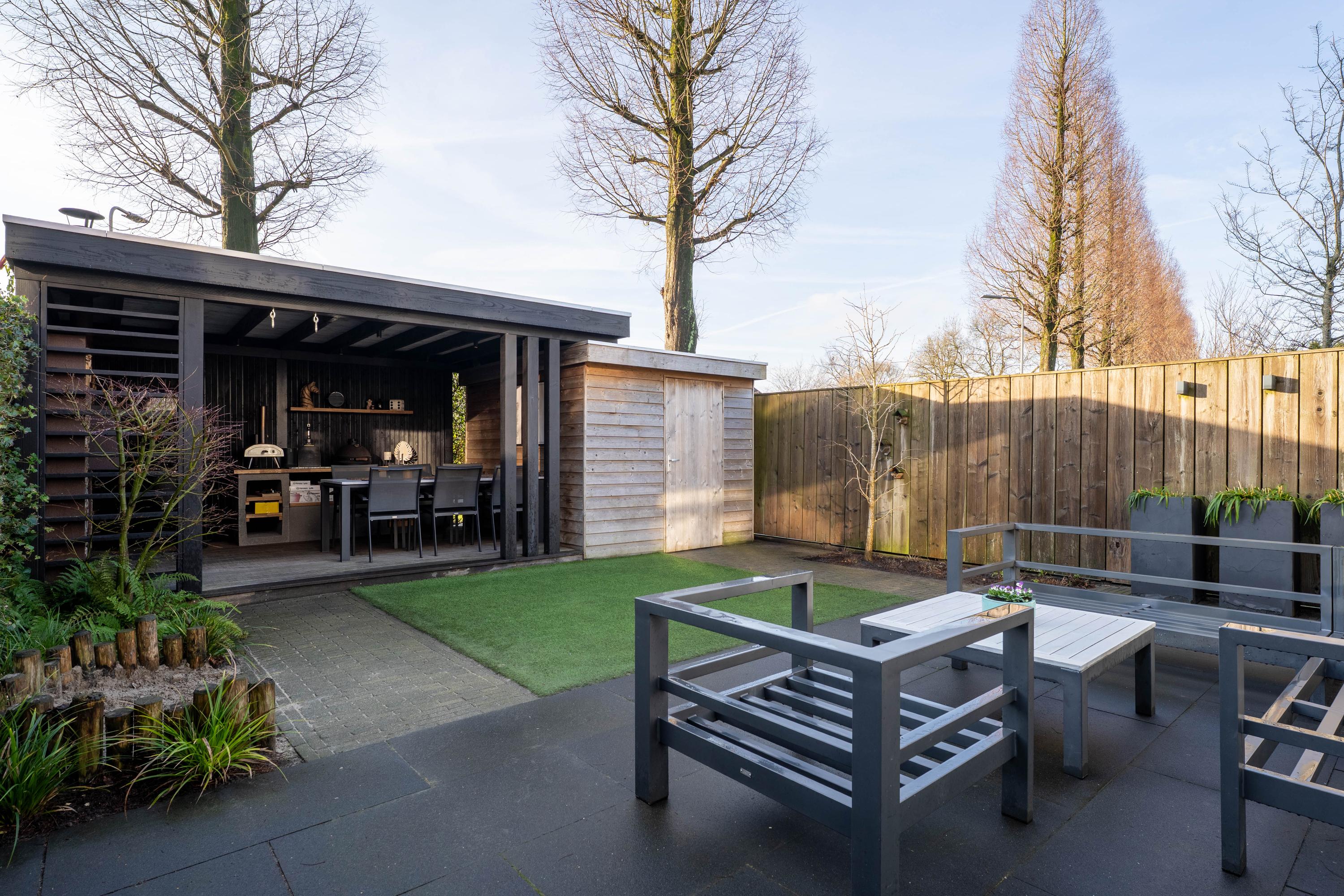 Vanuit de woonkamer stapt u in de in 2017 nieuw aangelegde achtertuin. De tuin ligt op het zuiden en beschikt over een achterom via de zijtuin. De houten berging (2017) is ideaal voor het opbrengen van de tuinkussens, fietsen en andere tuinspullen. Drie jaar geleden is de overkapping geplaatst met een vaste buitenhaard, een heerlijk plek om van het buitenleven te genieten!