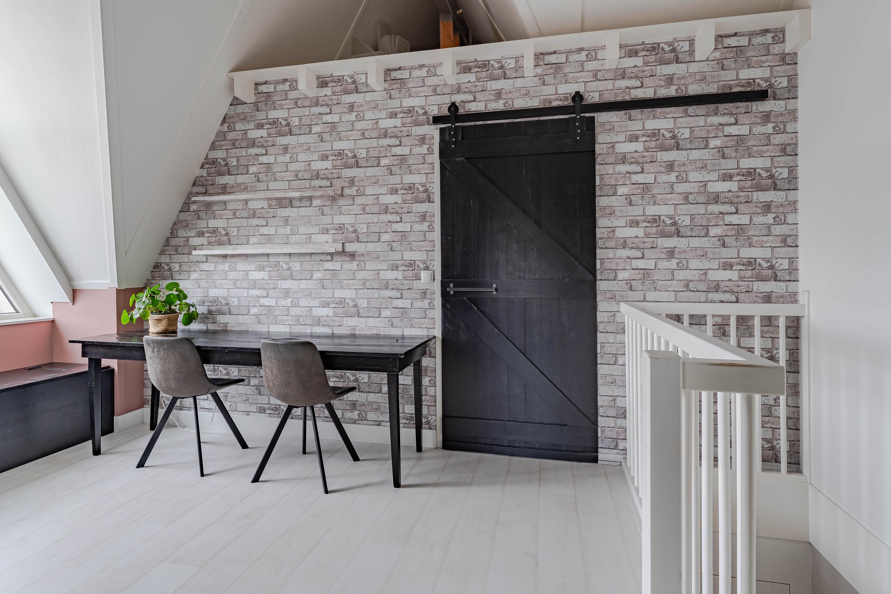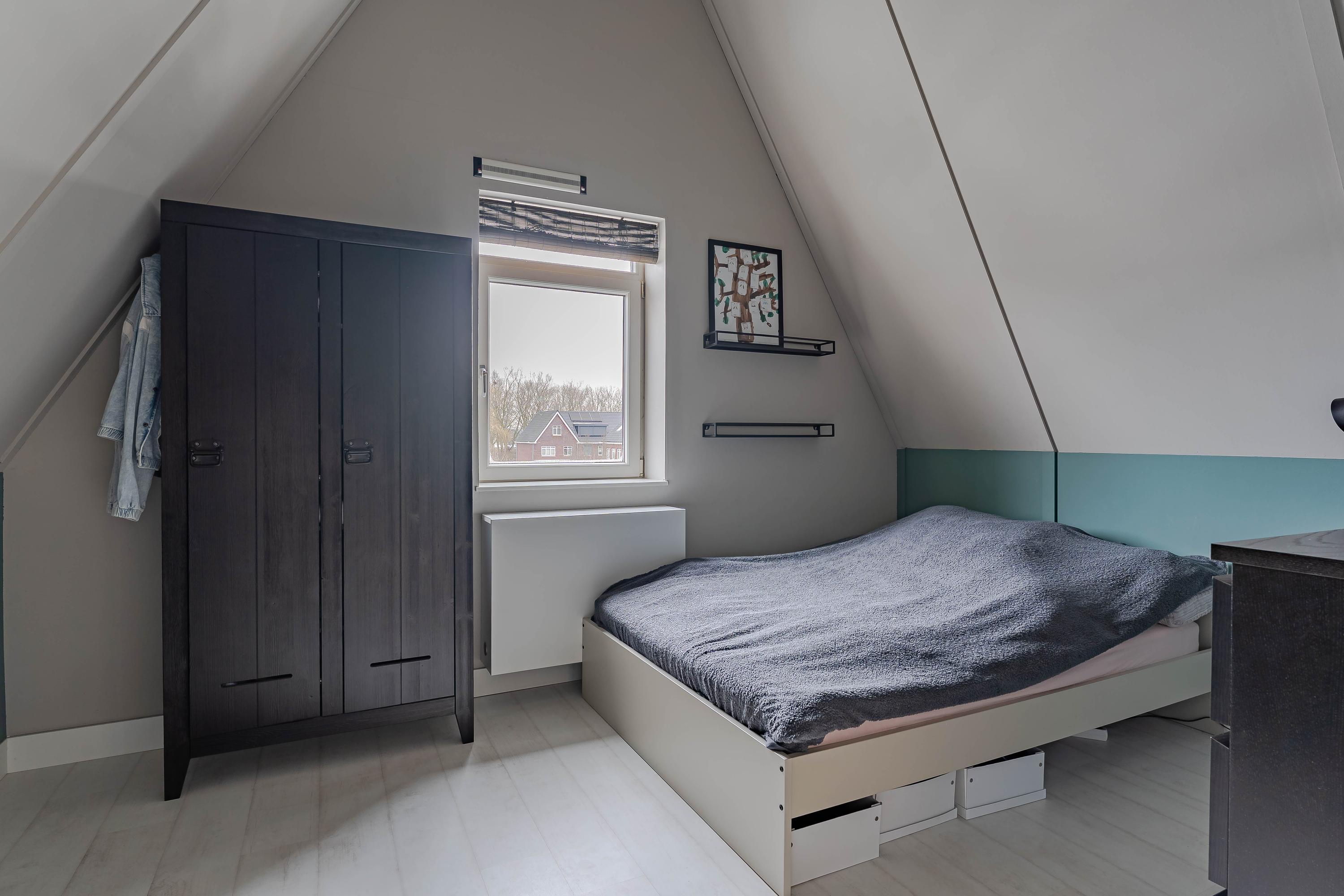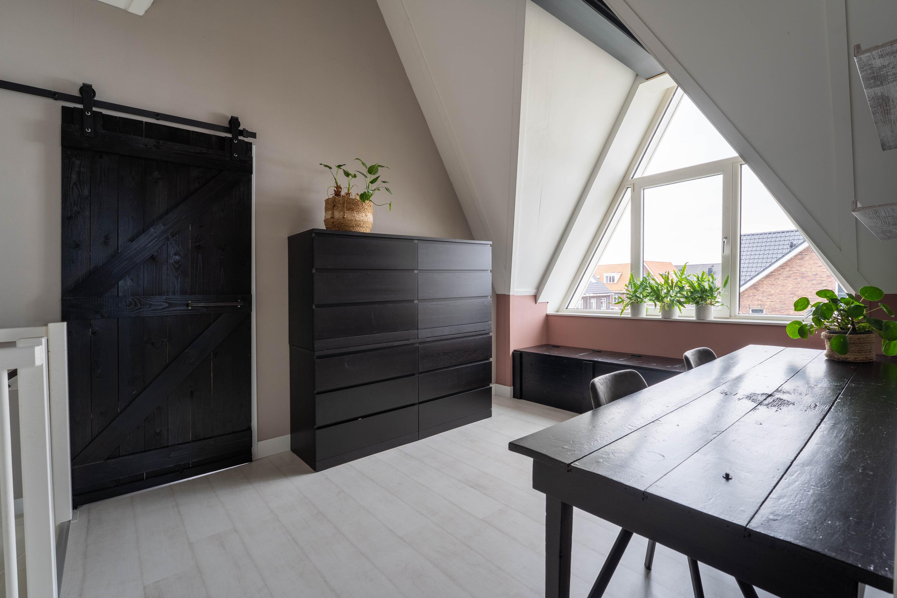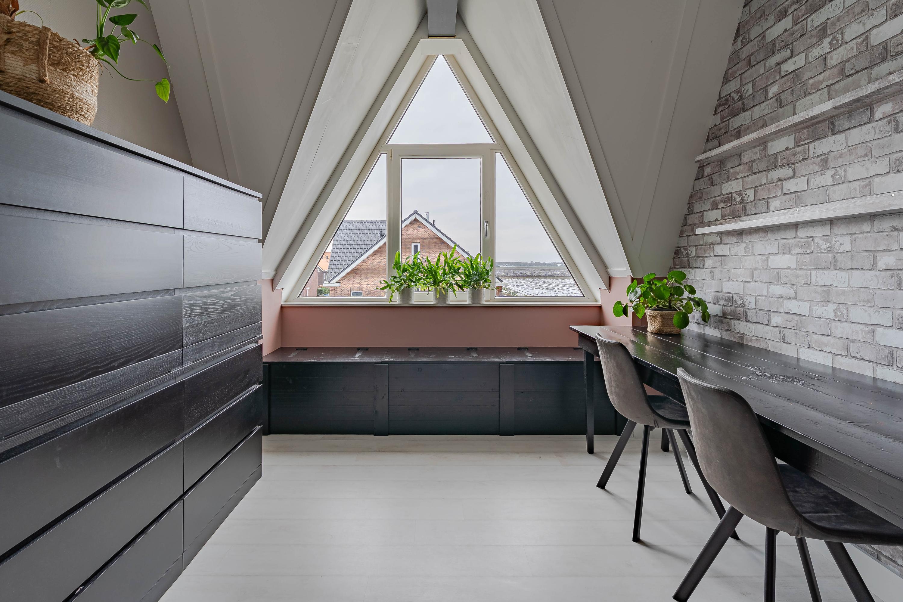 Tweede verdieping: De vaste trap leidt naar een royale zolderverdieping, waar het opvallende driehoekige zijraam direct in het oog springt. Dit zorgt voor een veelzijdige lichte ruimte, perfect als werkplek of hobbykamer in te richten. Met een plafondhoogte van circa 4,40 meter voelt deze ruimte nog ruimer aan.
