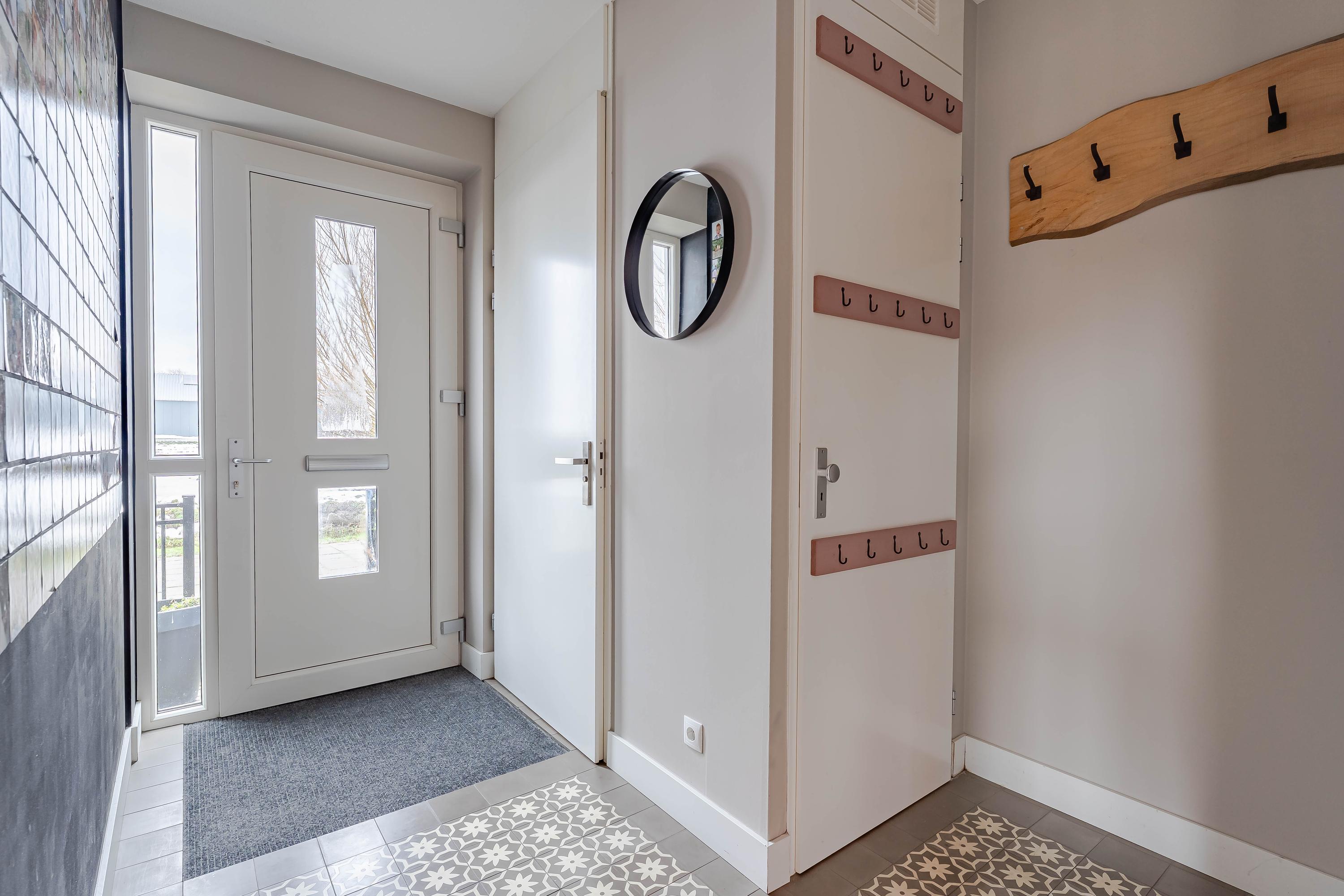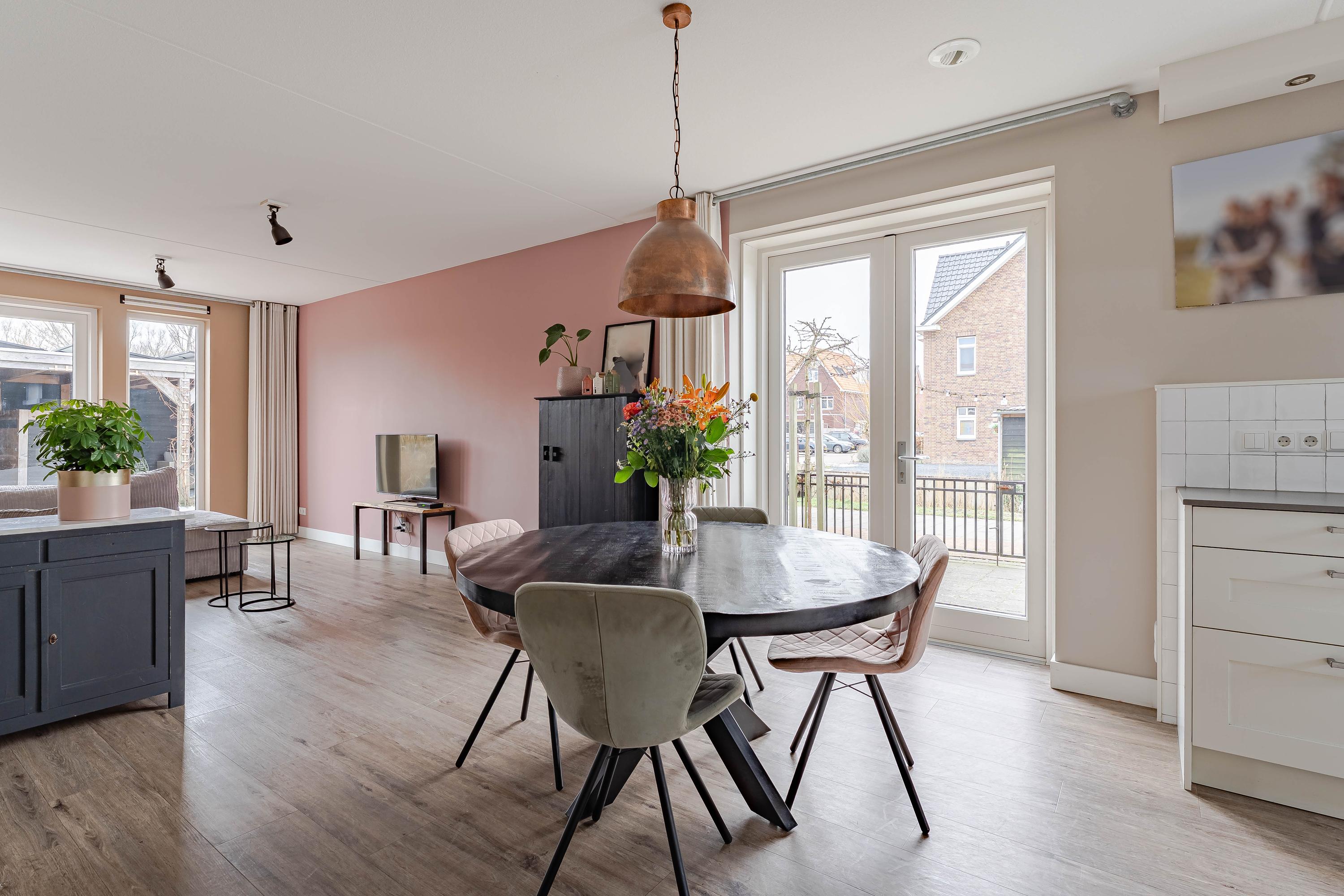 De lichte en ruime woonkamer voelt direct warm en uitnodigend aan dankzij de grote raampartijen. Openslaande deuren zorgen voor een naadloze overgang naar de zonnige zij- en achtertuin. Daarnaast biedt een handige trapkast extra opbergruimte.