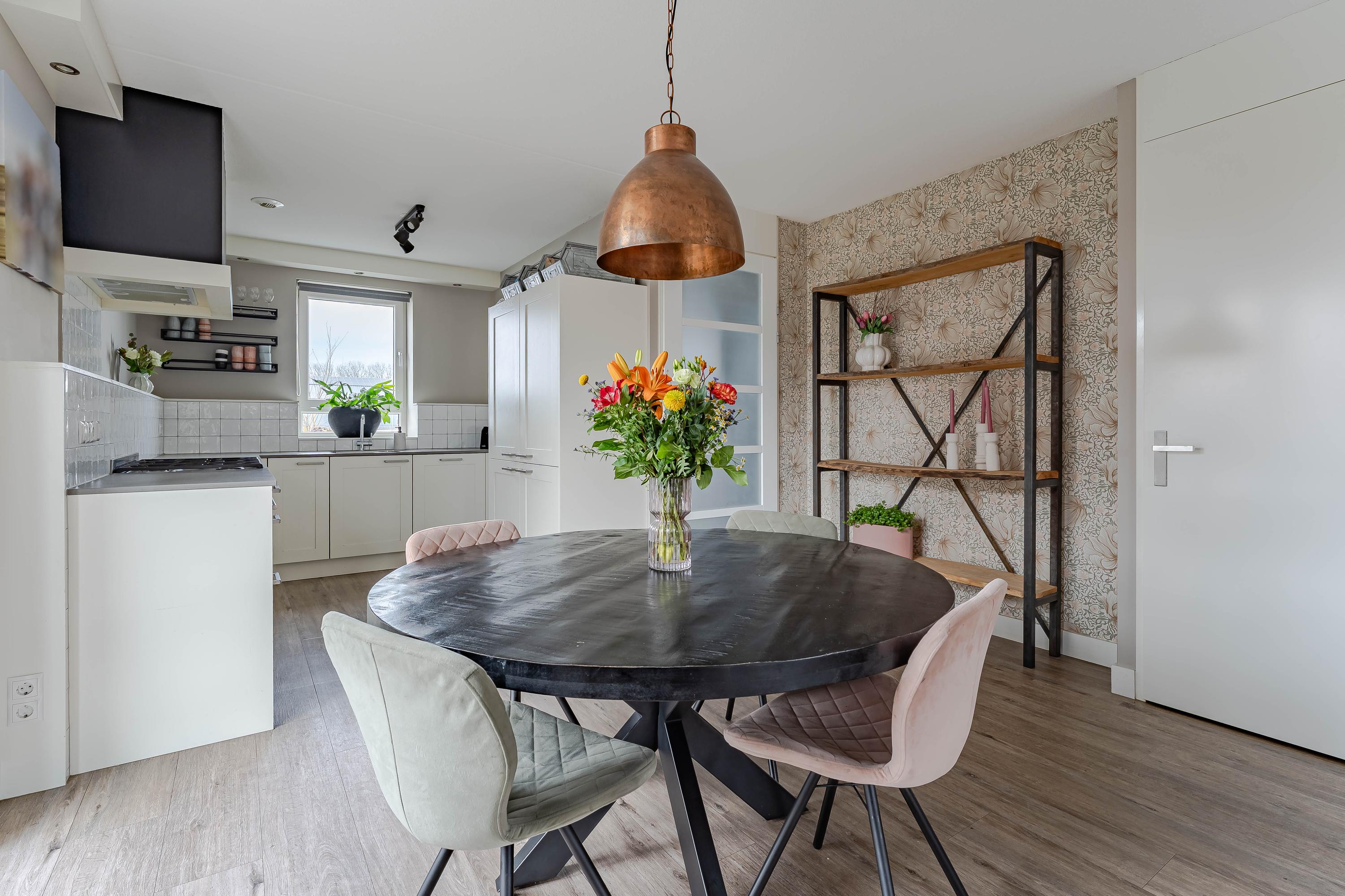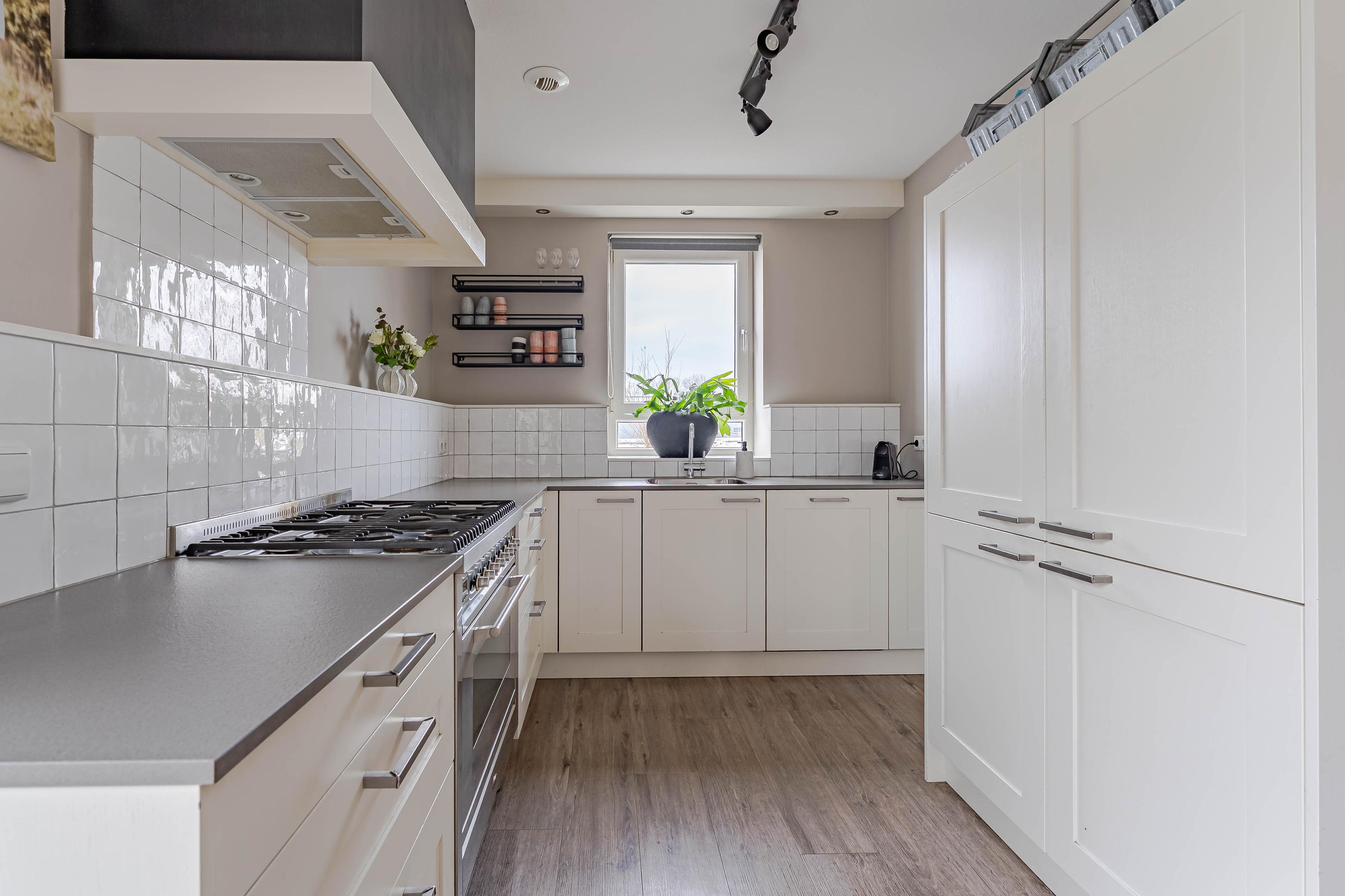 Aan de voorzijde van de woning bevindt zich de open keuken met voldoende werk- en kastruimte. De keuken is compleet uitgerust met een 6-pits gasfornuis van Boretti, een afzuigschouw, een vaatwasser (2025), een koelkast en een vriezer. Het groene uitzicht naar buiten maakt deze keuken tot een heerlijke plek om te koken.
