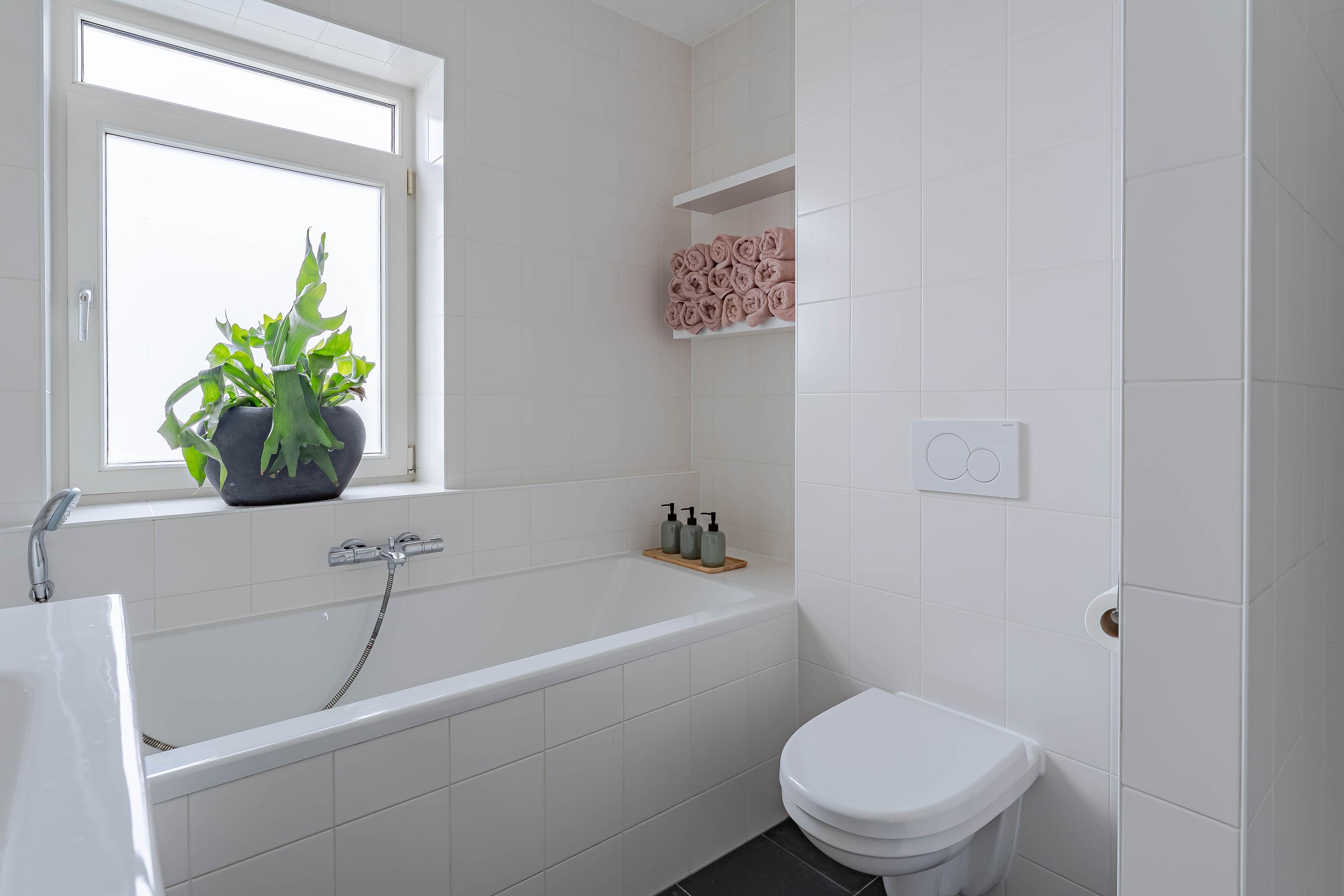 De badkamer is voorzien van een ligbad, douche, wastafel met meubel, kolomkast, een zwevend toilet, een spiegelkast en een radiator.