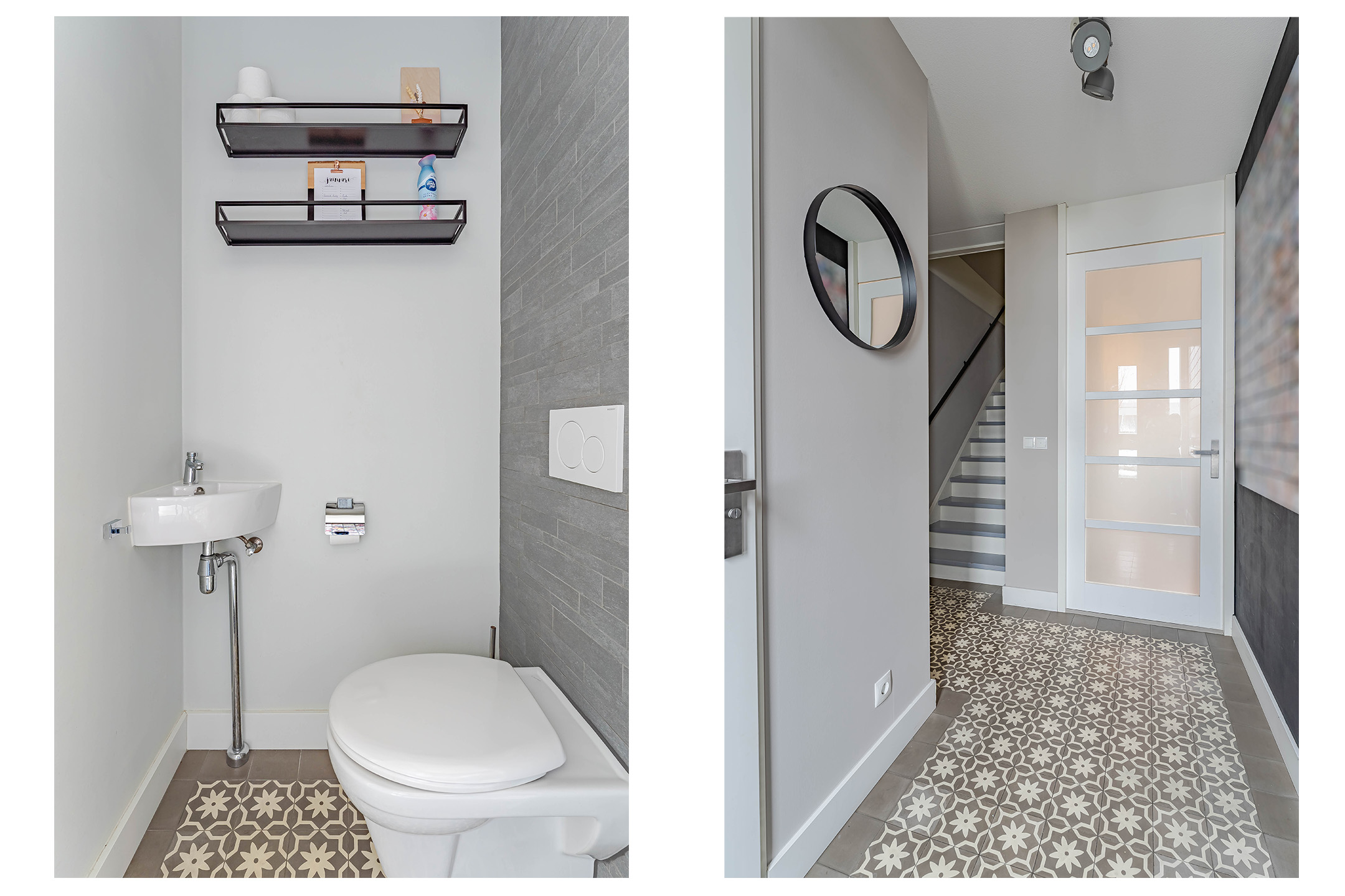 Begane grond: Ruime hal met toegang tot de meterkast, het moderne toilet en de trap naar de eerste verdieping.