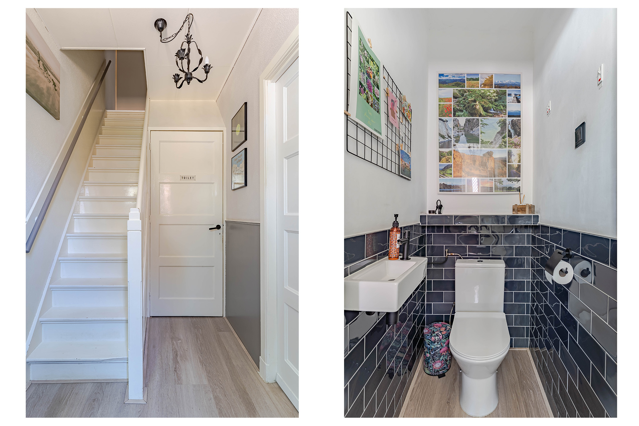 Entree, ruime hal met trapopgang naar de verdieping, toilet met fonteintje en toegang tot de woonkamer.