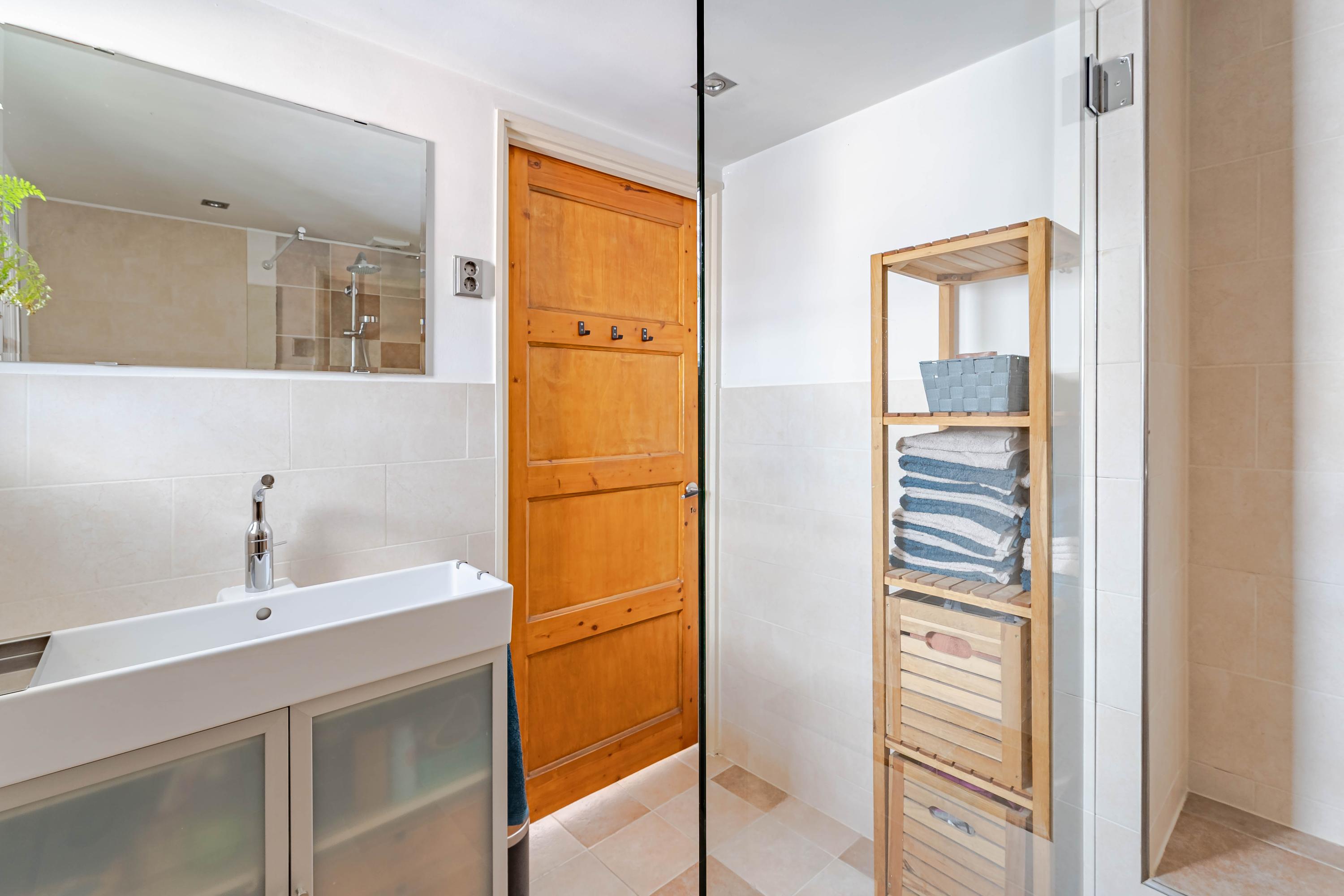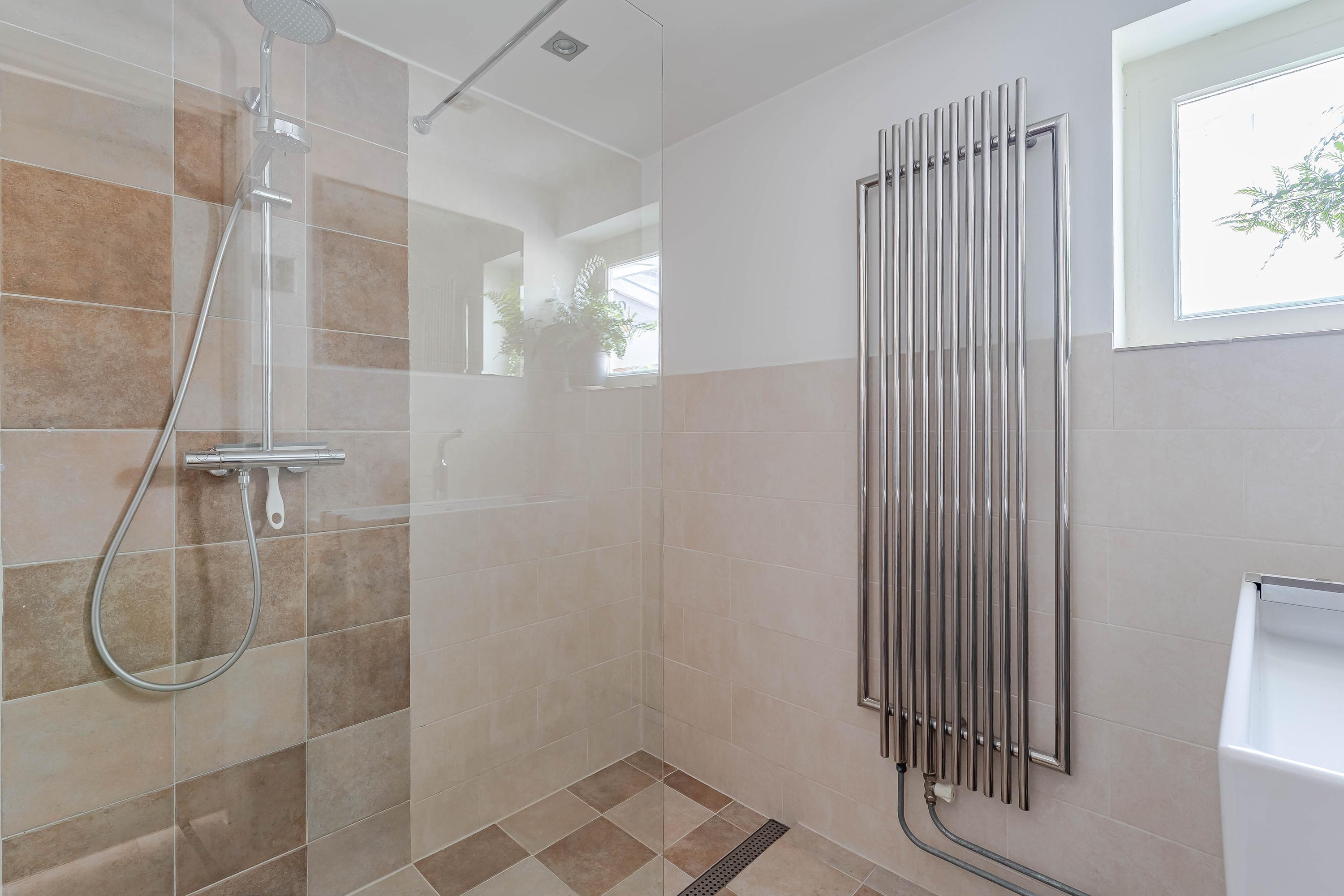 De badkamer bevindt zich op de begane grond is volledig betegeld en ingericht met een inloopdouche, wastafelmeubel en designradiator.
