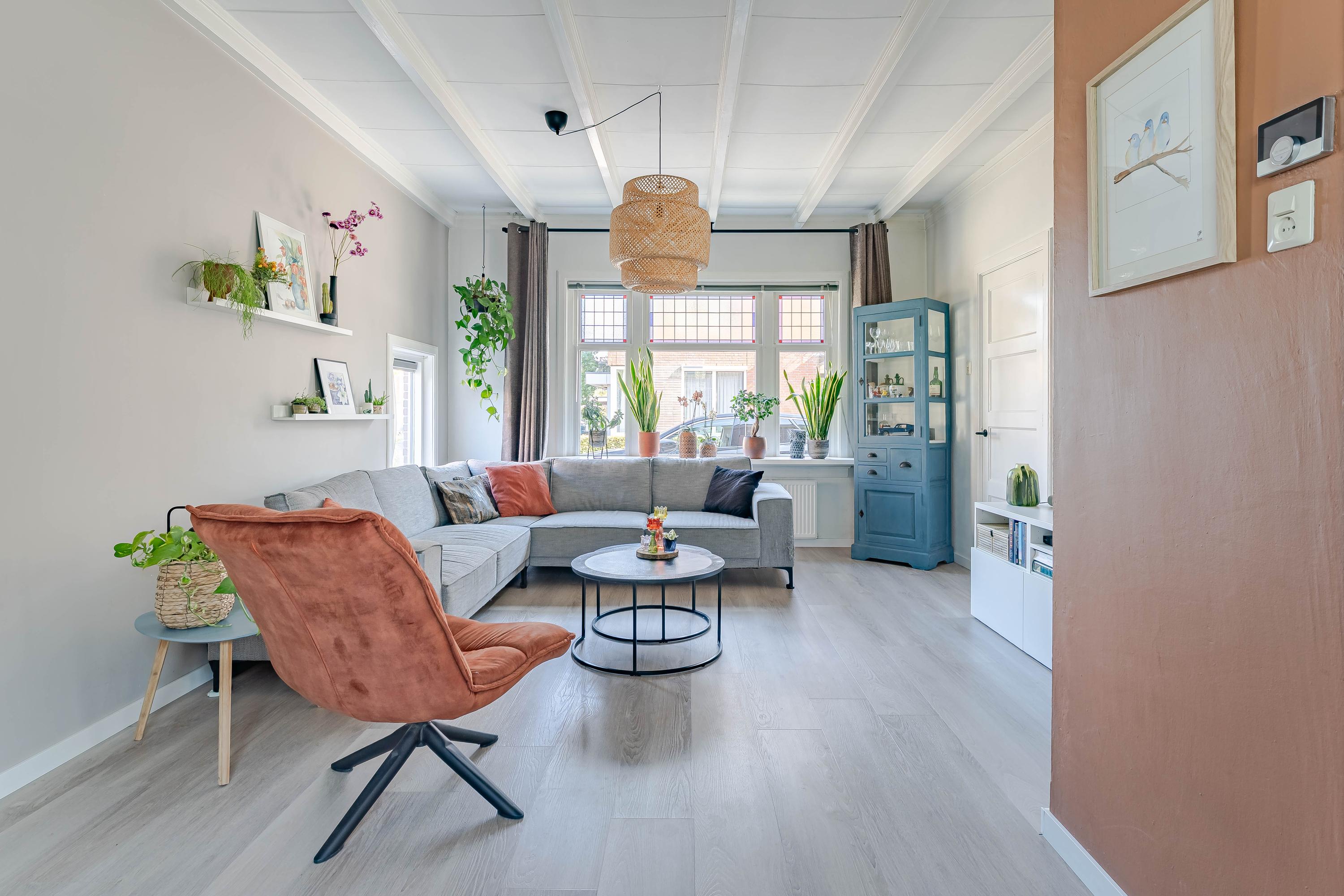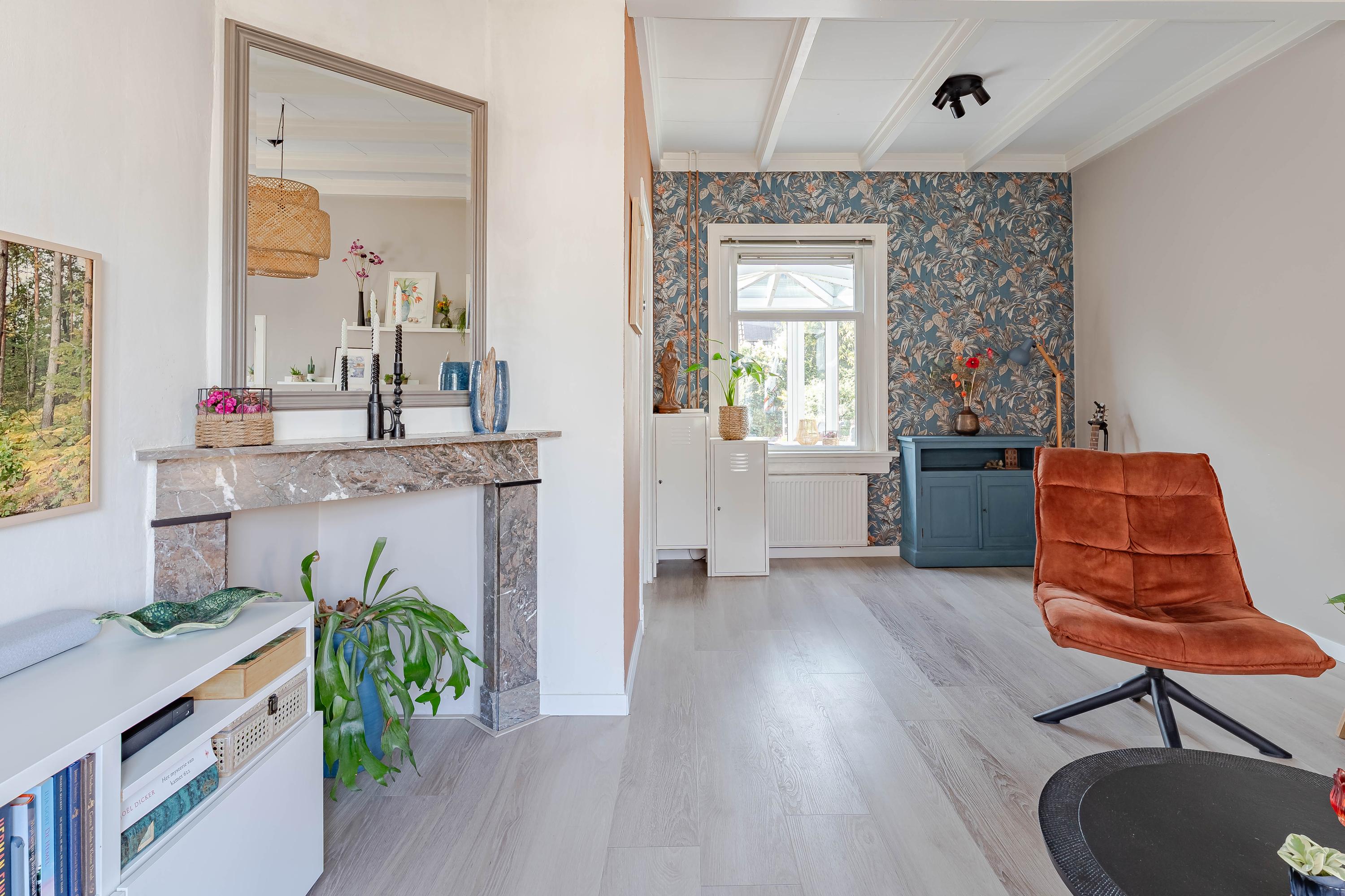 In de sfeervolle woonkamer zie je de jaren ’30 details terug in het balkenplafond, glas in lood en de schouw. De woonkamer is ruim en heeft door het zijraam extra veel lichtinval. De vloer is afgewerkt met PVC en de wanden zijn afgewerkt met stucwerk en behang.