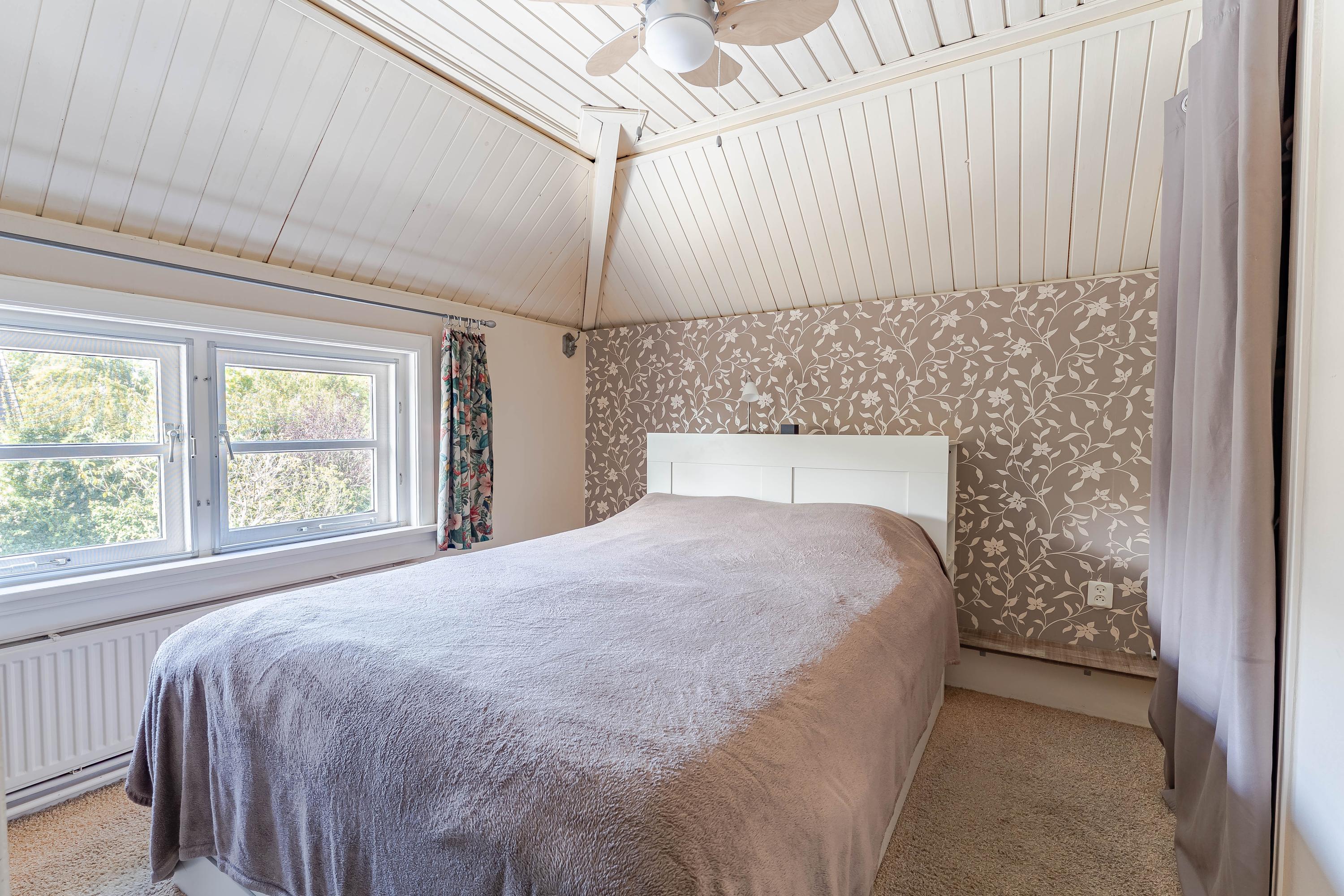 Ruime overloop met voldoende bergruimte, toegang tot de slaapkamers en bergvliering. De slaapkamer aan de achterzijde is voorzien van vloerbedekking en een vaste kast.