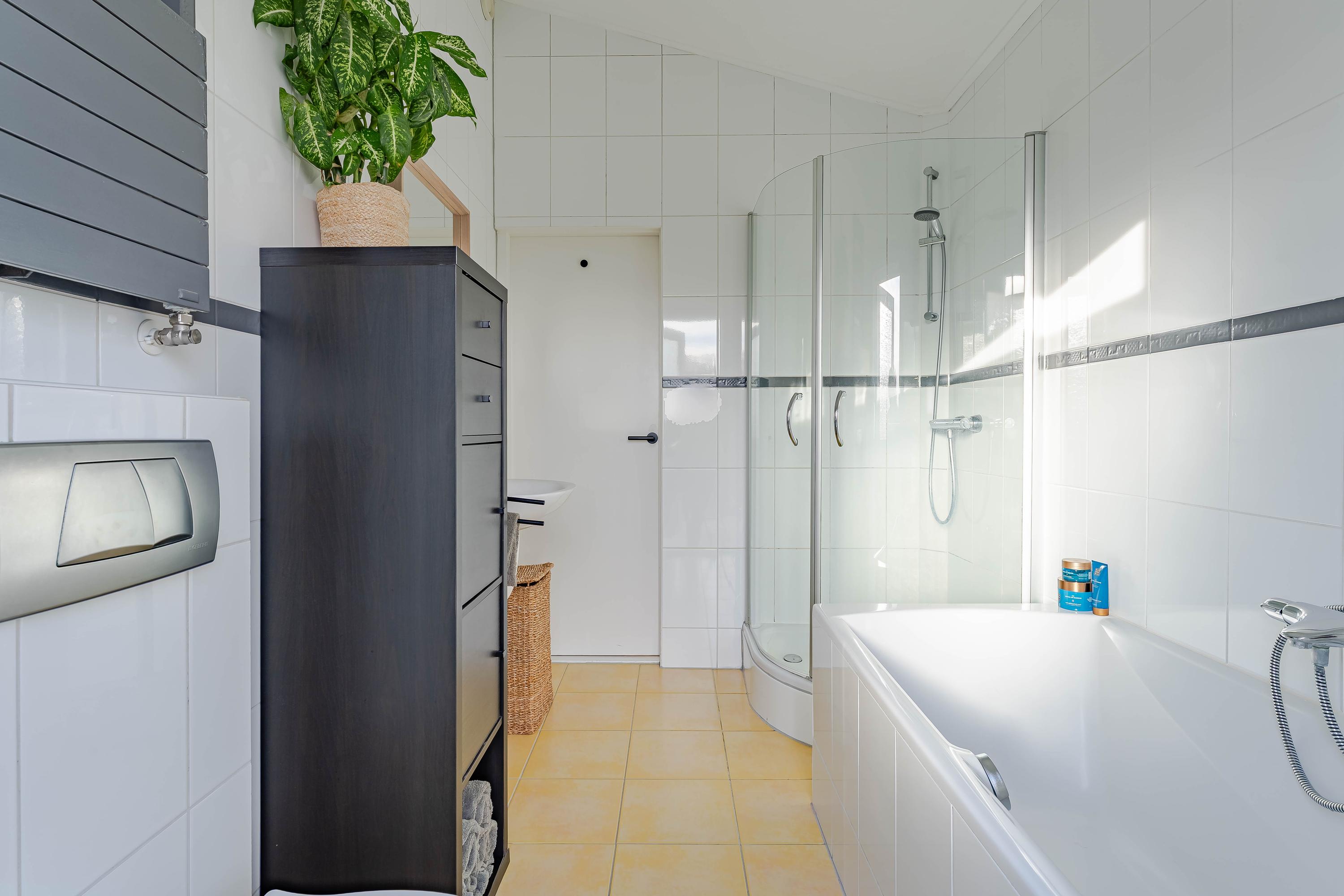 De badkamer is voorzien van een douchecabine, een ligbad, een zwevend toilet en een wastafel. Vanuit de badkamer heeft u toegang tot het dakterras.