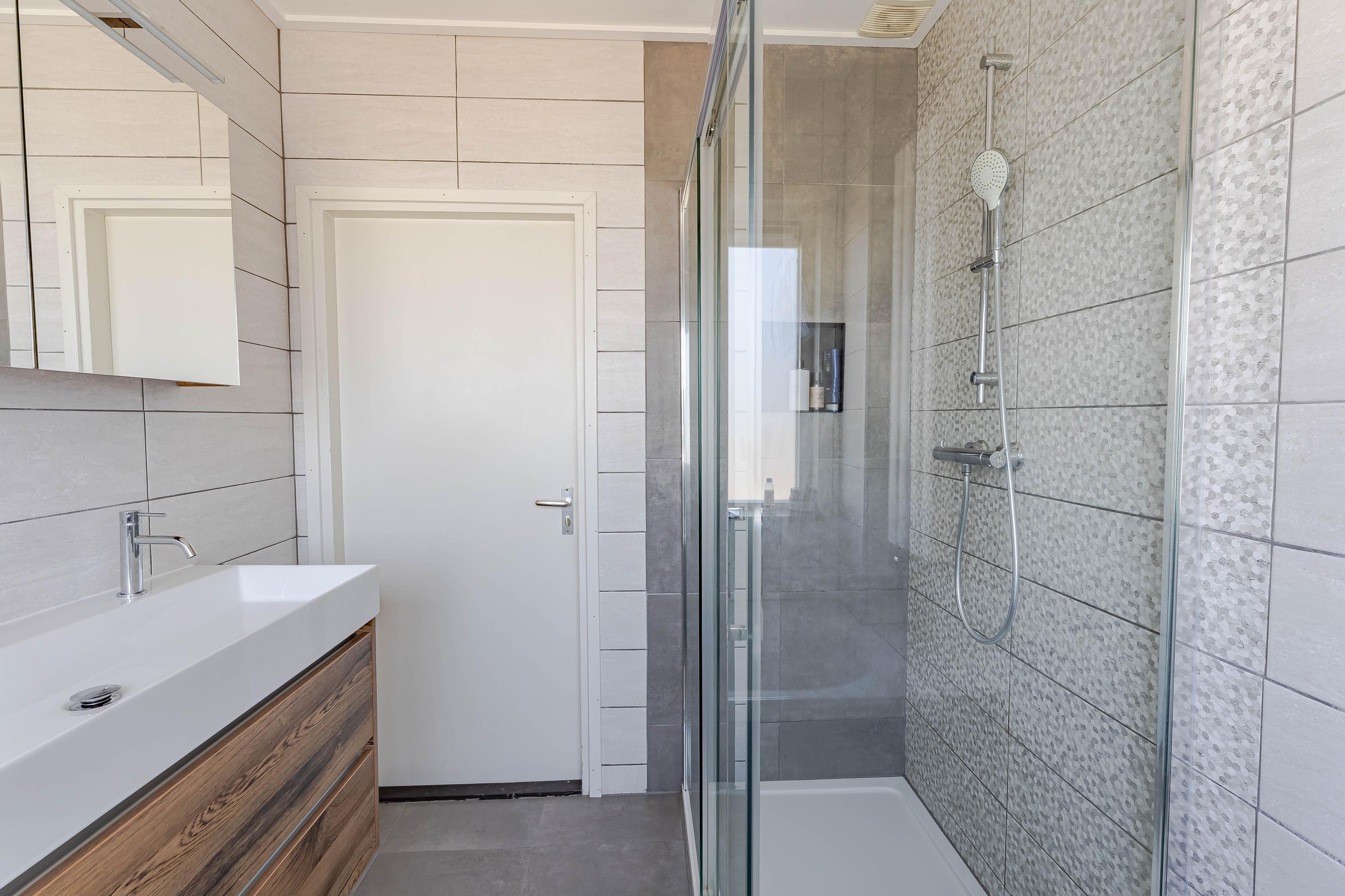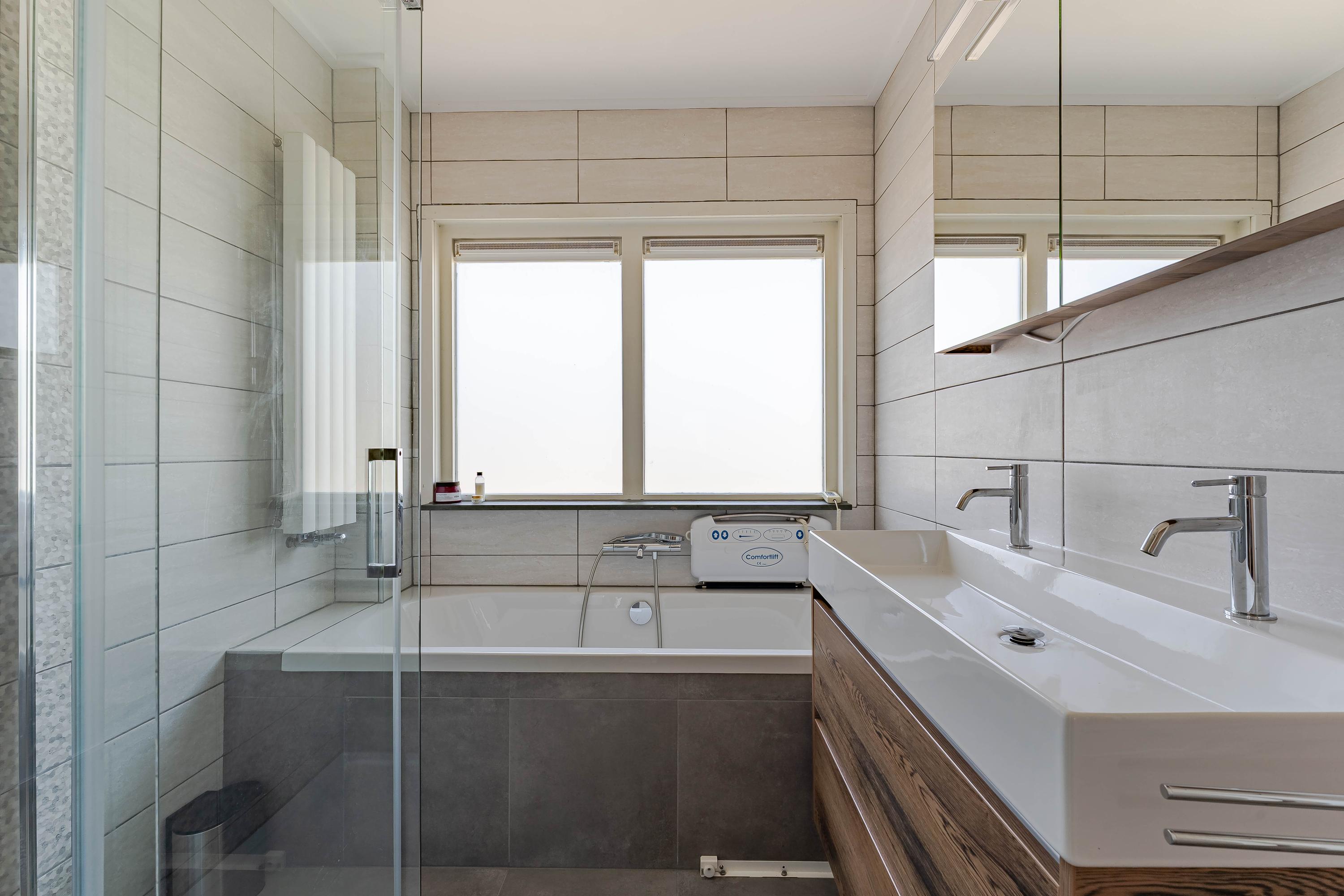 De badkamer is in 2022 volledig vernieuwd en ingericht met een ligbad, inloopdouche en dubbele wastafel. De oude badkamer is nu in gebruik als wasruimte.