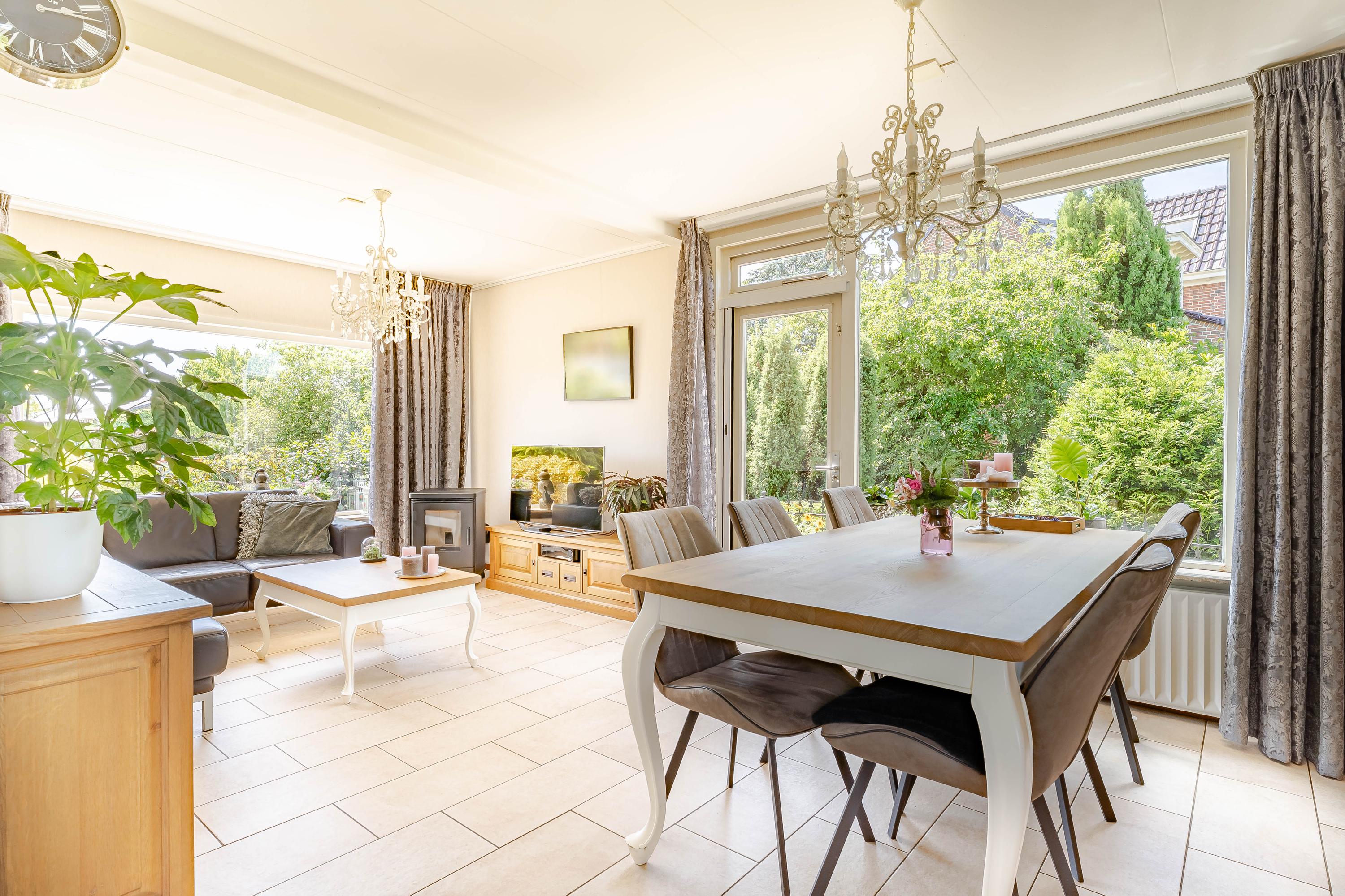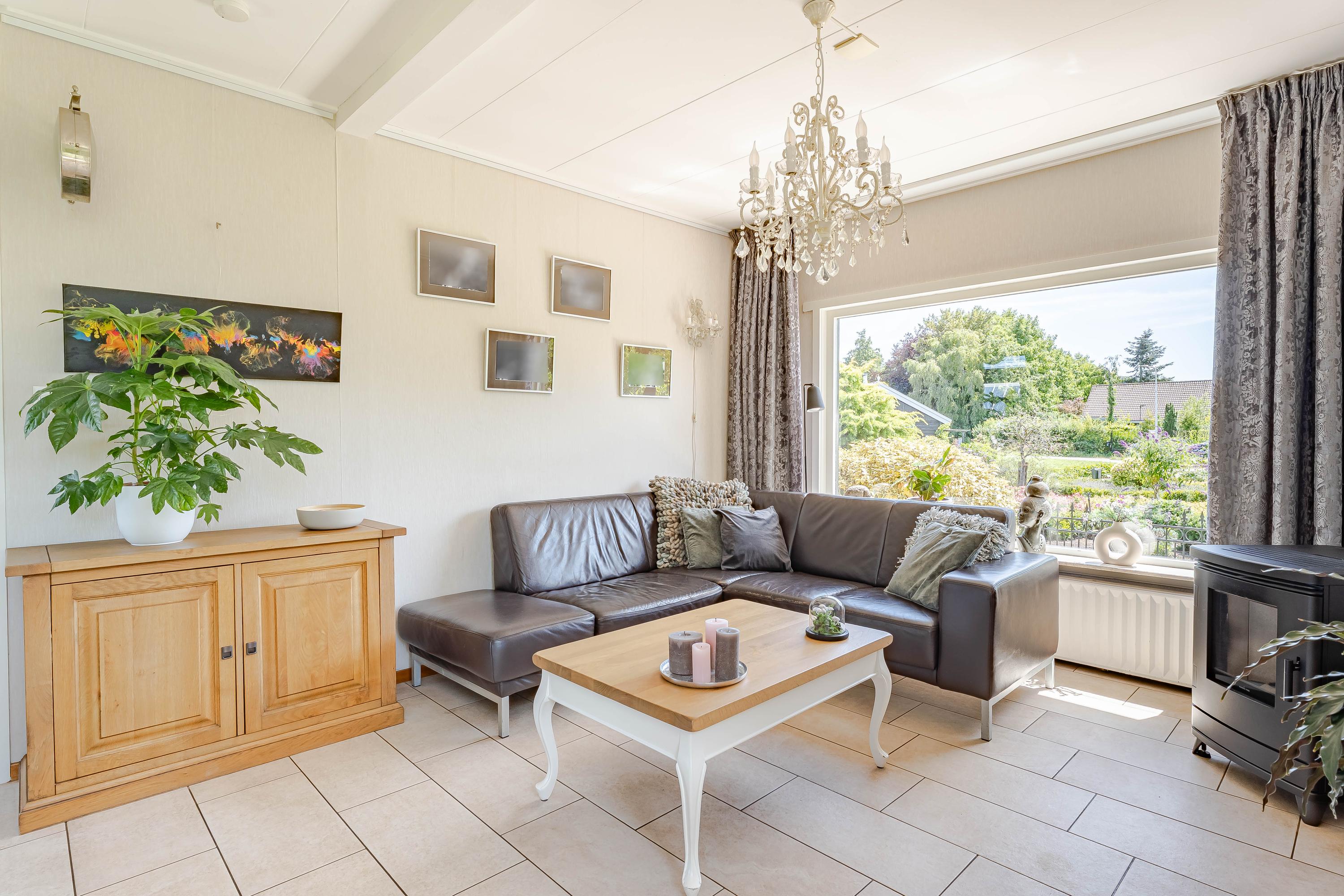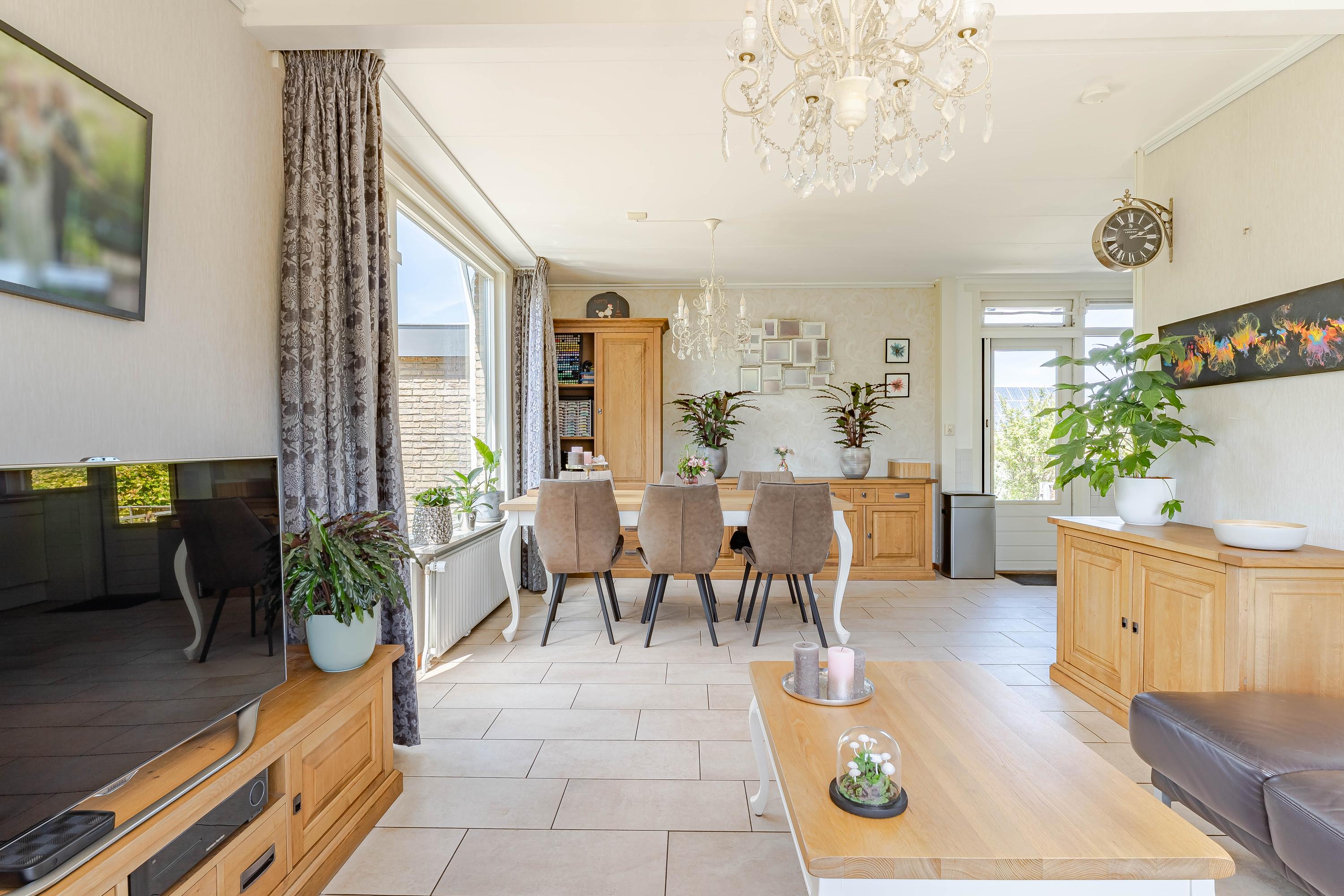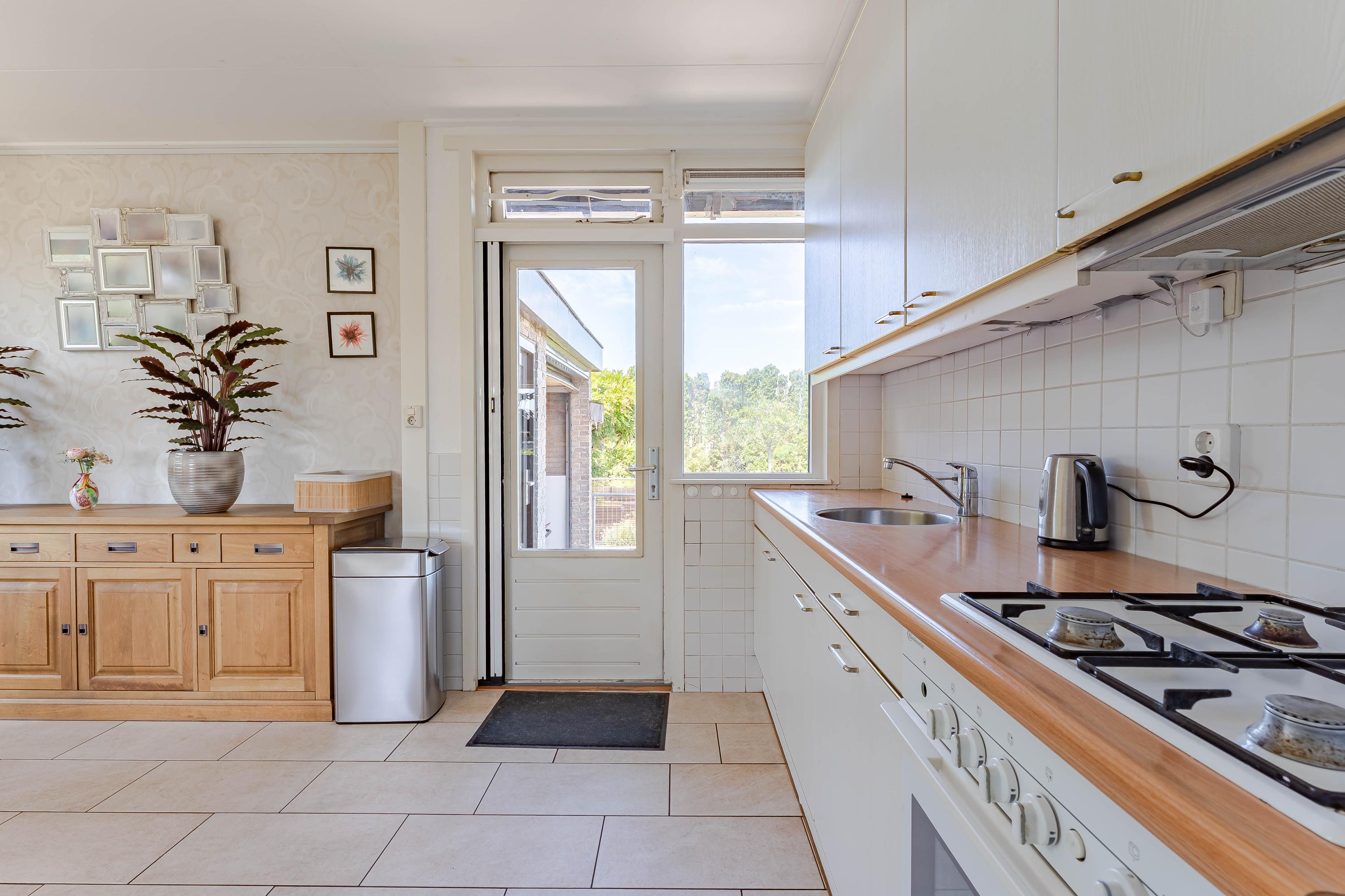 De doorzonwoonkamer is ruim en licht door de ramen aan drie zijden van de woning. Op de gehele begane grond ligt een plavuizen vloer en de wanden zijn voorzien van behang. In de wintermaanden geeft de in 2022 geplaatste pelletkachel (ter overname) extra warmte en sfeer. Vanuit de woonkamer is er toegang tot het terras aan de zijkant van de woning, een heerlijke plek voor een kopje koffie in de ochtend.