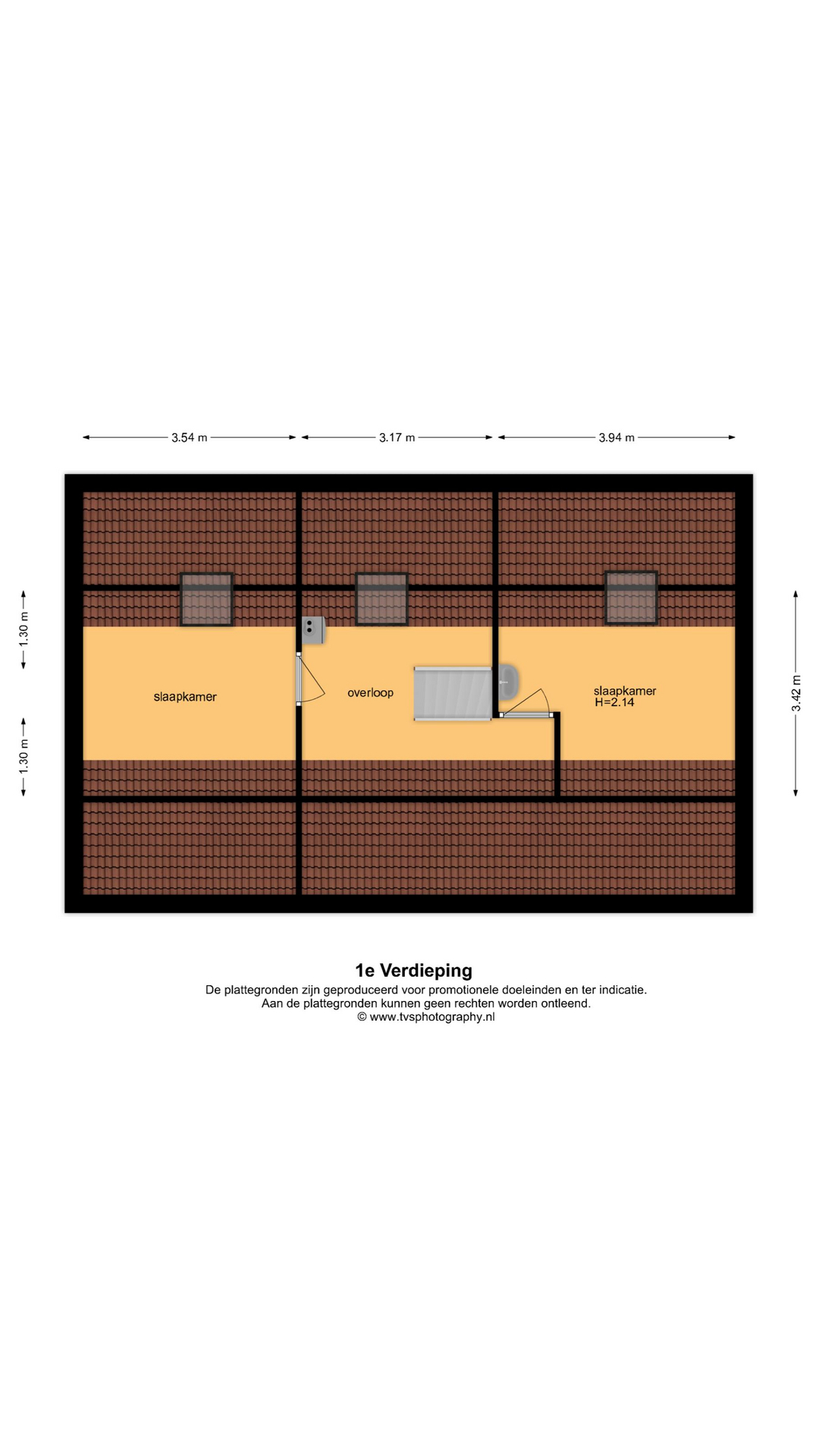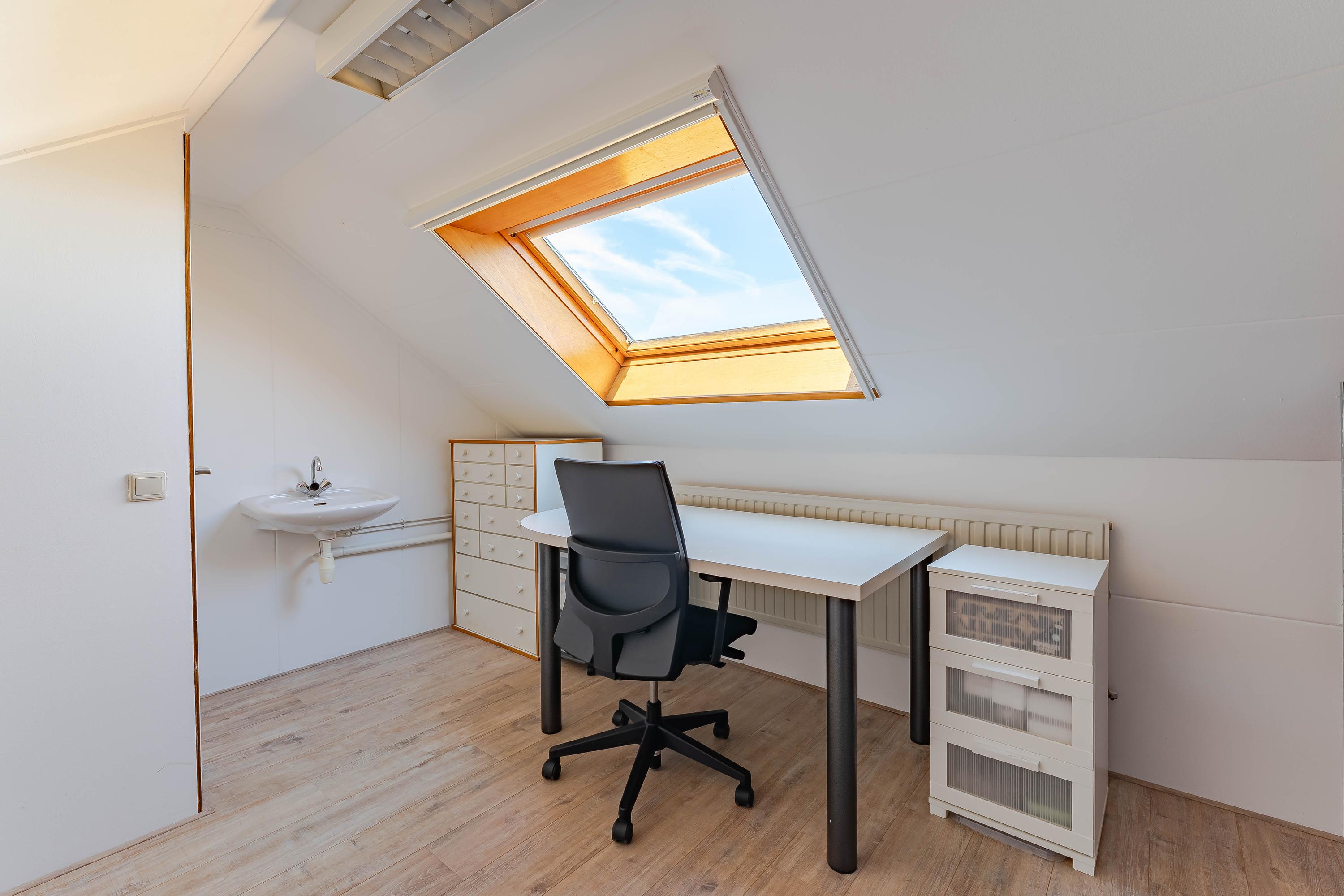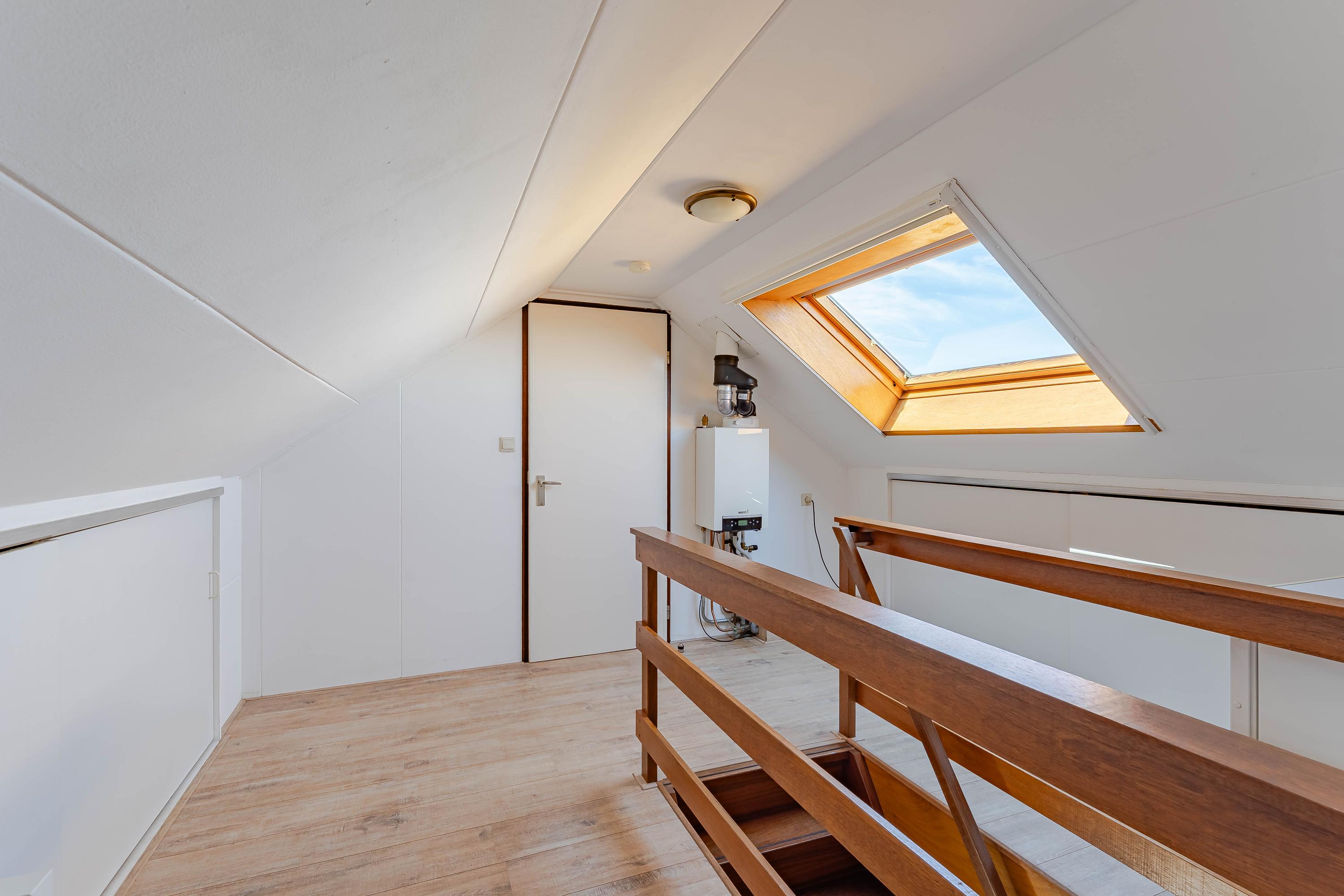 Op de eerste verdieping biedt de ruime overloop voldoende opbergruimte, verder is hier de CV-ketel (Nefit uit 2009) opgesteld. Er zijn twee slaapkamers, beiden voorzien van een groot dakraam; één daarvan beschikt ook over een wastafel.