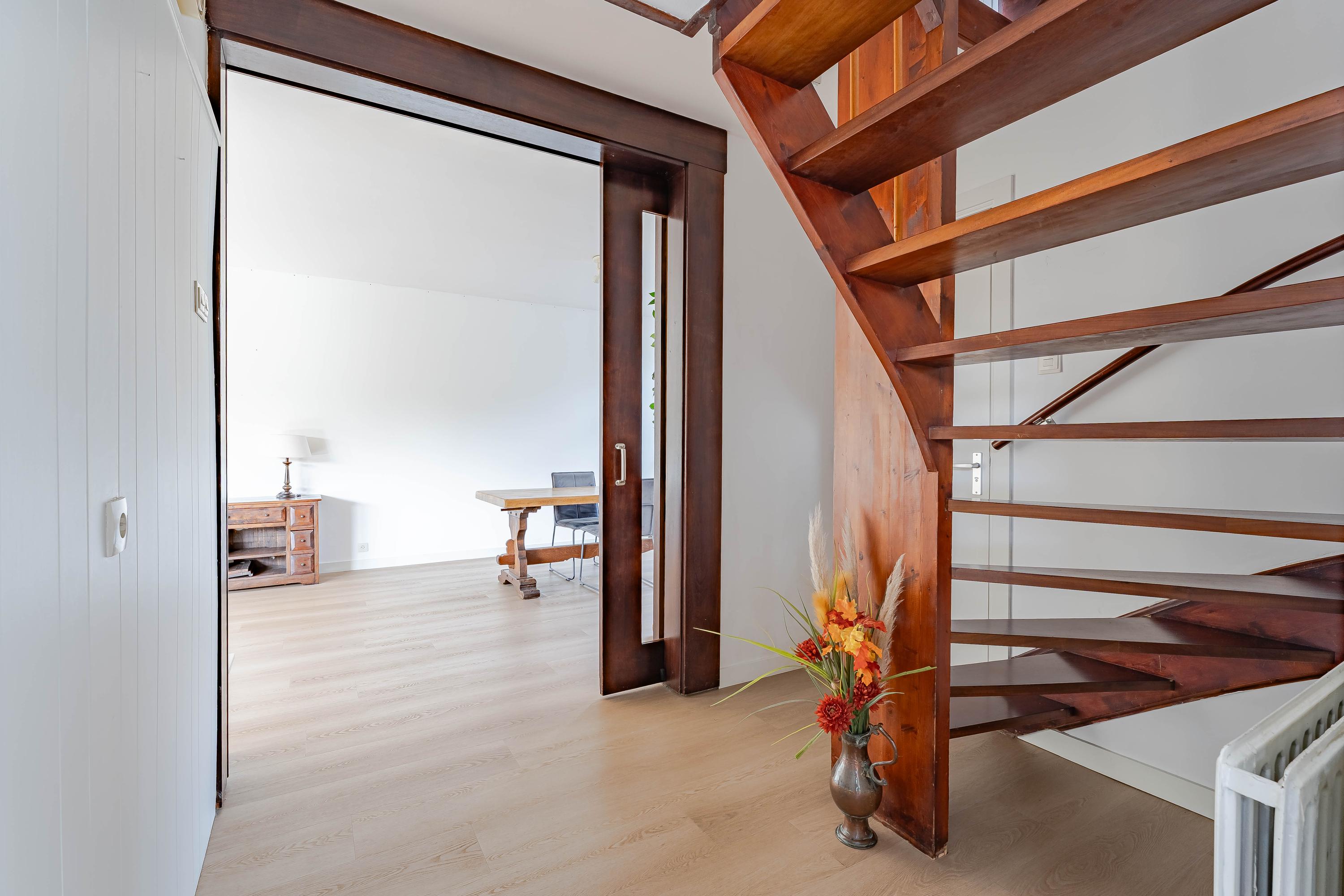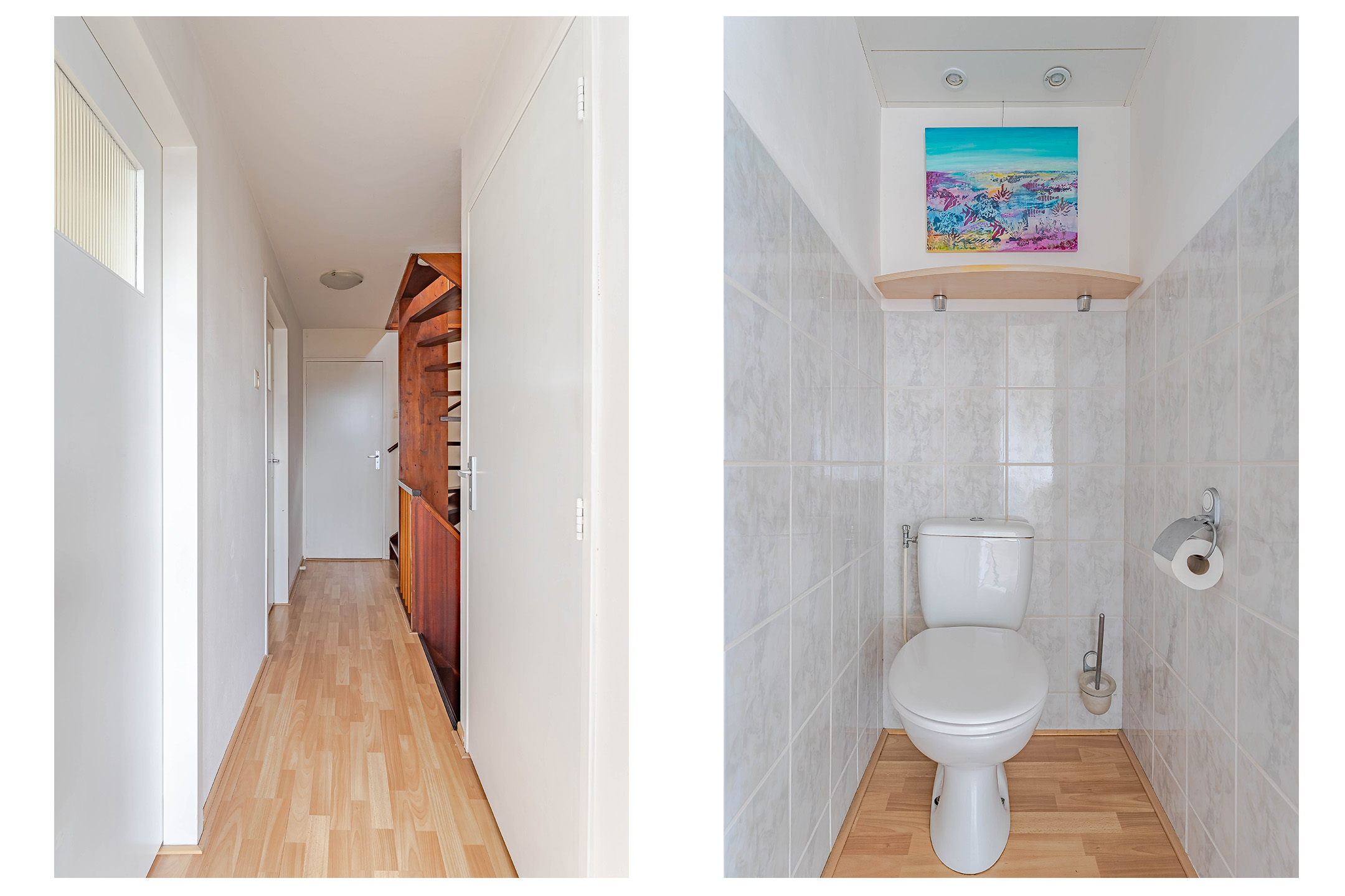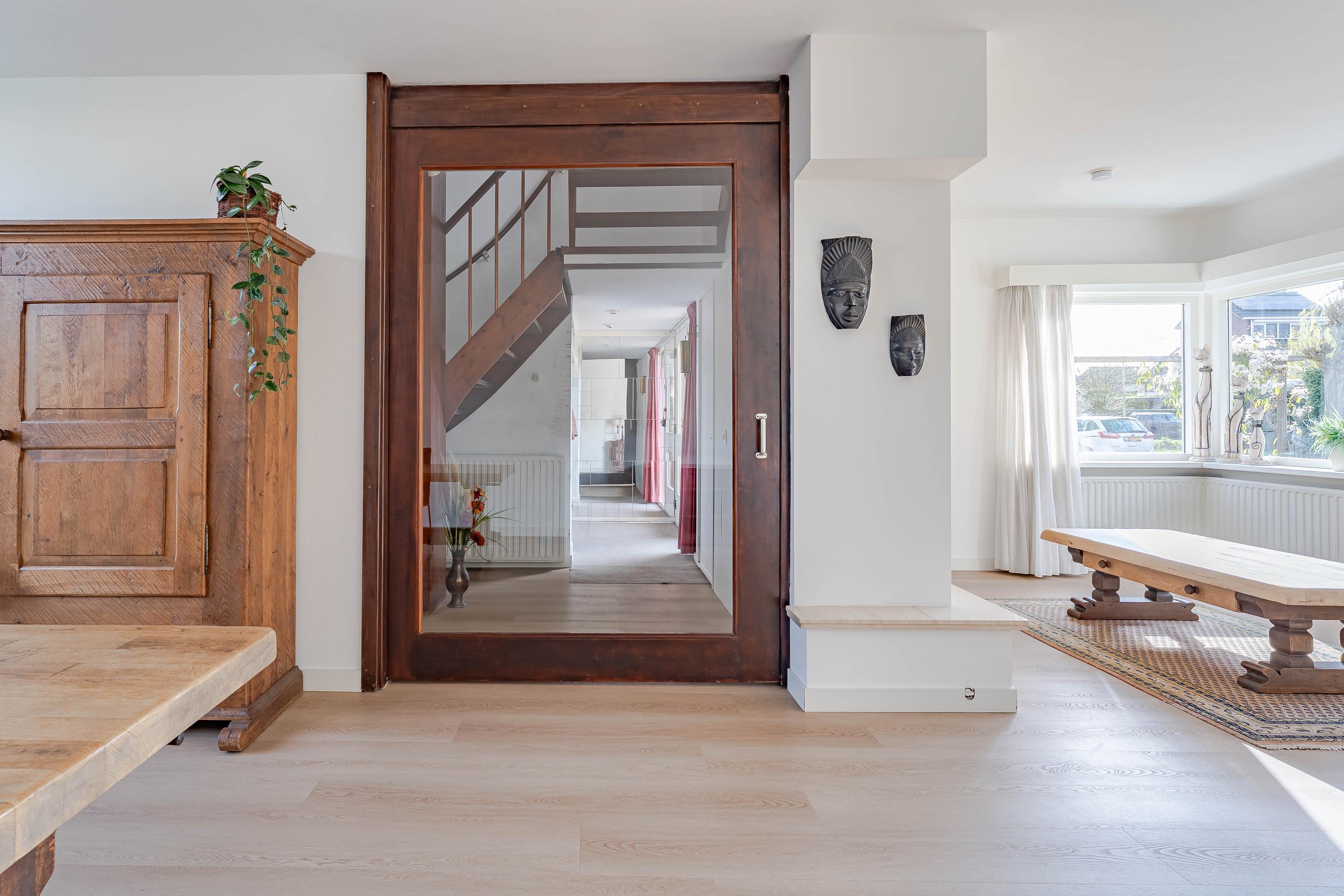 Via de oprit en ruime voortuin bereikt u de royale entree met garderobe, vernieuwde meterkast, toiletruimte met zwevend closet en fonteintje, trapopgang naar de eerste verdieping en toegang tot de woonkamer en de halfopen keuken. De entree en woonkamer zijn gescheiden door middel van een prachtige glazen schuifpui, die voor veel extra lichtinval zorgt en een ruimtelijk effect creëert.