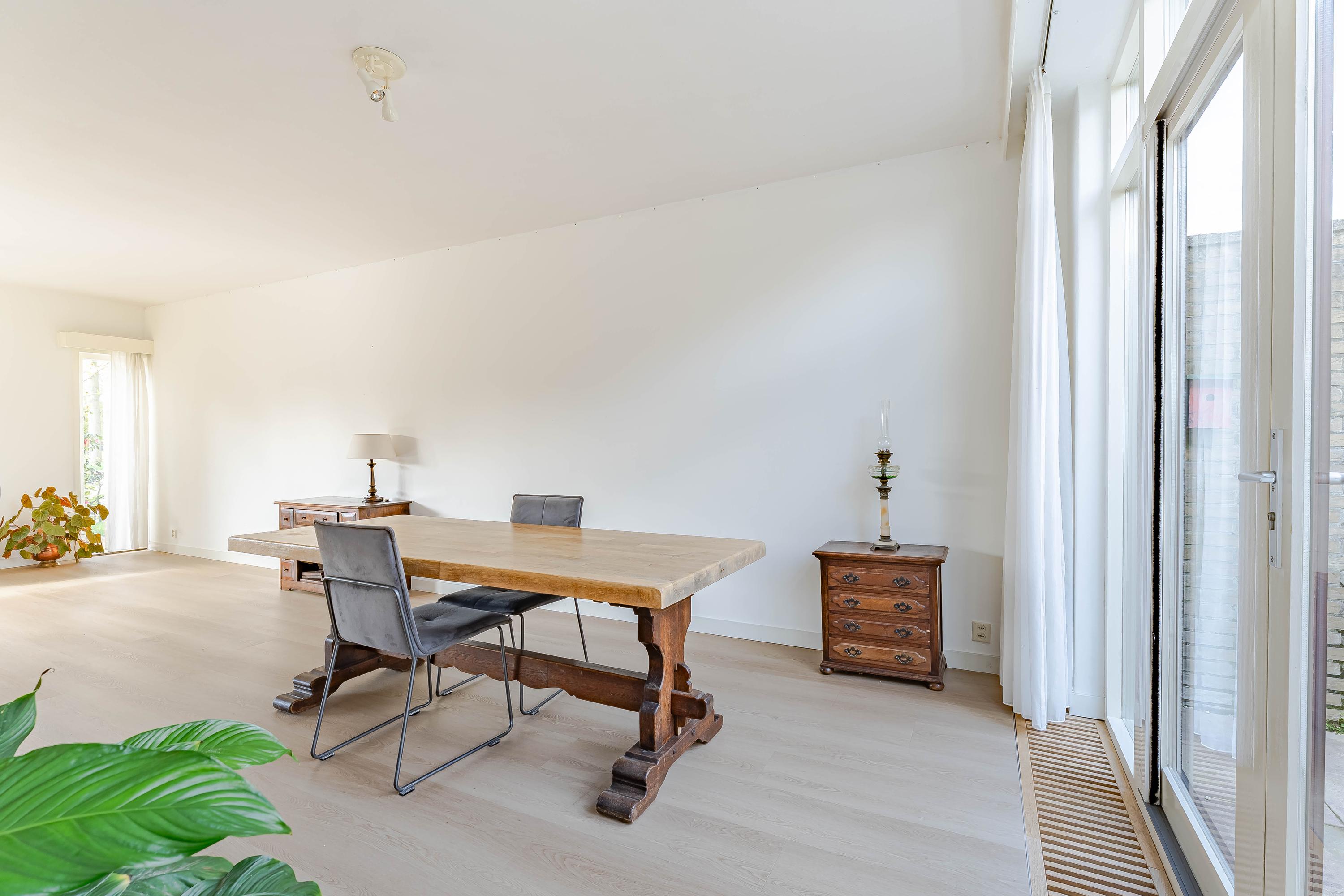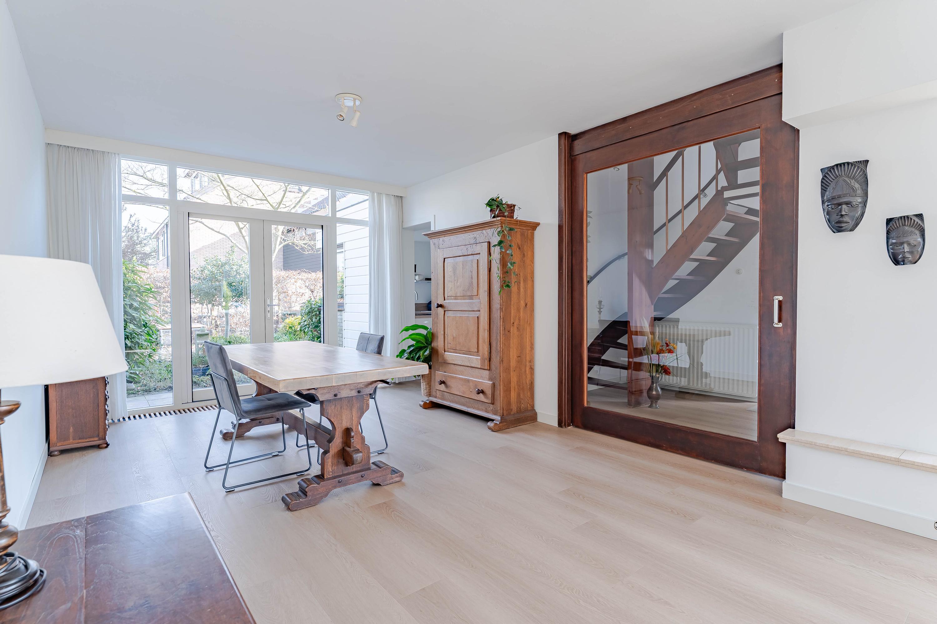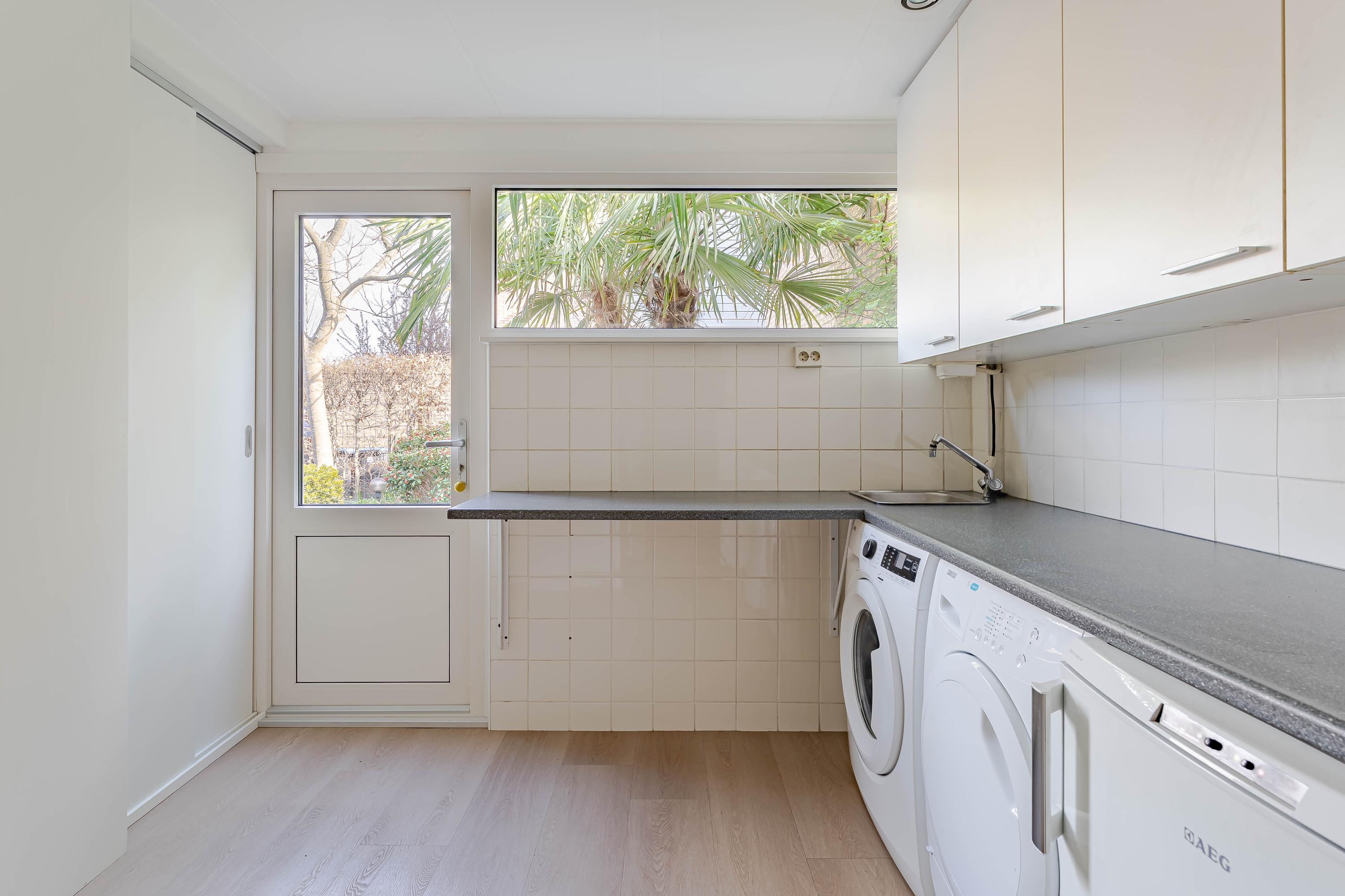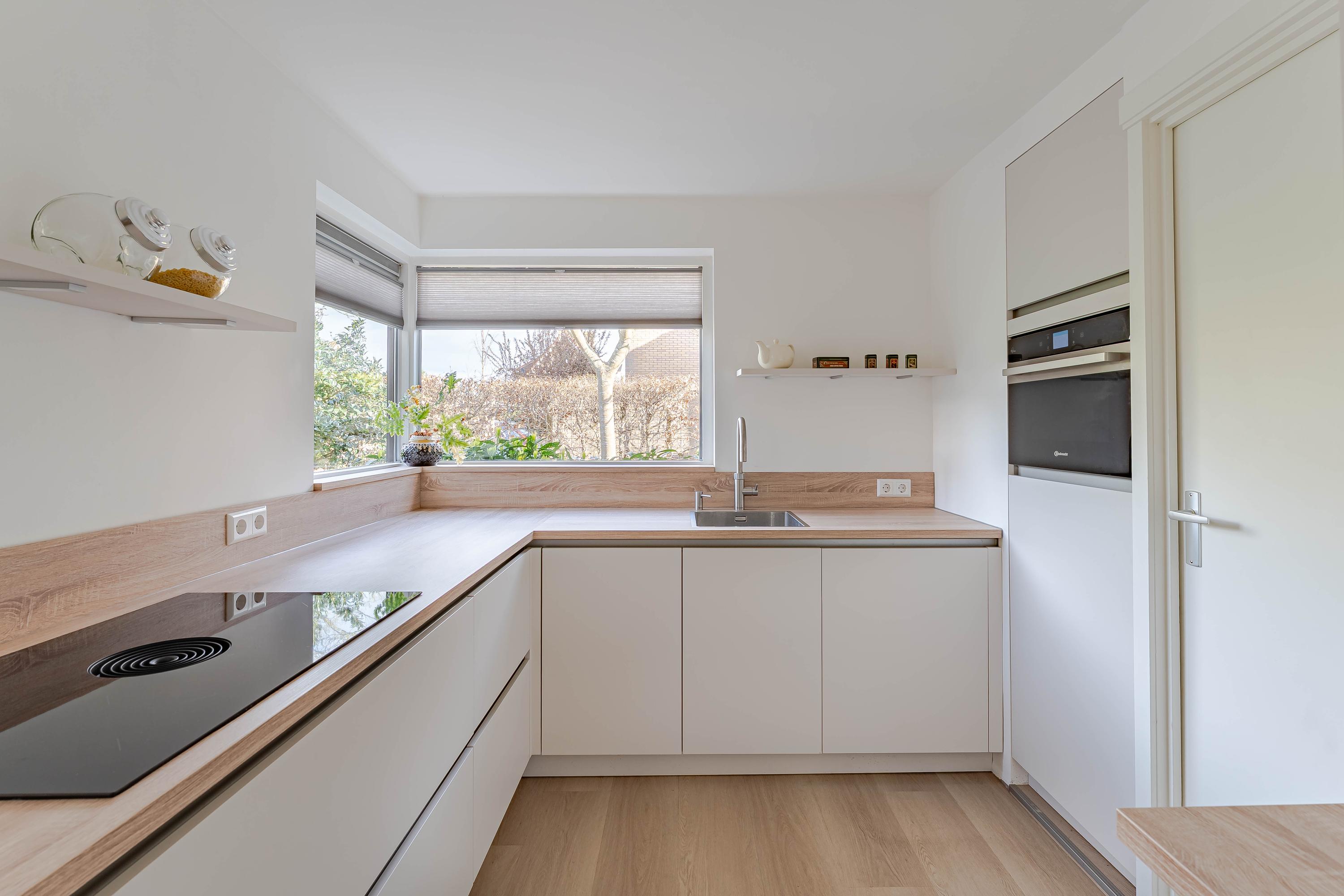 Aan de achterzijde van de woonkamer is er ruimte voor een gezellige eethoek. Hier kunt u heerlijk dineren met een grote groep vrienden/familie. De openslaande deuren zorgen voor directe toegang naar de achtertuin. De keuken is in 2023 vernieuwd, heeft een moderne en tijdloze uitstraling en is voorzien van luxe inbouwapparatuur. Er is een combioven, koelkast, Quooker en een 4-pits inductiekookplaat met geïntegreerde afzuiging van het merk BORA geplaatst. Aansluitend aan de keuken vindt u de bijkeuken, voorzien van een praktische aansluiting voor wasapparatuur en ruimte voor een vriezer. In deze ruimte staat ook een compact keukenblok met een elektrische boiler voor het warm water. Dezelfde stijlvolle PVC-vloer die in de woonkamer en keuken ligt, is hier doorgelegd, waardoor een uniforme uitstraling ontstaat. Vanuit de bijkeuken heeft u direct toegang tot de berging en, via de kunststof loopdeur, tot de achtertuin.