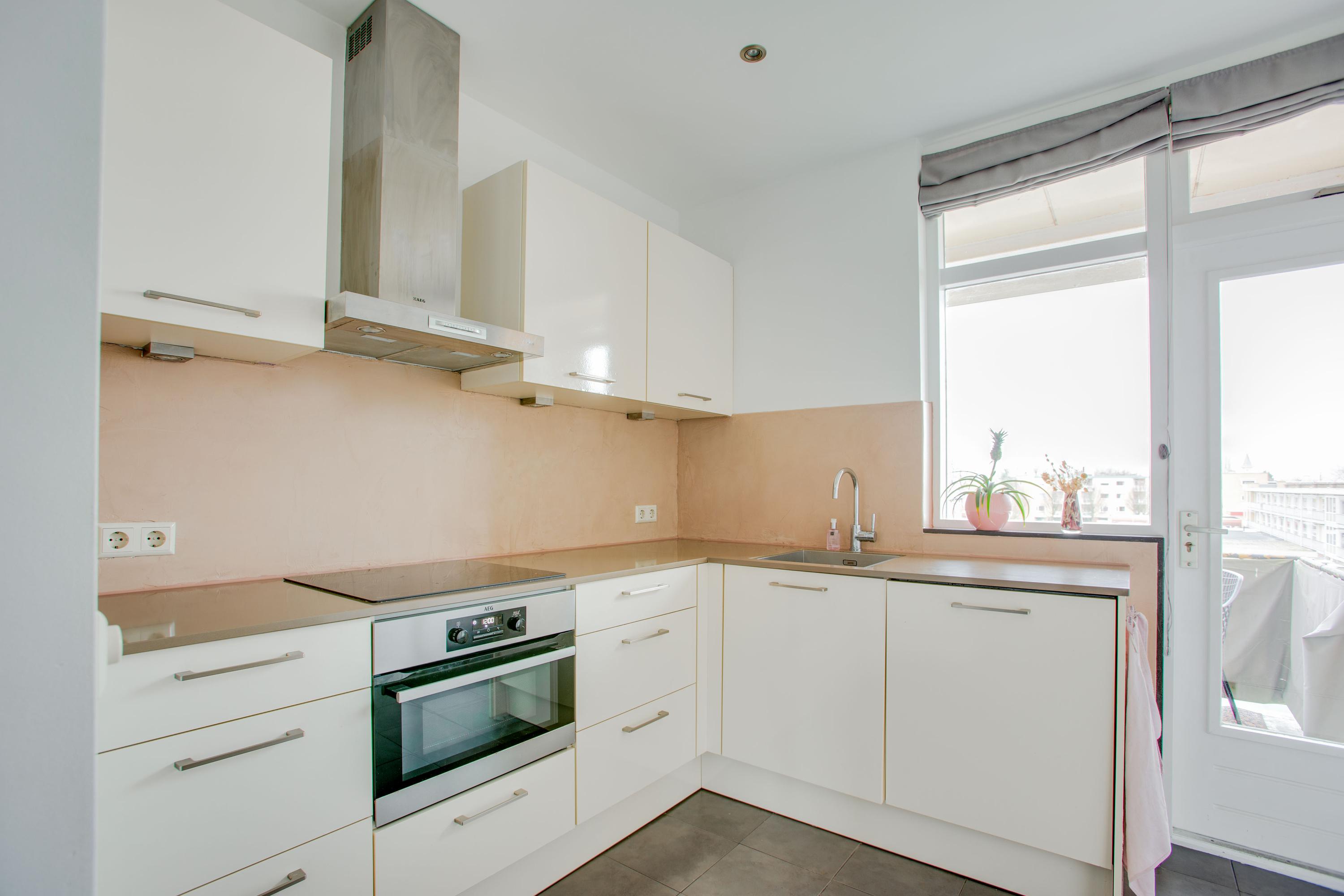 De dichte keuken heeft een hoekopstelling en is ingericht met een 4-pits inductiekookplaat, afzuiging, koelkast, vriezer, combioven en een vaatwasser. Het aanrecht is voorzien van een stenen blad, er is voldoende bergruimte in de kasten. De keuken wordt verwarmd door middel van elektrische vloerverwarming. Een loopdeur biedt toegang tot het tweede balkon, waar u nog een tuinkast aantreft. In deze kast is de boiler (eigendom, bj. 2016) opgesteld.