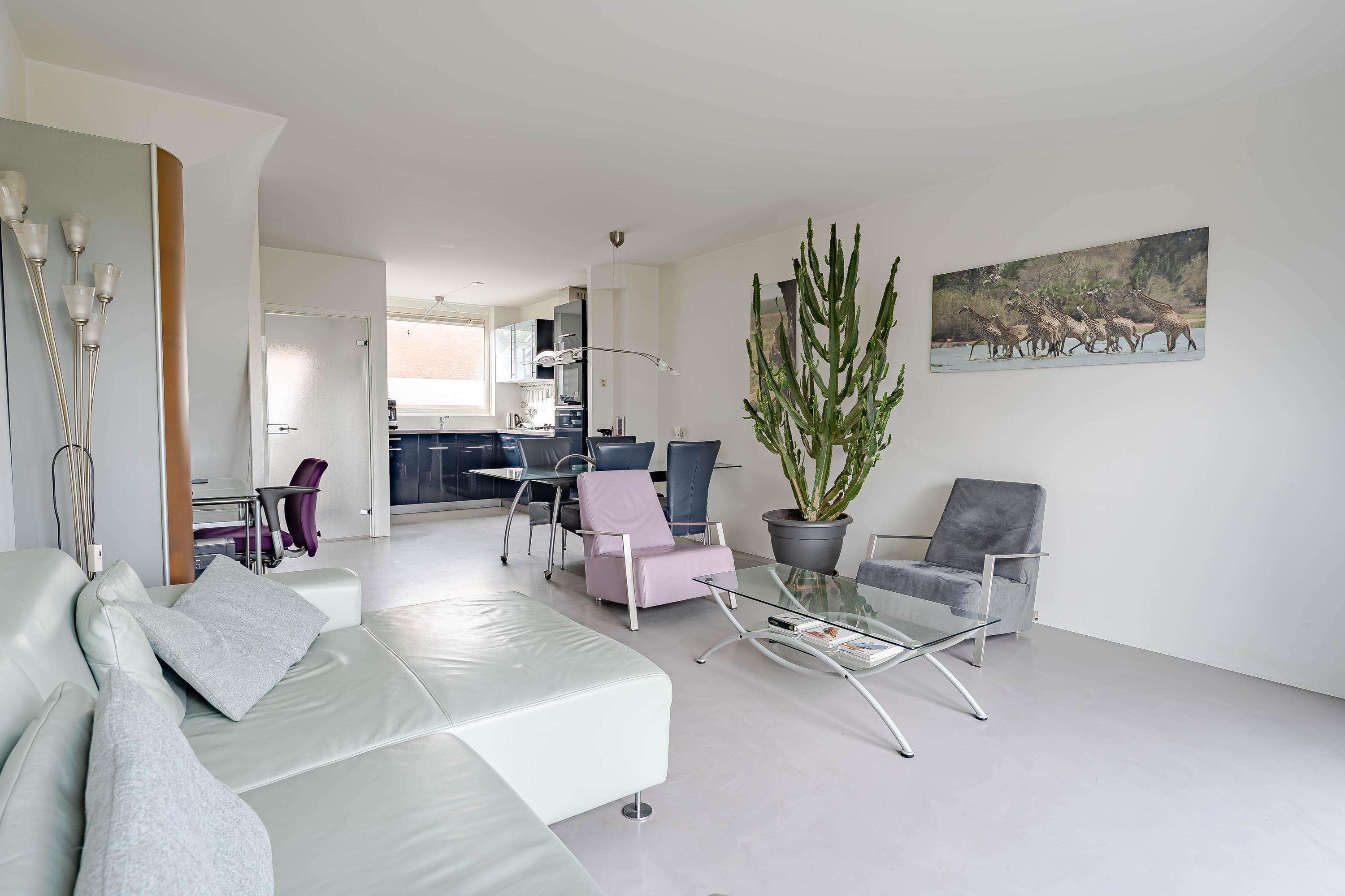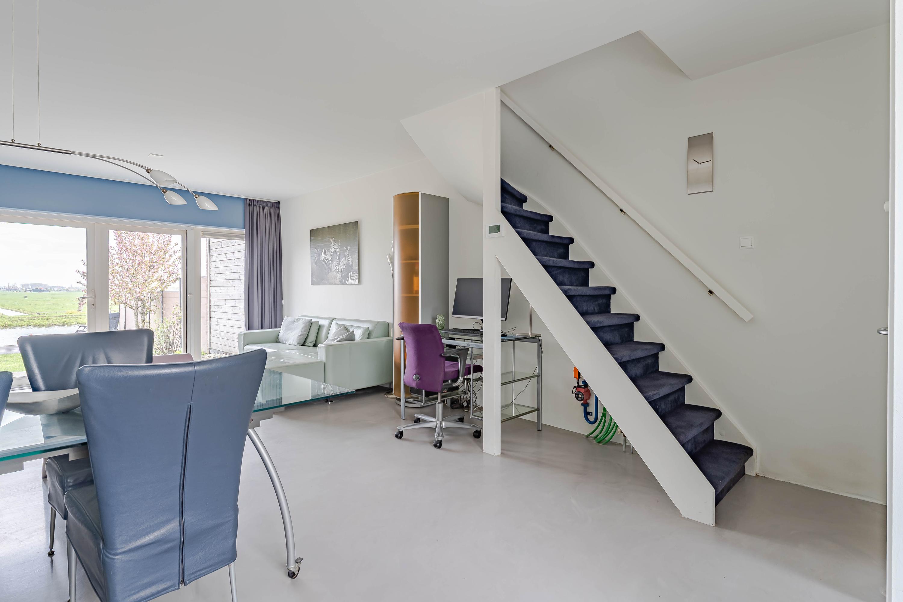 De woonkamer heeft veel lichtinval door de openslaande deuren. Het vrije uitzicht is prachtig en verveeld nooit! De begane grondvloer is voorzien van vloerverwarming en afgewerkt met een gietvloer. De wanden zijn glad gestuct. Vanuit de woonkamer is er toegang tot de eerste verdieping.