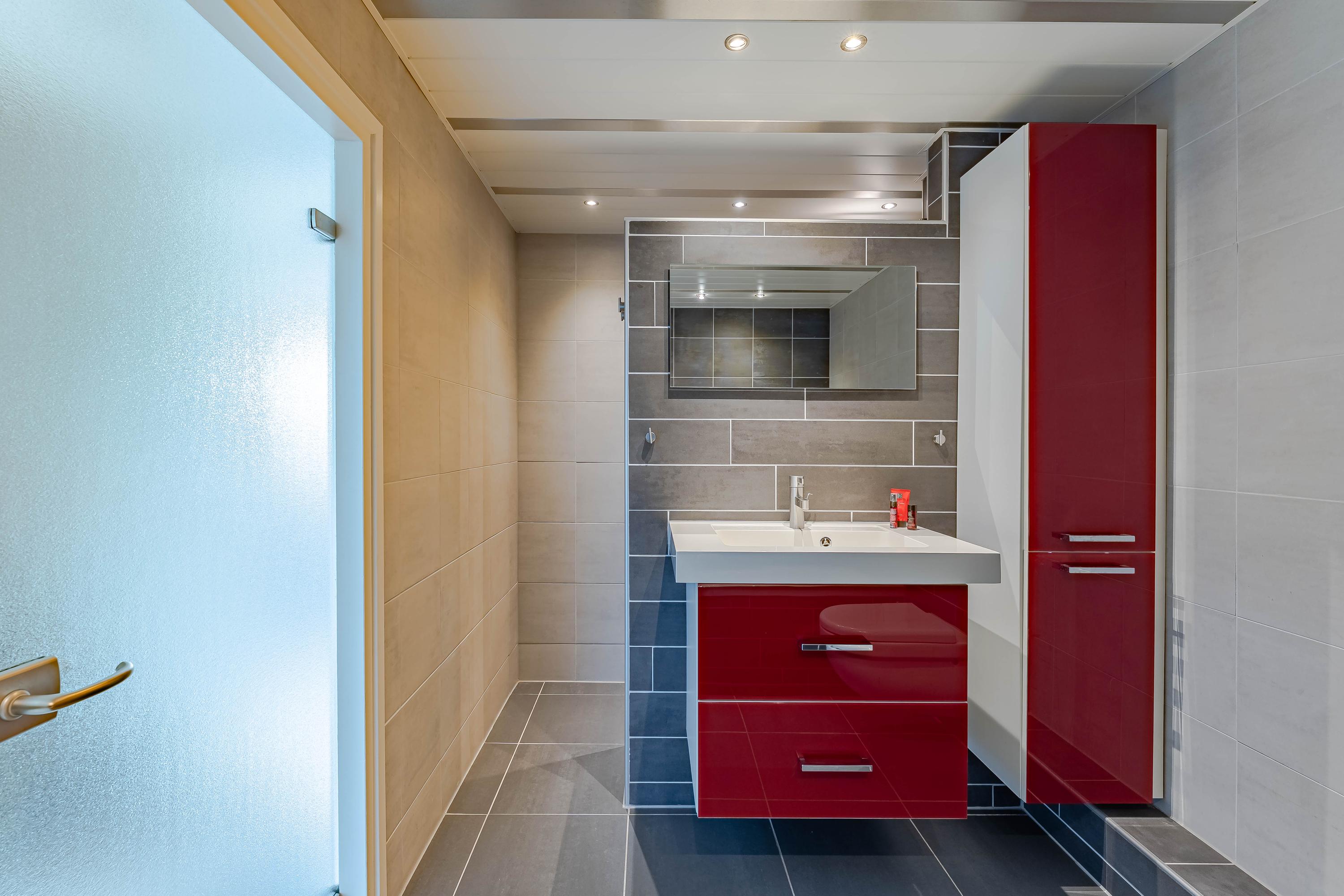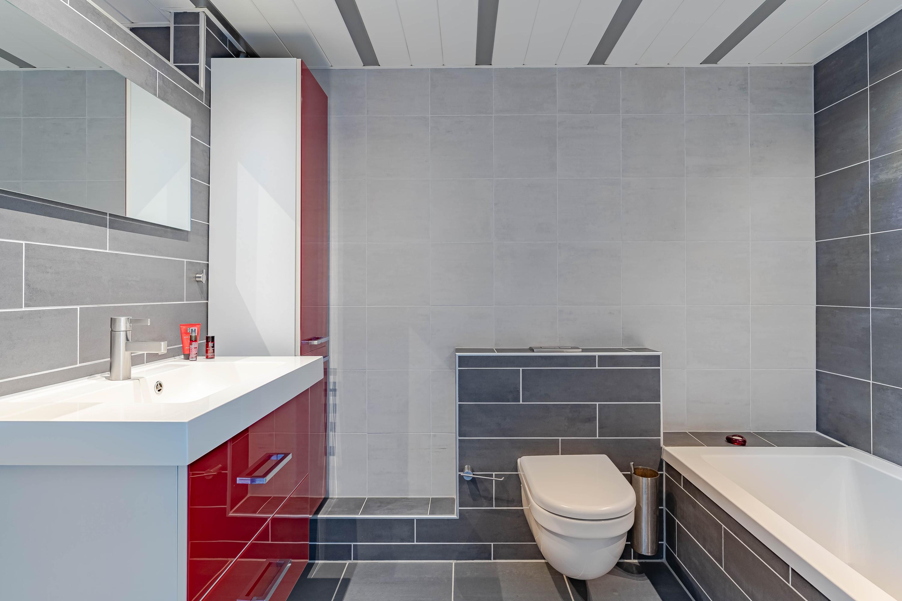 De badkamer is volledig betegeld en ingericht met een inloopdouche, ligbad, toilet en wastafelmeubel, ook de badkamer is voorzien van vloerverwarming.