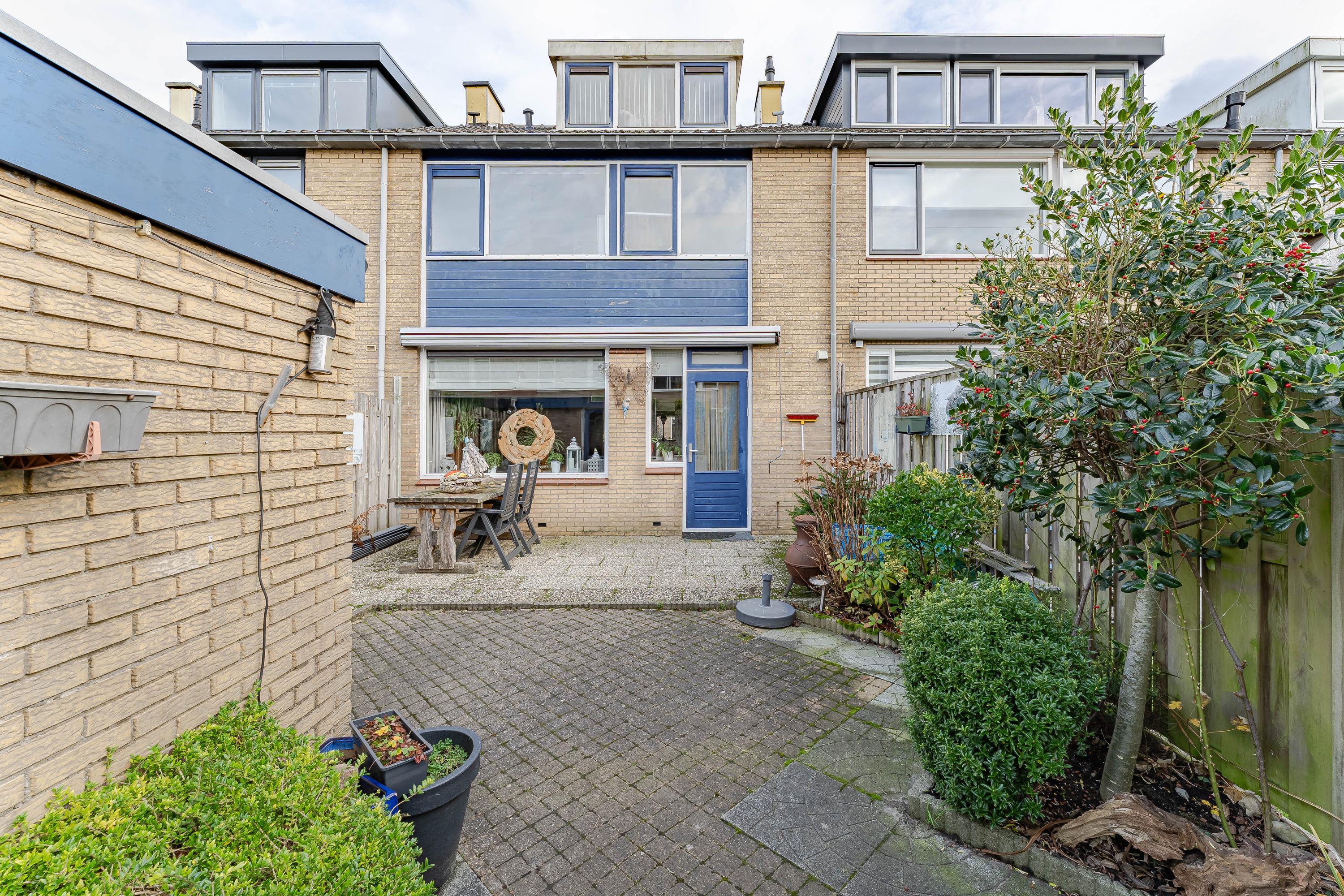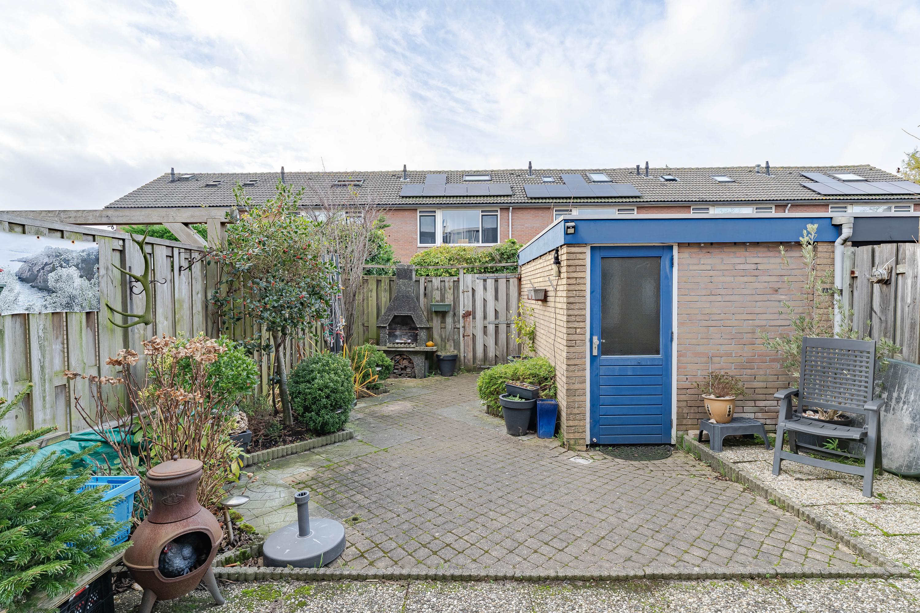 Vanuit de keuken heeft u toegang tot de achtertuin. De voor- en achtertuin zijn grotendeels voorzien van bestrating. Van ’s morgens vroeg tot ’s avonds laat kunt u hier van de zon genieten. Achterin de tuin staat een ruime stenen berging en er is een achterom. Het zonnescherm zorgt op warme dagen voor schaduw.