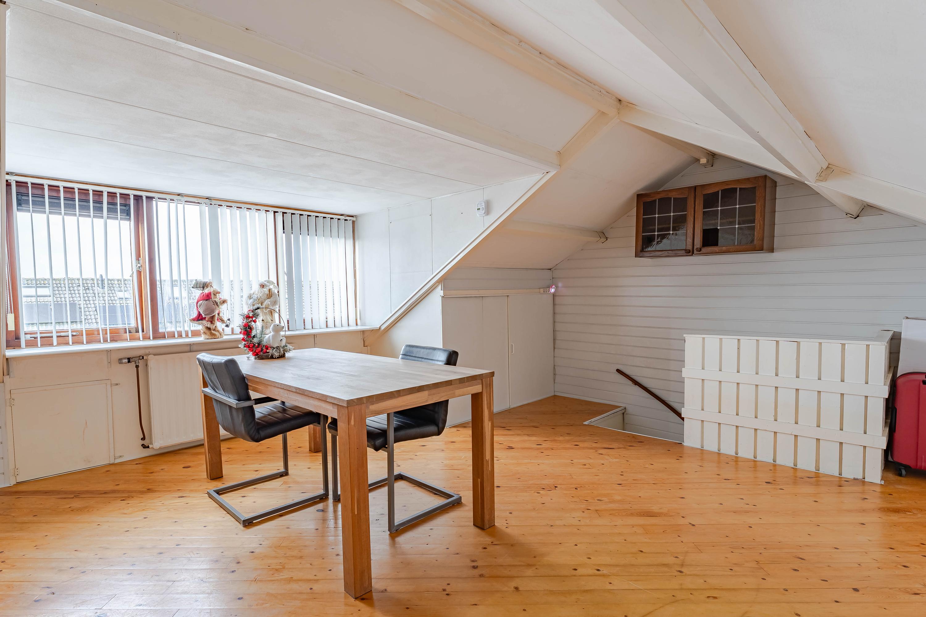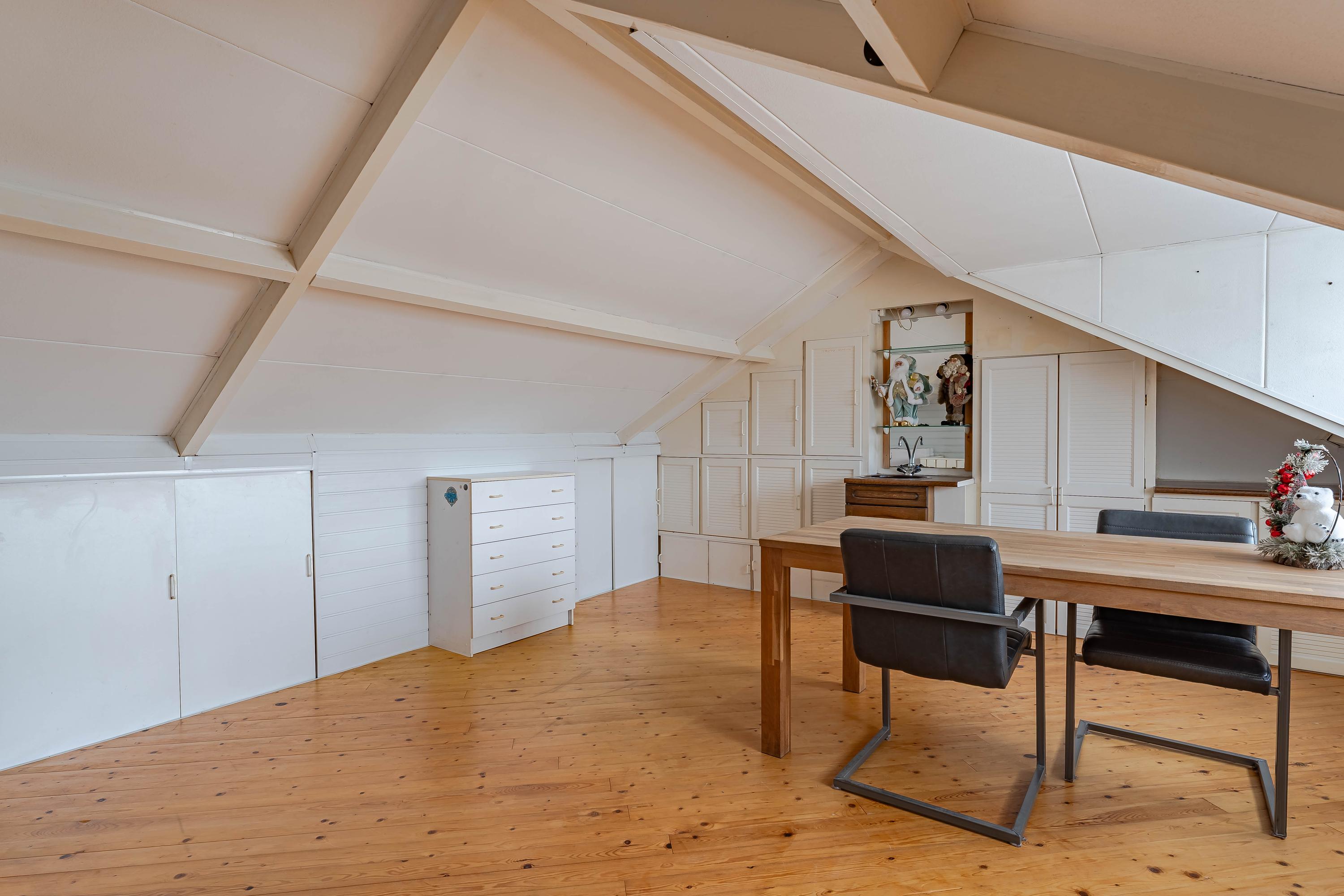 Via de vaste trap bereikt u de tweede verdieping. Hier treft u een open ruimte die nog vrij ingedeeld kan worden. De dakkapel aan de achterzijde zorgt al voor extra ruimte en lichtinval. De c.v.-ketel (Remeha uit 2015) staat in een kast opgesteld. Wilt u deze verdieping uitbreiden? Door het plaatsen van een dakkapel aan de voorzijde (vergunning plichtig) kunt u hier twee kamers creëren. Onder de schuine kap is er bergruimte. Een tweede verdieping met mogelijkheden!