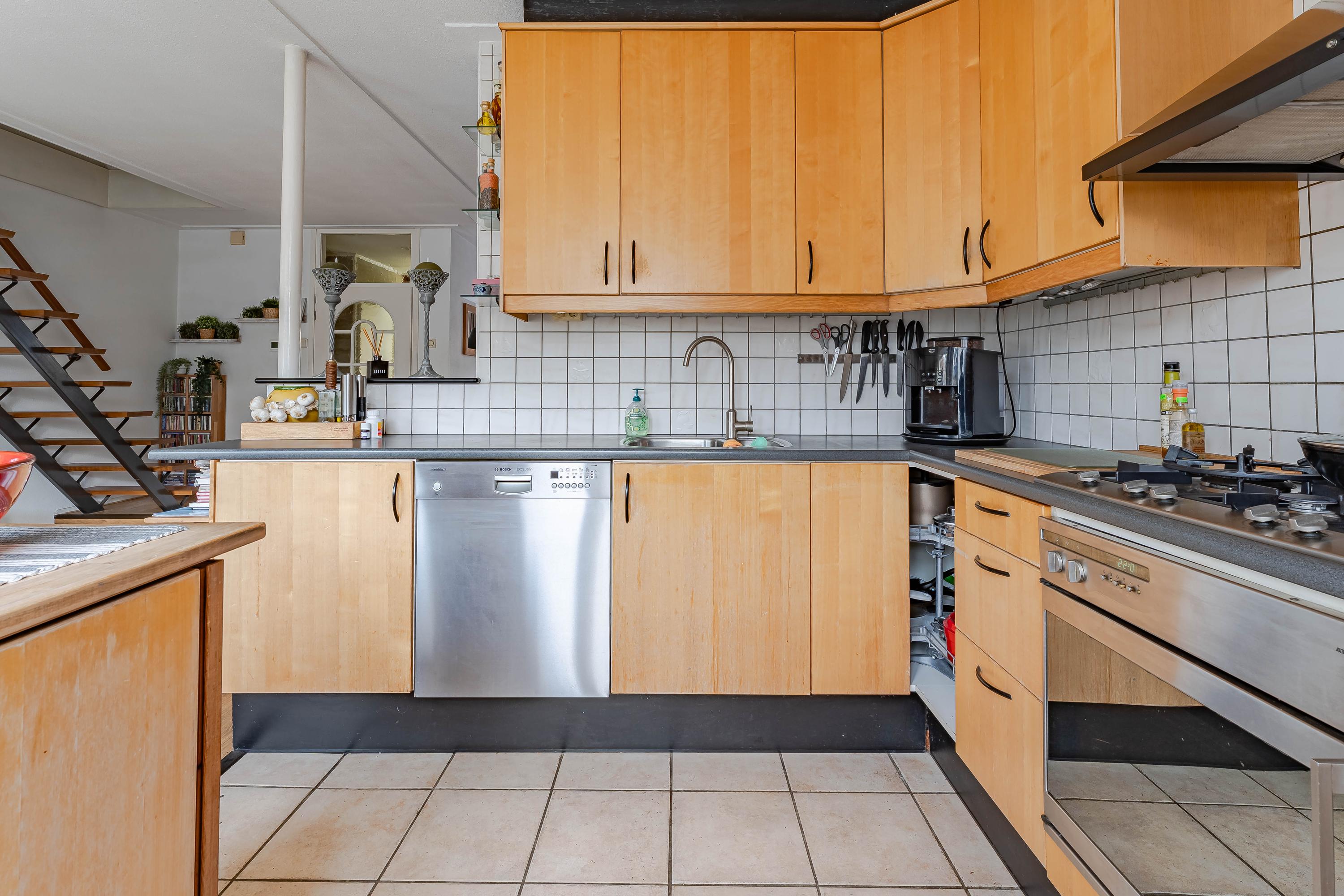 De halfopen keuken bevindt zich aan de achterzijde en is voorzien van diverse inbouwapparatuur zoals een koelkast, vaatwasser, oven, gaskookplaat en afzuigkap. Daarnaast is er voldoende kastruimte om keukenspullen op te bergen. Tevens treft u hier de wasmachineaansluiting.