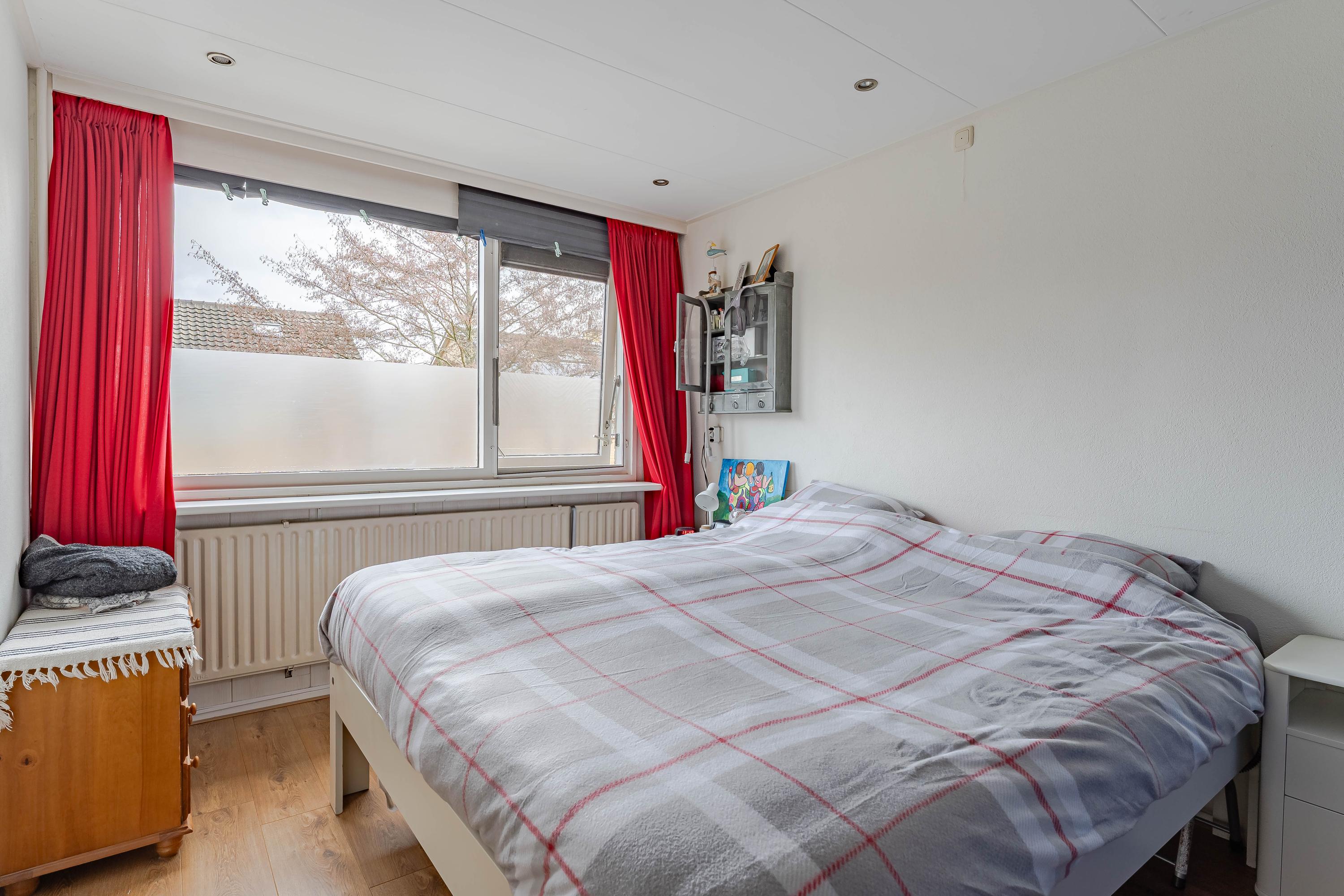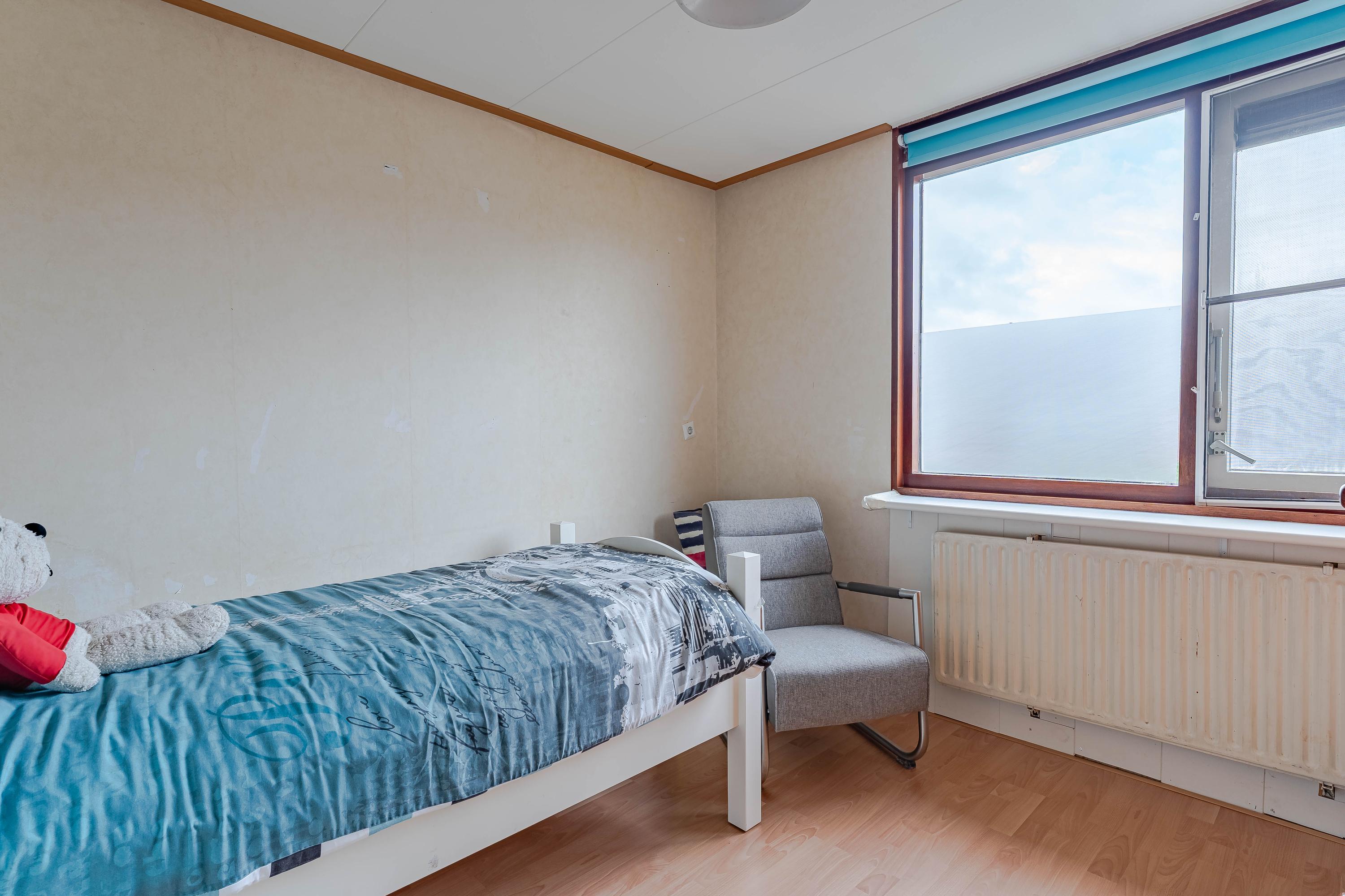 Door middel van de trap in de woonkamer bereikt u de eerste verdieping welke toegang biedt tot de vier slaapkamers en de badkamer. Twee slaapkamers zijn voorzien van een vaste kast met schuifdeuren. De badkamer bevindt zich in het midden van de verdieping en is ingericht met een douche, wastafel en toilet. Wilt u graag een ruimere badkamer? Dan zou u een slaapkamer kunnen inrichten als badkamer. Van de huidige badkamer kunt u een toiletruimte of wasruimte maken.