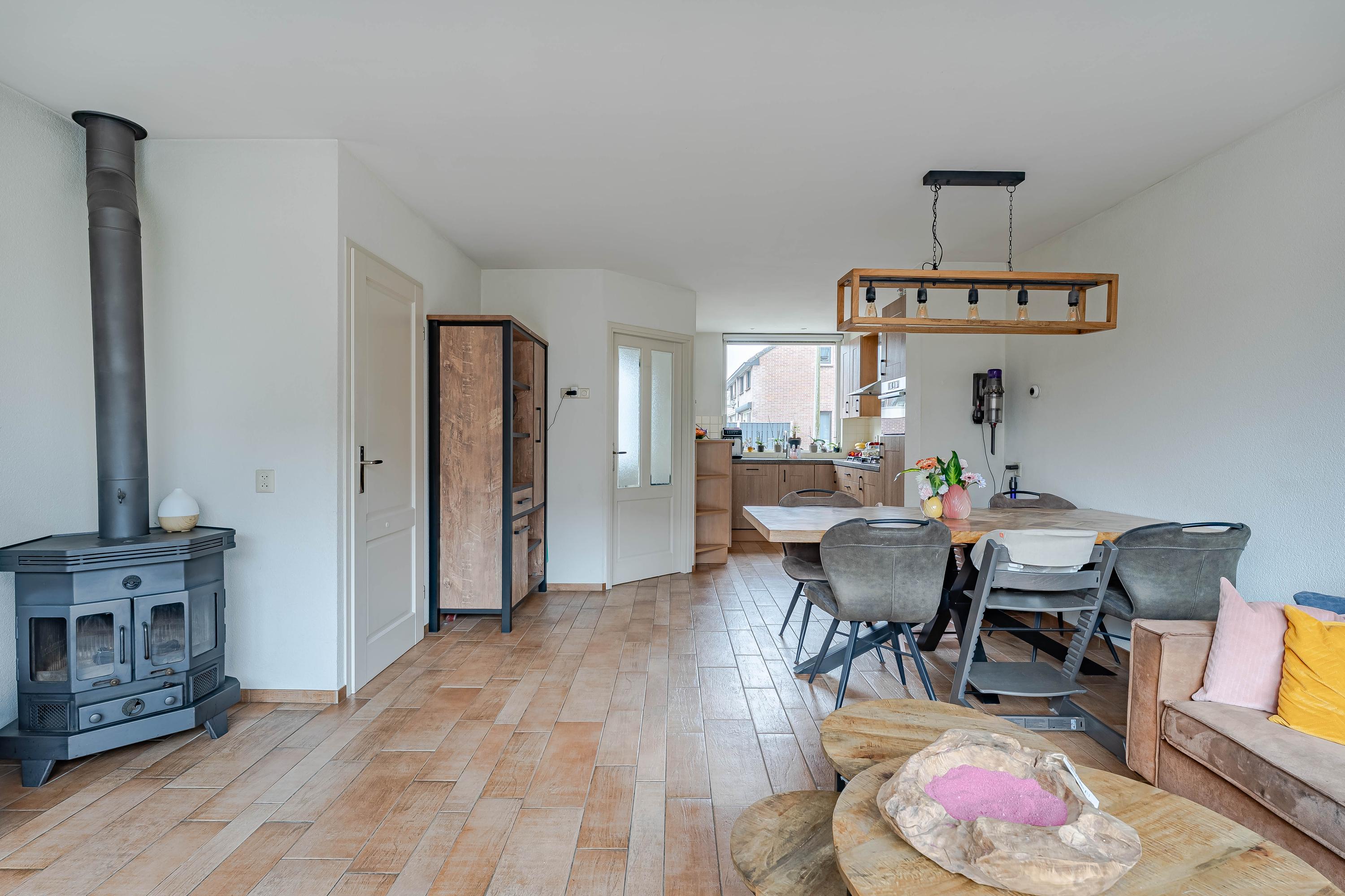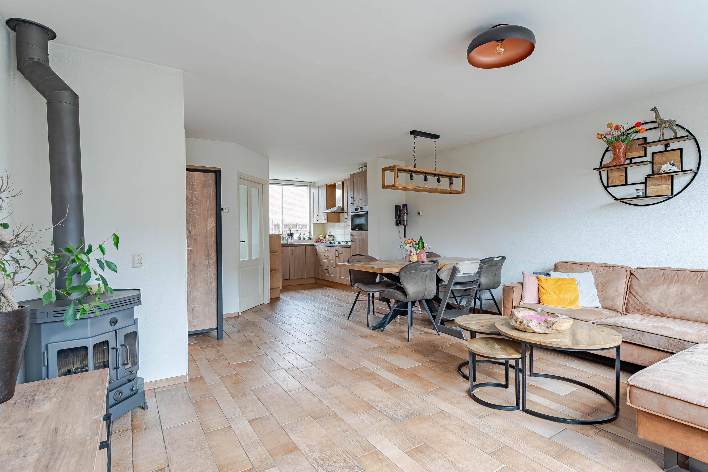 De tuingerichte woonkamer heeft veel lichtinval door de grote raampartijen. Er is voldoende ruimte voor een zit- en eethoek. De houtkachel geeft extra warmte en sfeer in de wintermaanden en de trapkast is ideaal voor extra bergruimte. De begane grond is voorzien van vloerverwarming en een plavuizenvloer.