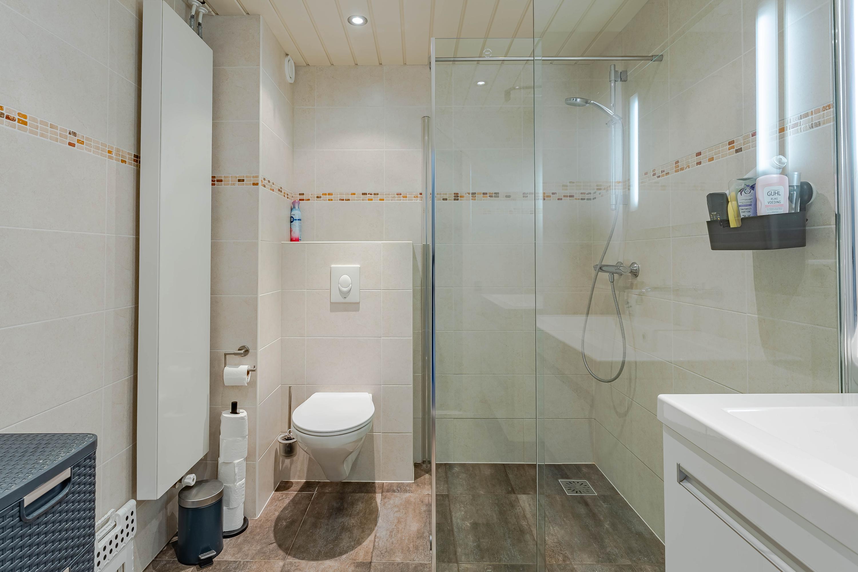 De badkamer is ruim en ingericht met een inloopdouche, toilet, wastafel met meubel, mechanische ventilatie en een designradiator.