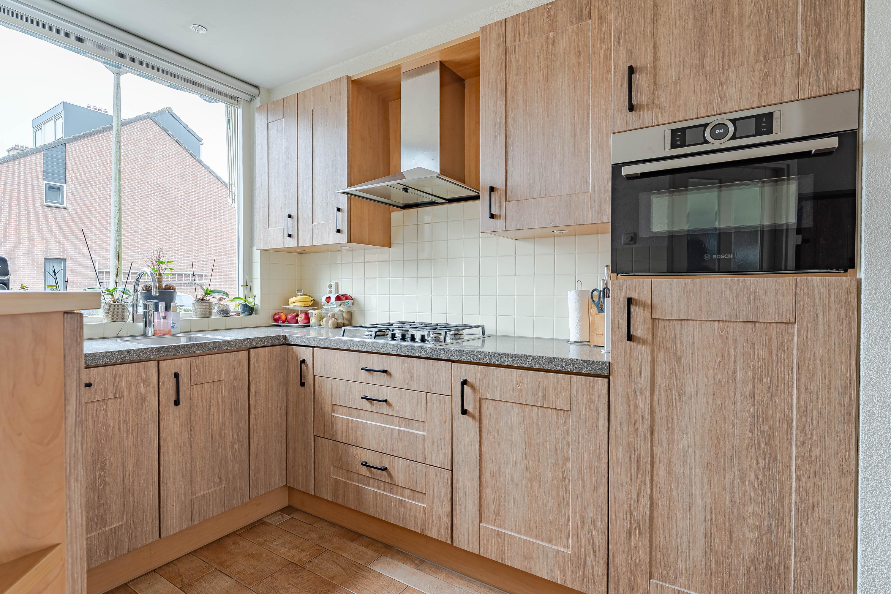 De open keuken bevindt zich aan de voorzijde van de woning en kijkt uit op de straat. De keuken is afgelopen jaar gewrapt, voorzien van een granieten blad en ingericht met een 4-pits gasfornuis, afzuigkap, vaatwasser, combi-oven, koelkast en vriezer.