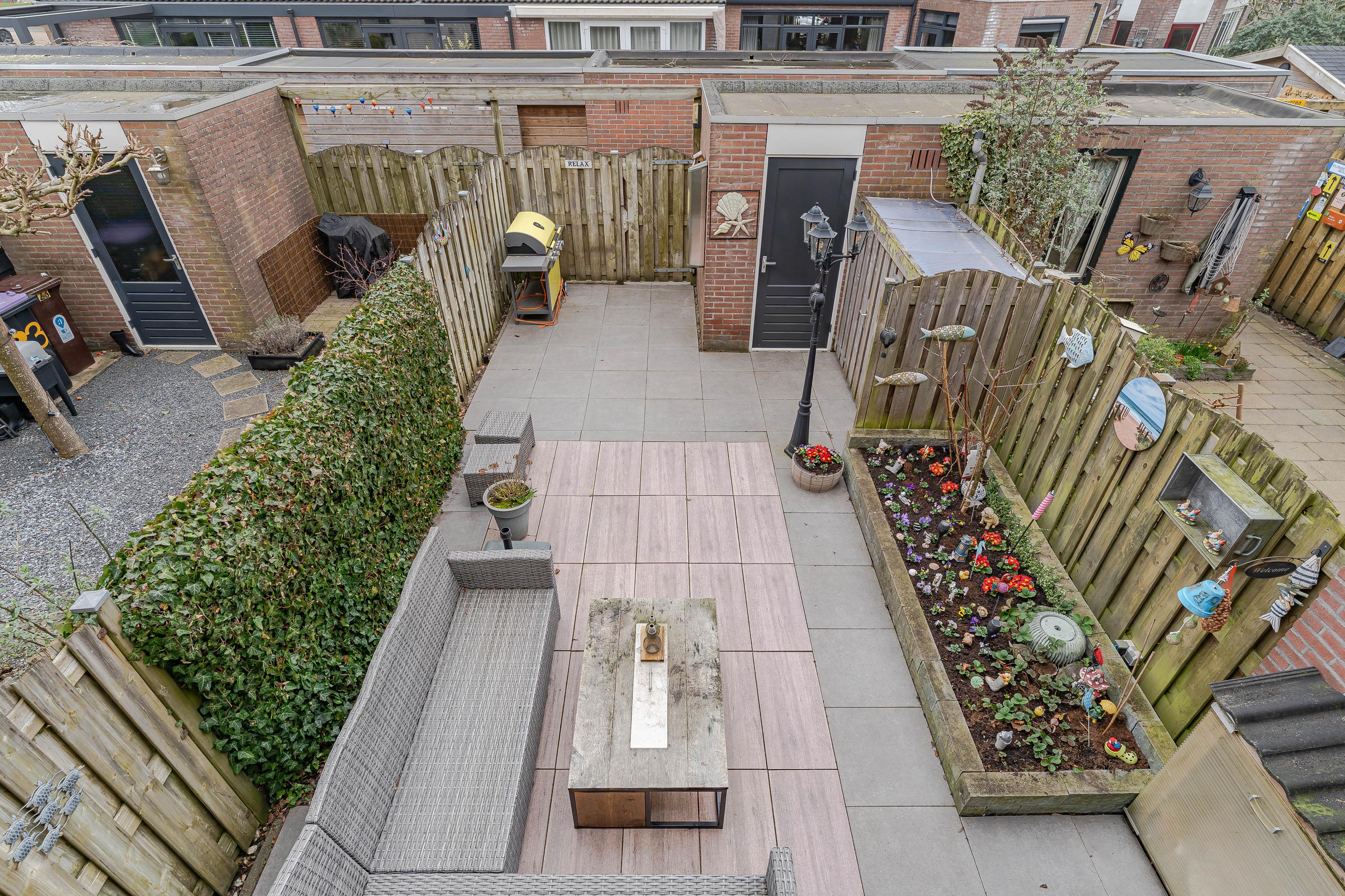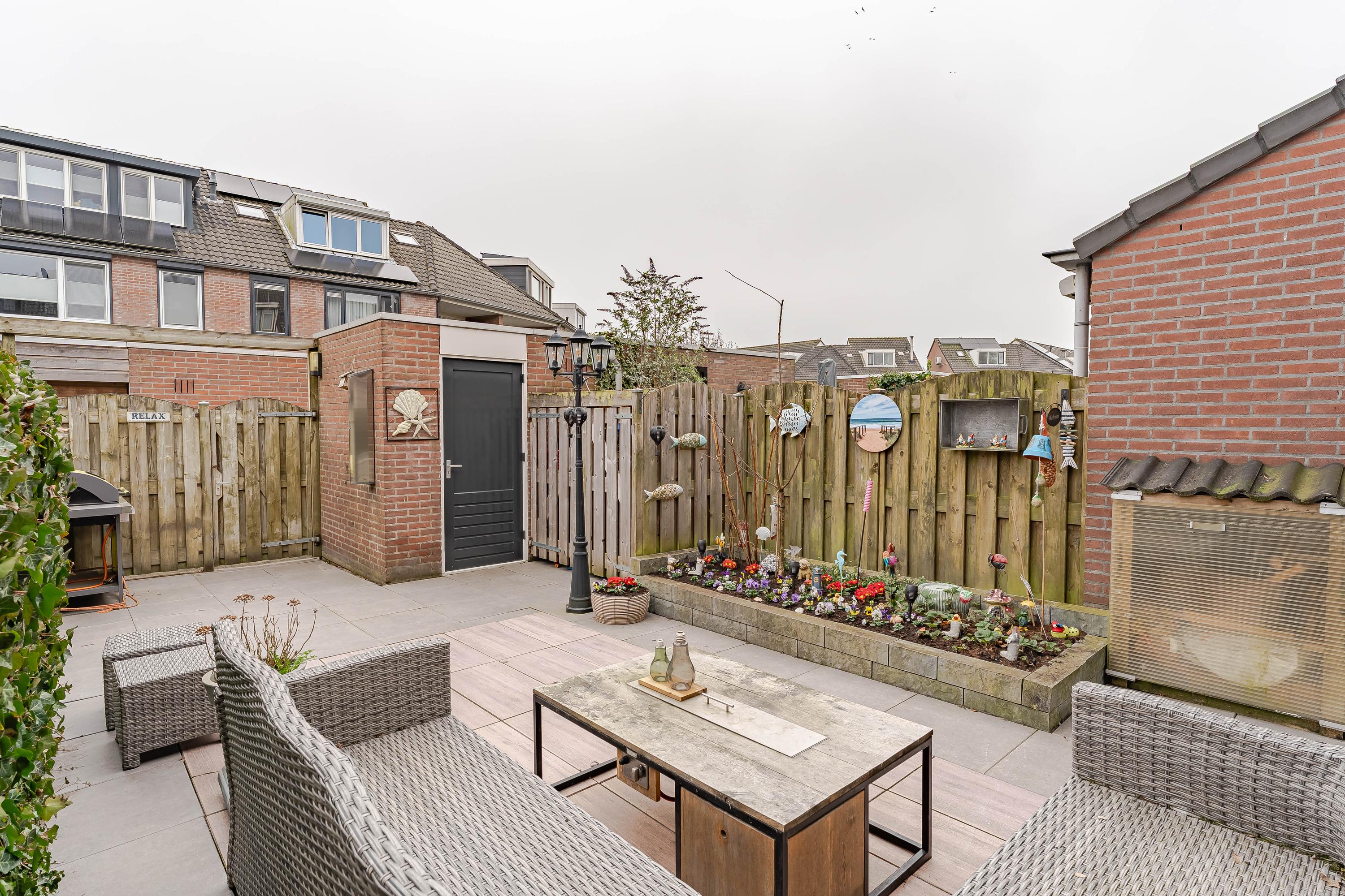 Vanuit de woonkamer is er toegang tot de achtertuin gelegen op het oosten. Door de diepte van de tuin kunt u hier heerlijk van de zon genieten. De tuin is onderhoudsvriendelijk aangelegd en voorzien van een stenen berging en er is een achterom aanwezig.