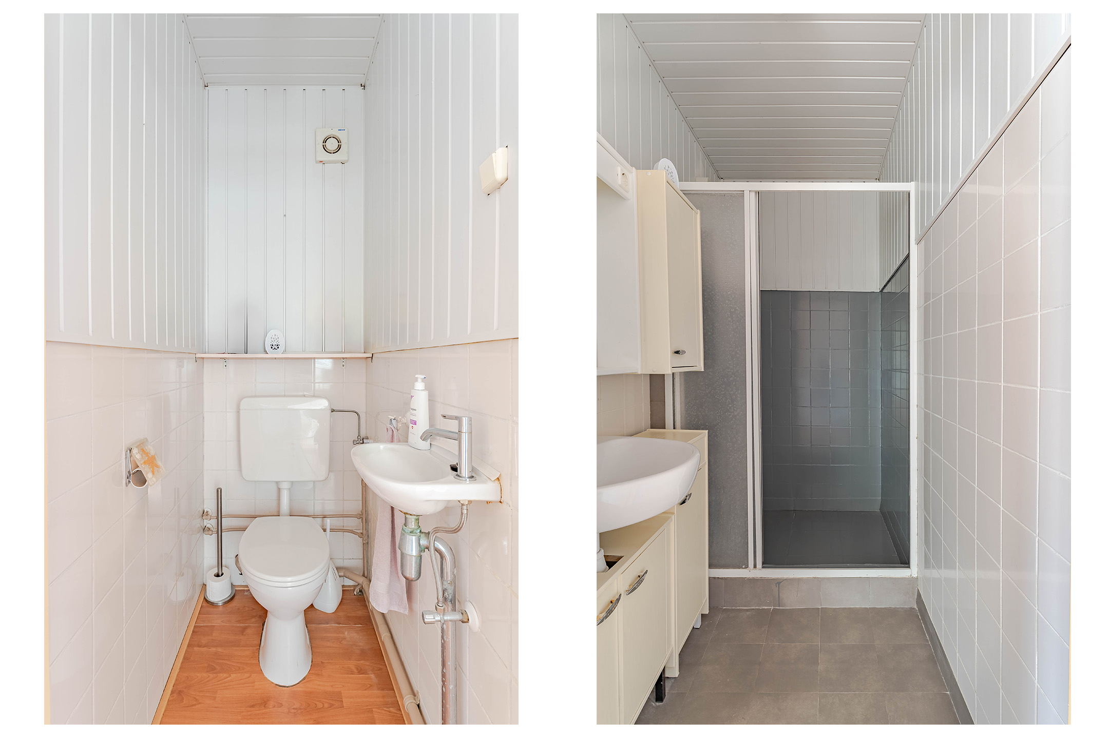 De eenvoudige badkamer is ingericht met een douchecabine en een wastafel met meubel. Daarnaast is er een apart toilet.