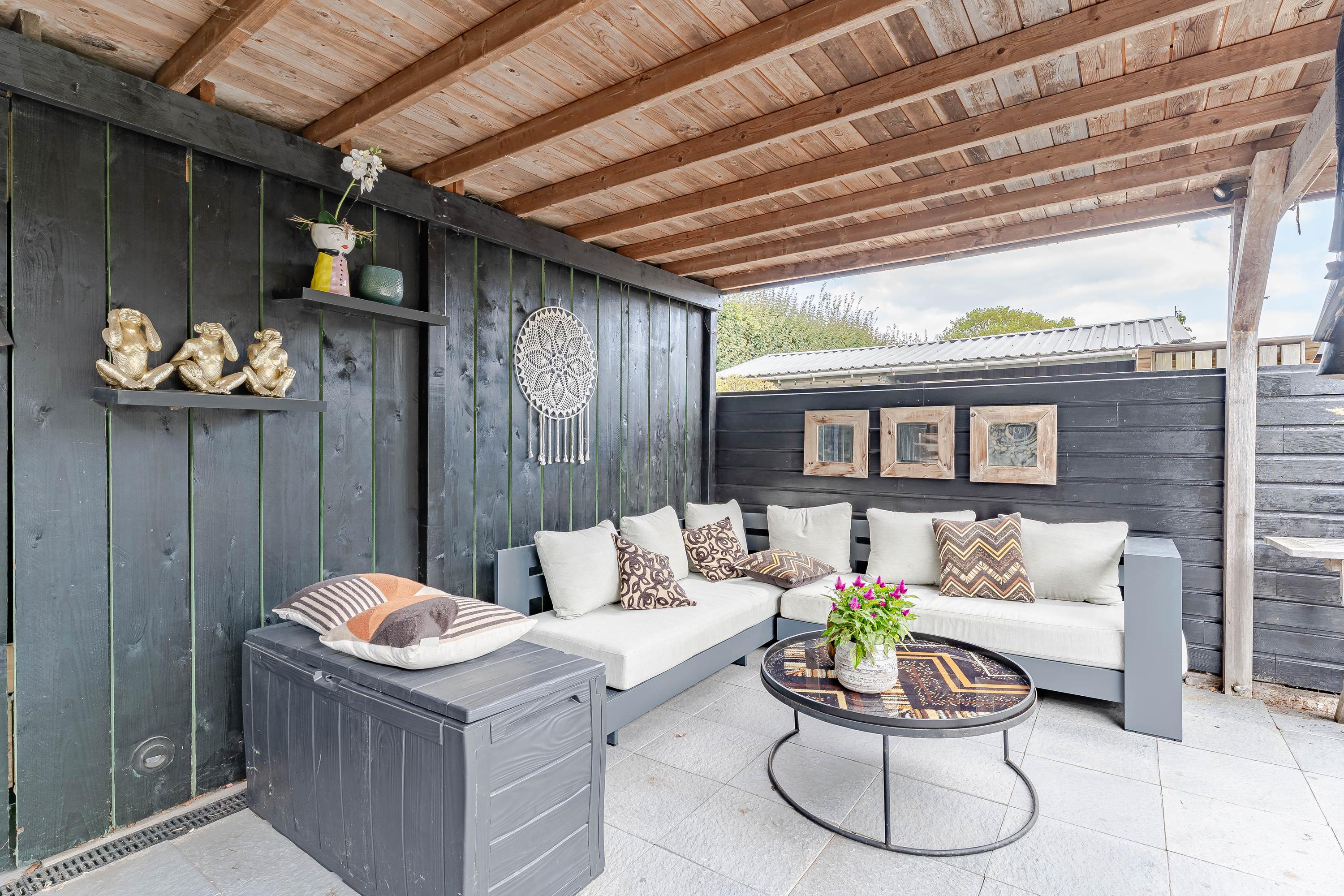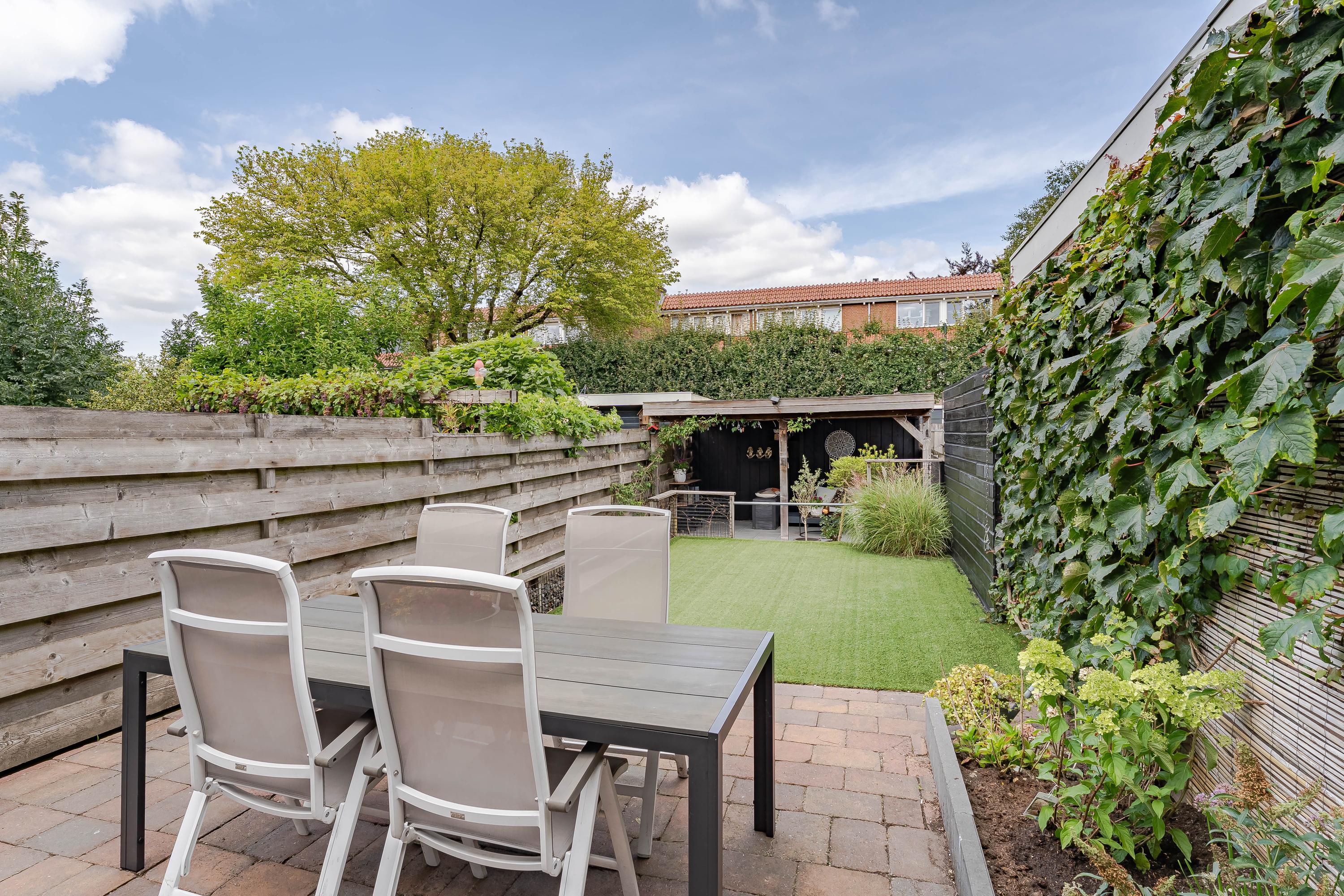 De diepe achtertuin is prachtig aangelegd. Onder de overkapping kunt u genieten van gezellige momenten. Achterin de tuin bevindt zich een ruime berging, die is voorzien van elektra.