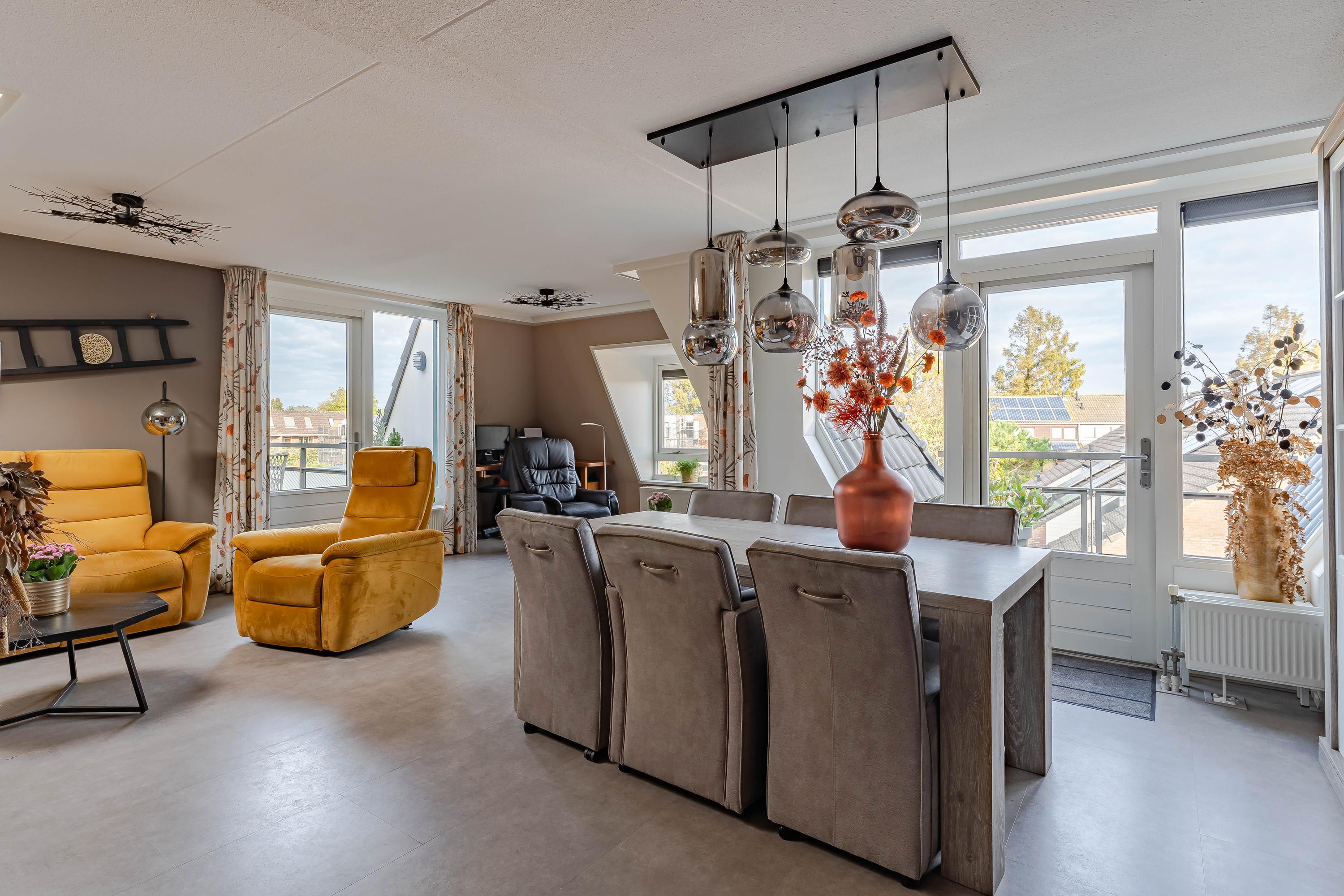 De woonkamer met open keuken is heerlijk licht, dit komt door de vele raampartijen en de lichtkoepel die in het midden van de kamer is geplaatst. Alle ruimte voor het plaatsen van al uw meubels. De in 2022 vernieuwde keuken is ruim opgezet en heeft een luxe uitstraling. Aan inbouwapparatuur treft u het volgende aan: 4-pits inductiekookplaat met geïntegreerde afzuiging, combioven, extra ruime koelkast, Quooker en een koffieautomaat. De kasten bieden voldoende bergruimte voor al uw voorraad en keukengerei. Het aanrecht is van kunststof.