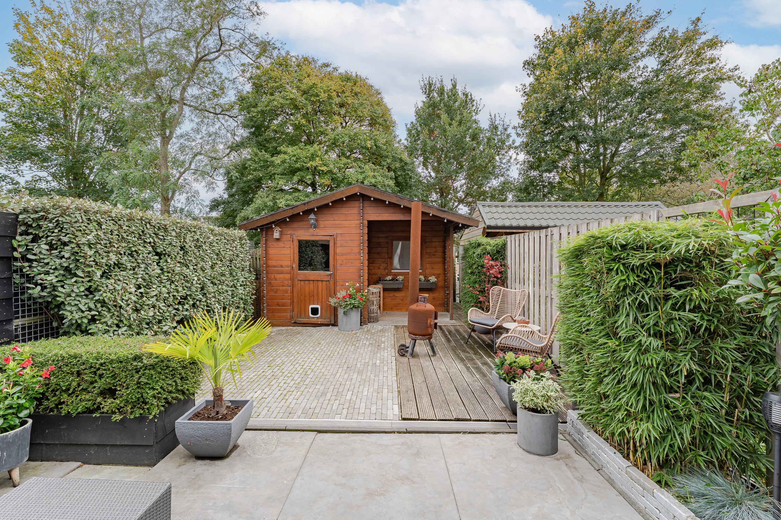 In de tuin staat een royale houten berging met elektra en wateraansluiting. Ideaal als hobbyruimte, klusplek of als extra opbergruimte.