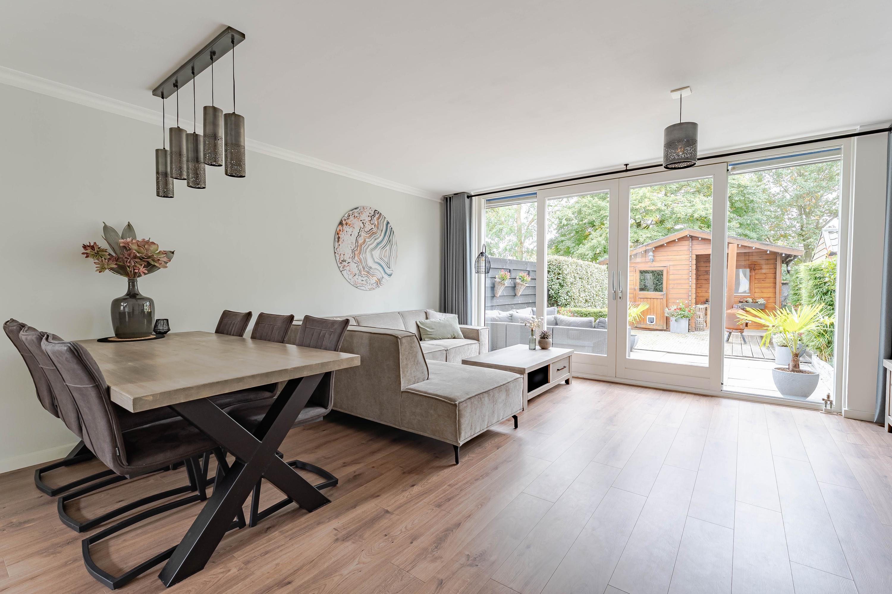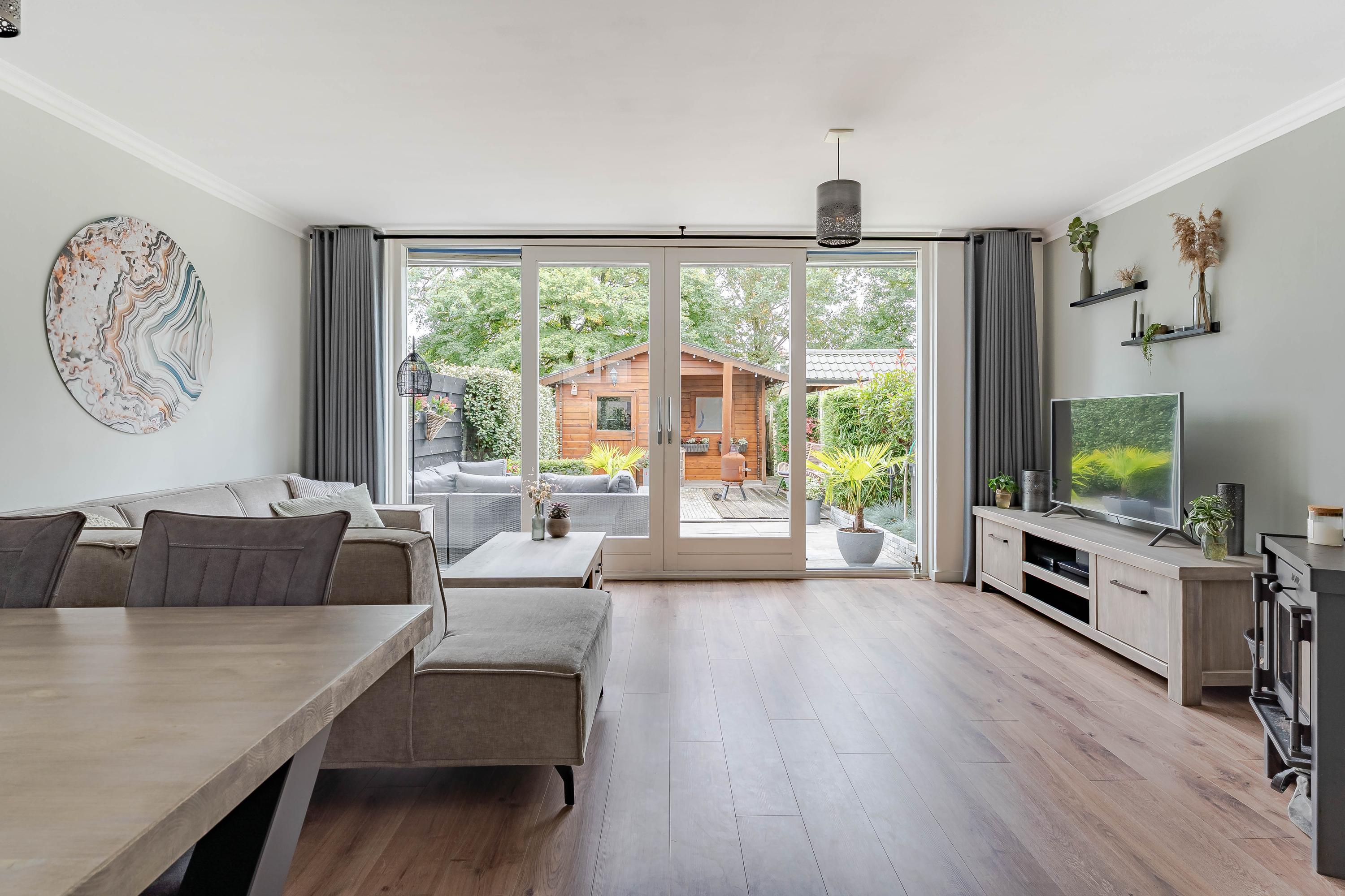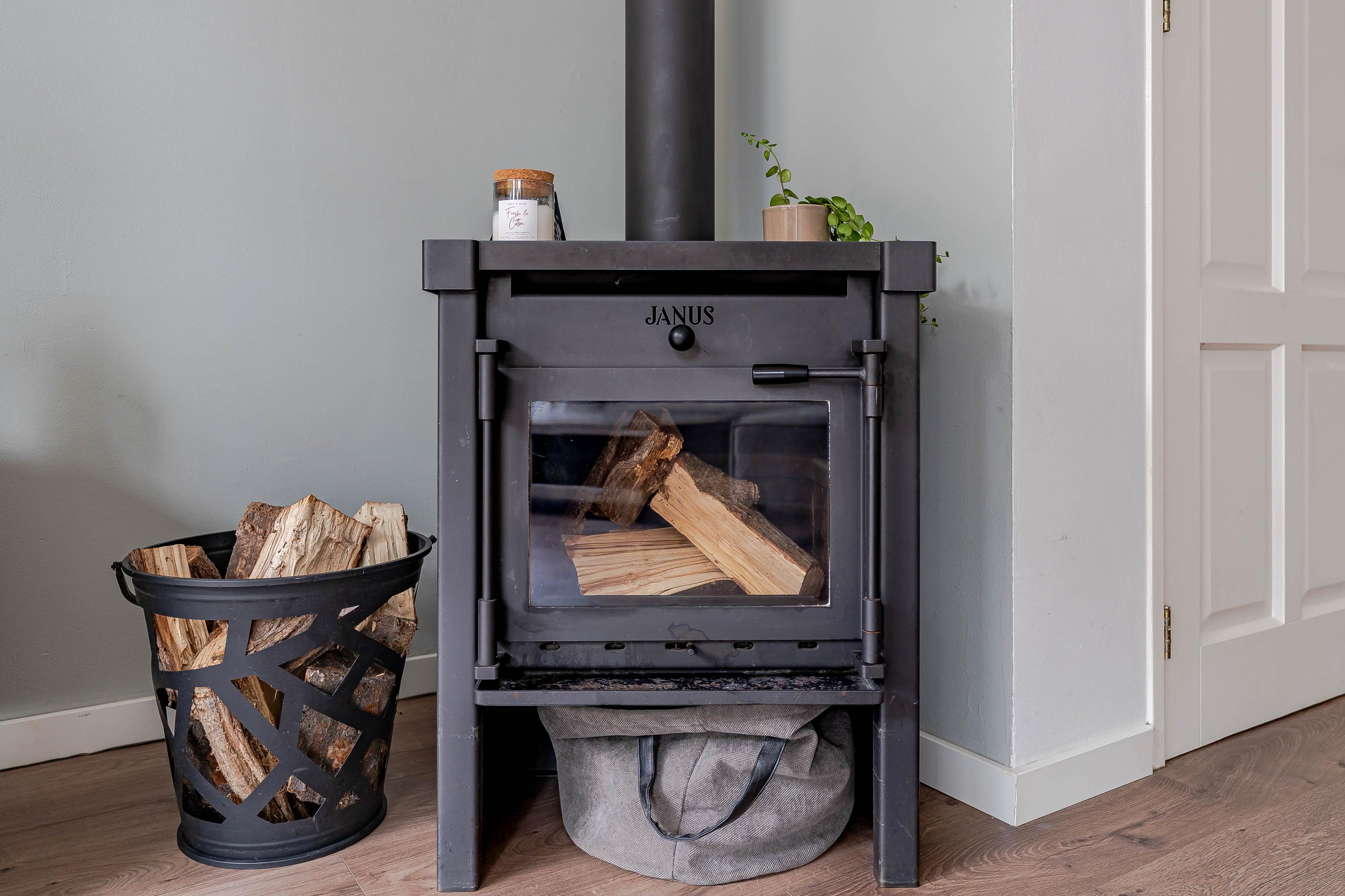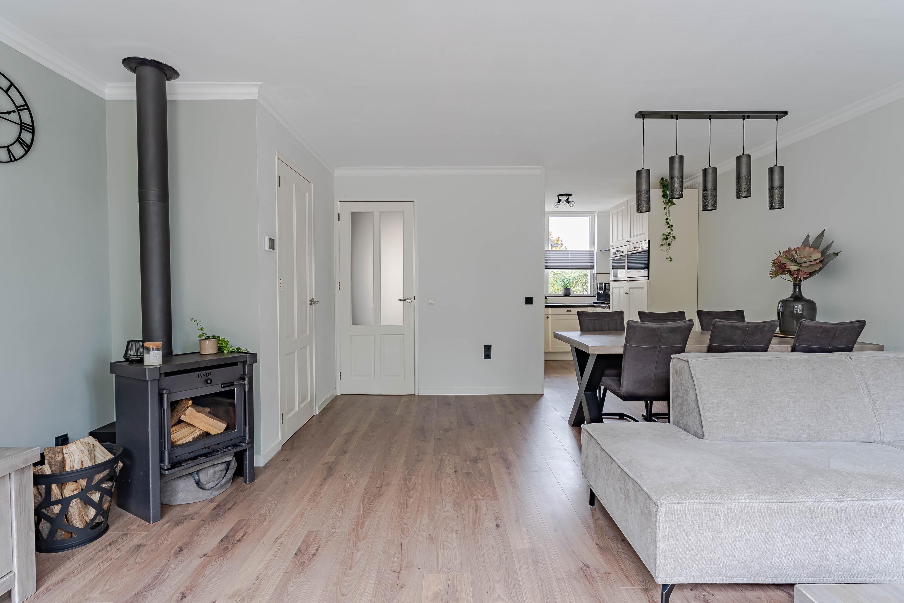 De lichte woonkamer biedt uitzicht op de achtertuin en is voorzien van een schuifpui, wat zorgt voor veel natuurlijk licht. In het midden van de kamer zorgt een houtkachel voor een gezellige sfeer tijdens de koudere maanden.