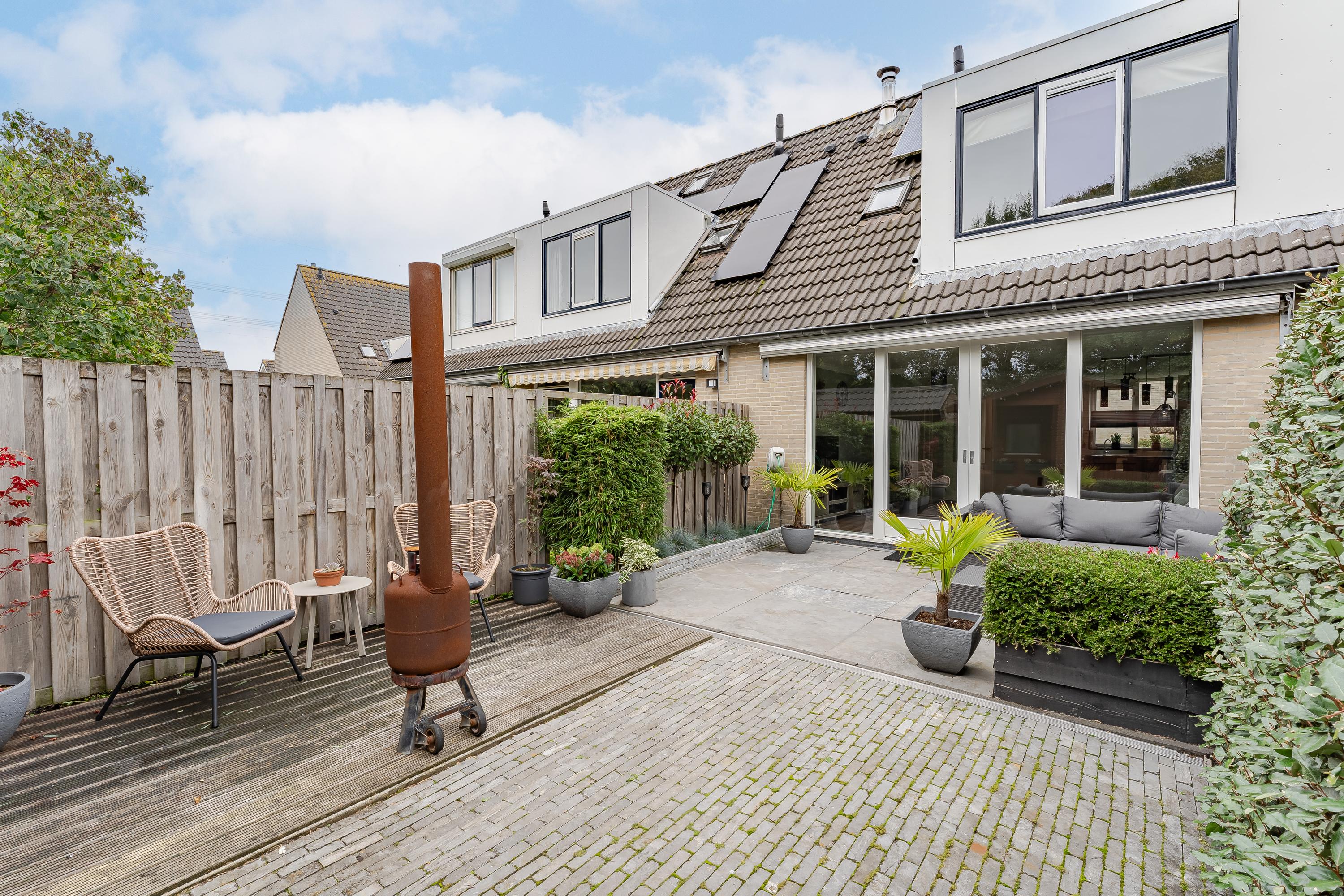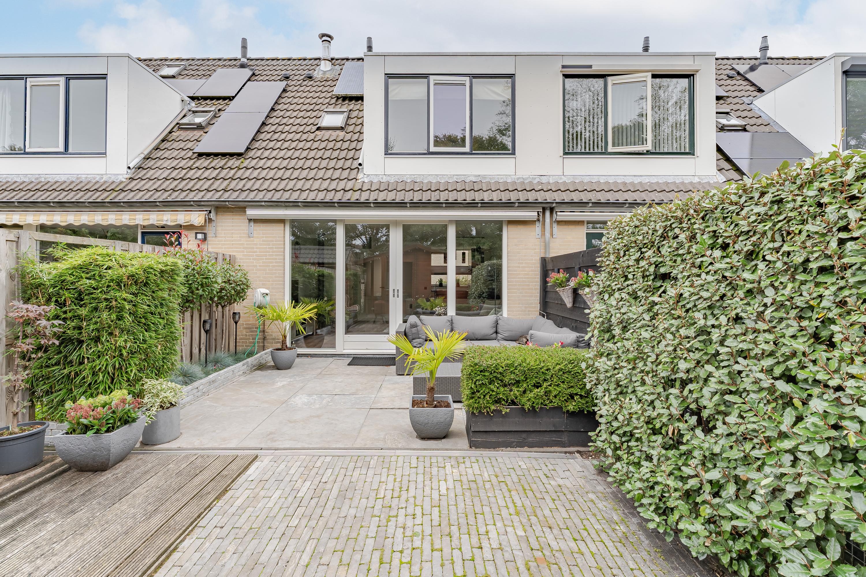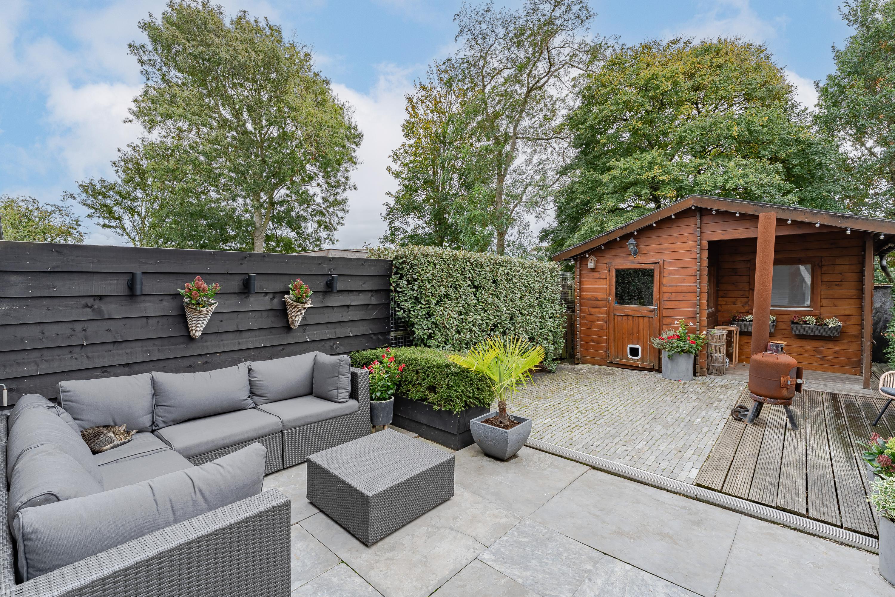 De verzorgd aangelegde achtertuin is gelegen op het zuiden. Zonliefhebbers kunnen hier de hele dag genieten van het buitenleven. De hoge bomen achter het perceel zorgen voor veel groen en privacy.