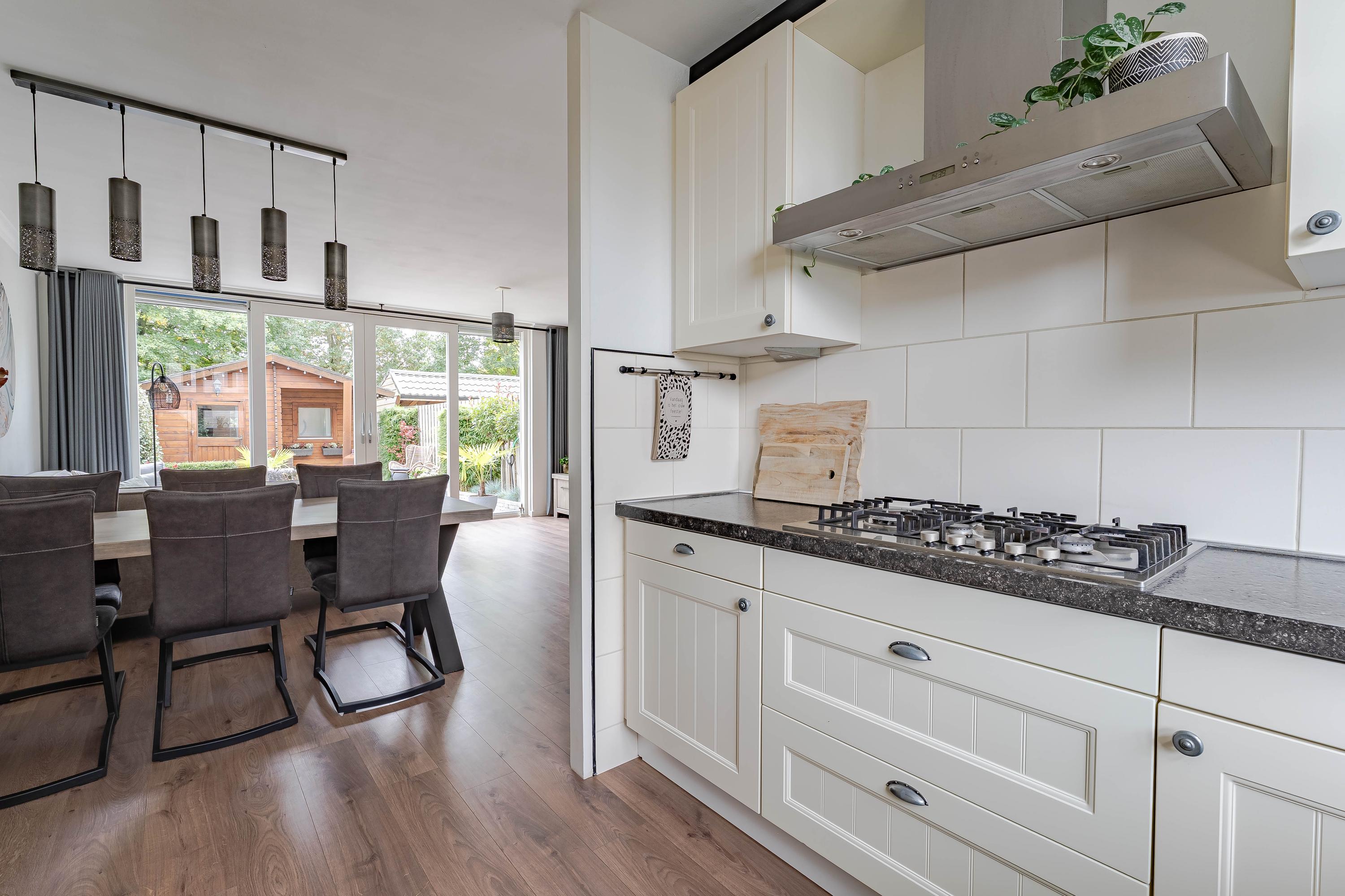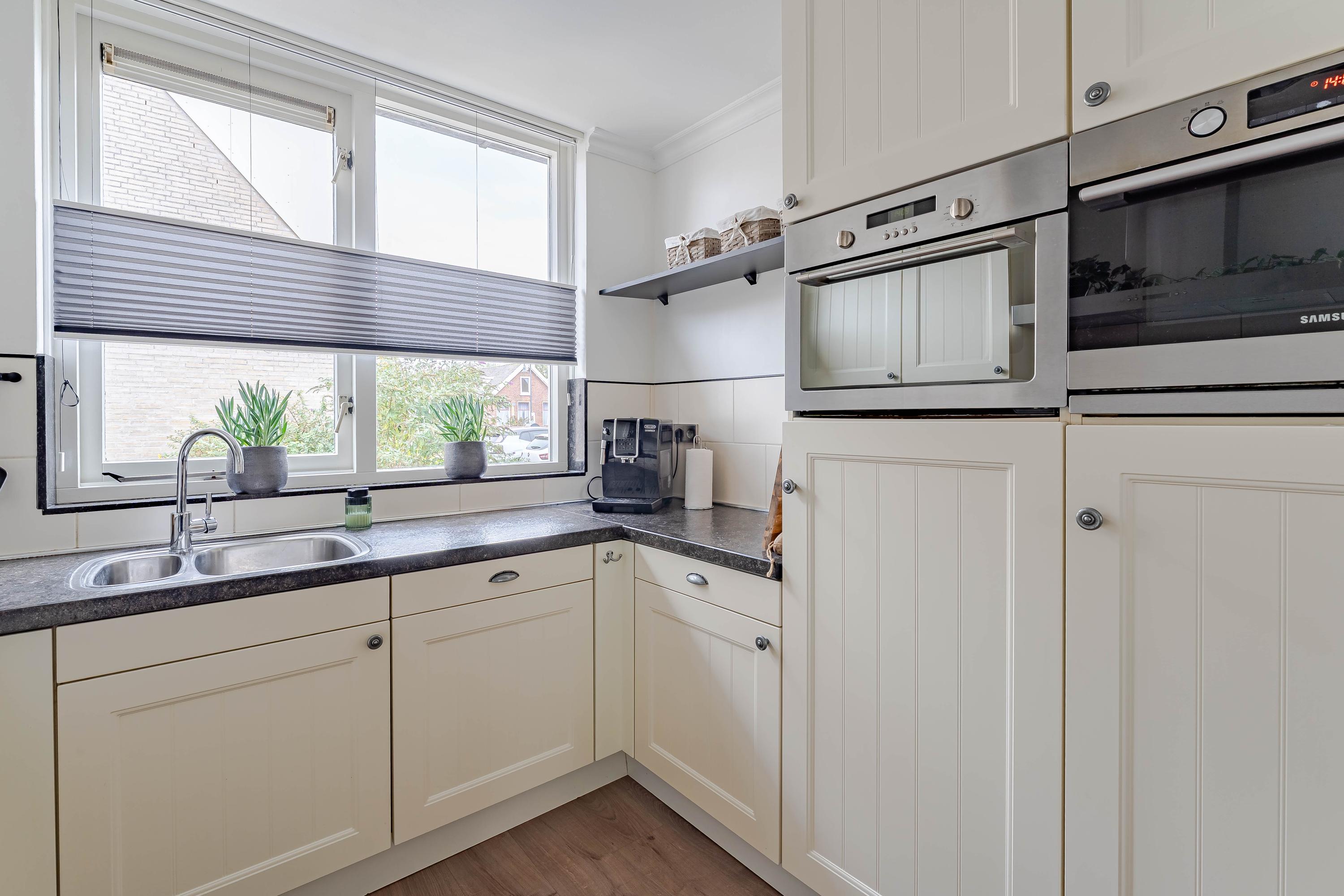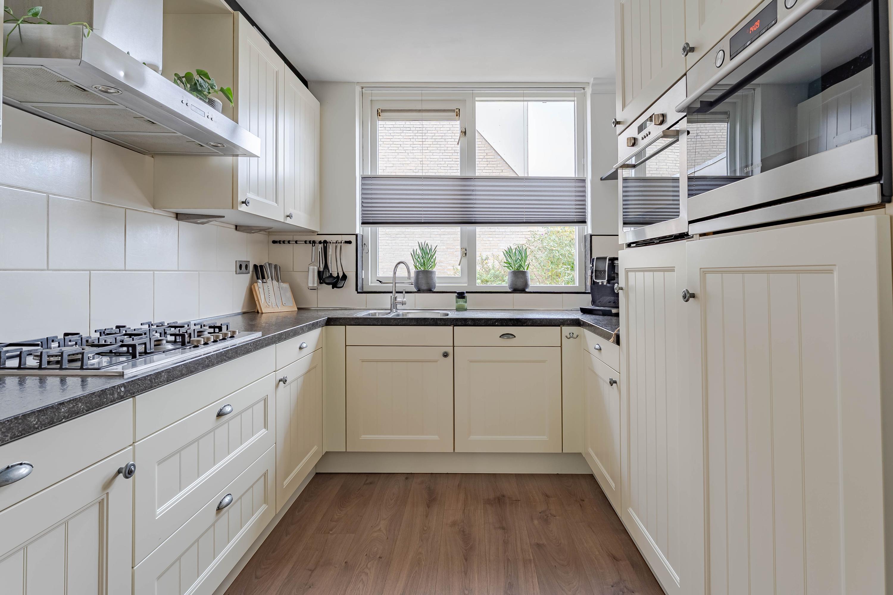 Aan de voorzijde van de woning bevindt zich de open keuken in praktische U-opstelling. Deze is voorzien van diverse inbouwapparatuur, waaronder: vaatwasser, koelkast, vriezer, oven, magnetron met ovenfunctie en een 5-pits gaskookplaat. Het werkblad is van steen en de kastjes bieden ruim voldoende opbergruimte.