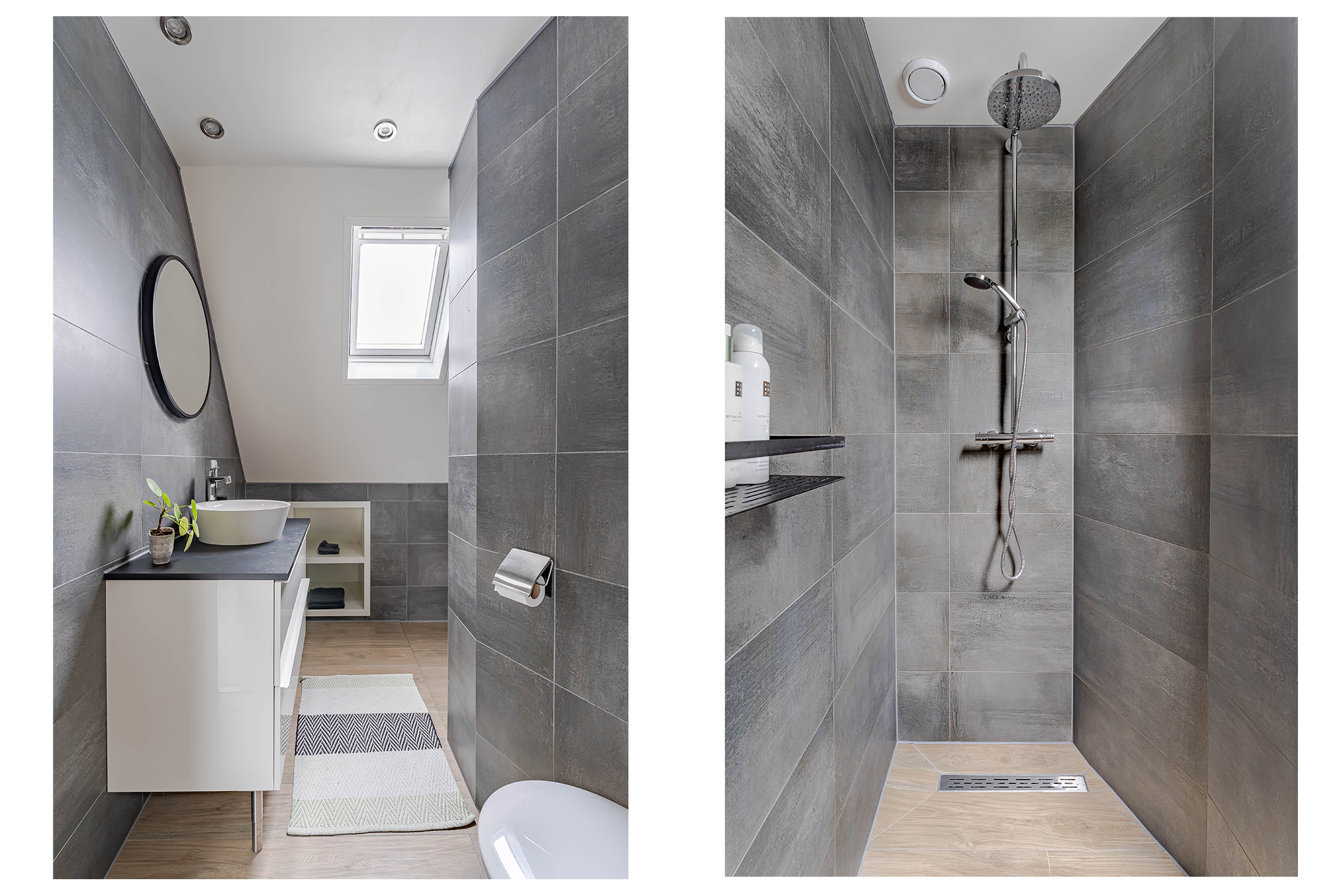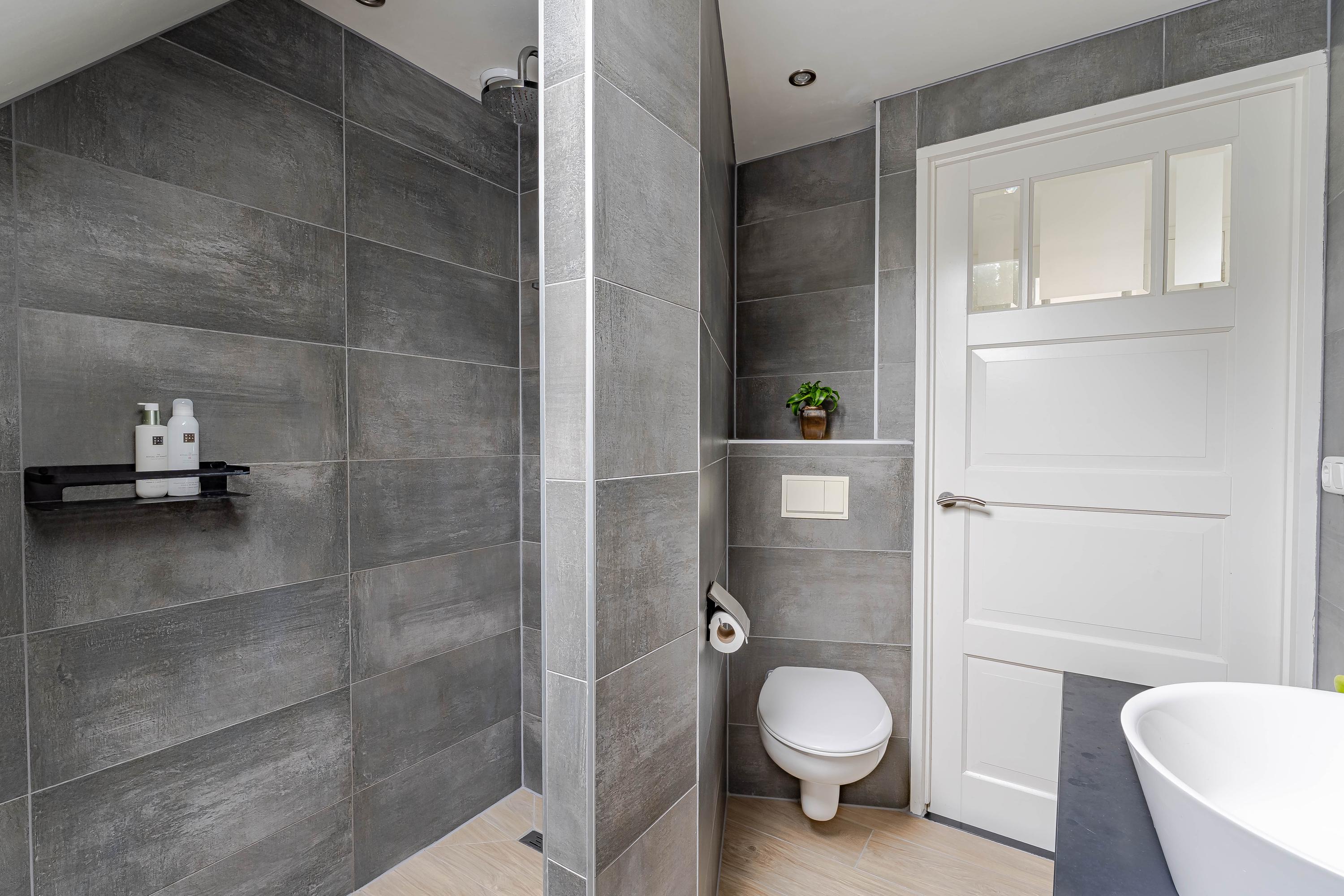 De moderne badkamer is uitgerust met een inloopdouche, wastafel met meubel, zwevend toilet en aansluiting voor wasapparatuur.