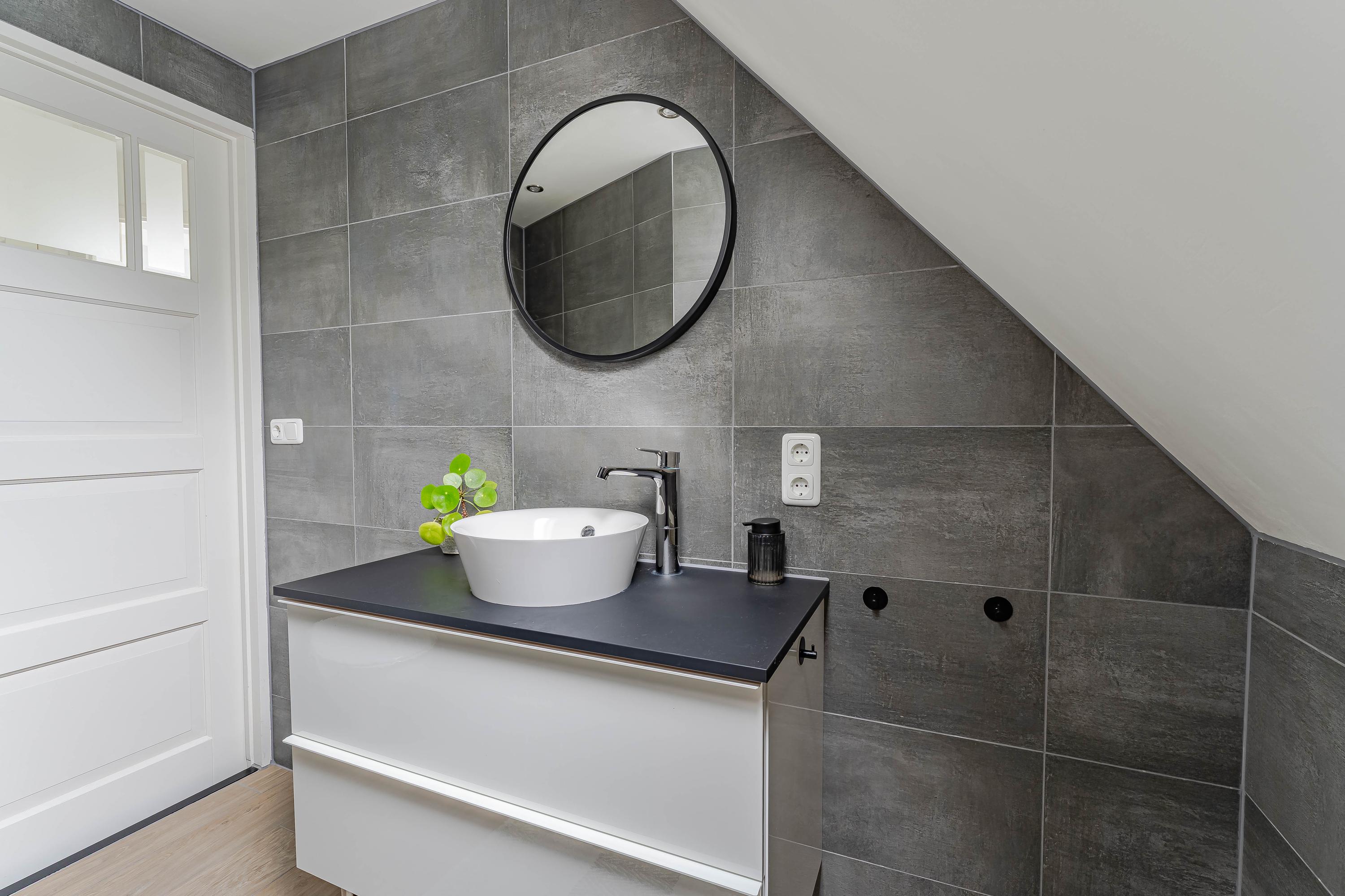 De huidige eigenaren hebben de wasmachine en droger echter geplaatst in de ruime houten berging in de tuin. Hierdoor is er in de badkamer extra ruimte ontstaan. Een dakraam en mechanische ventilatie zorgen voor een goede luchtcirculatie.