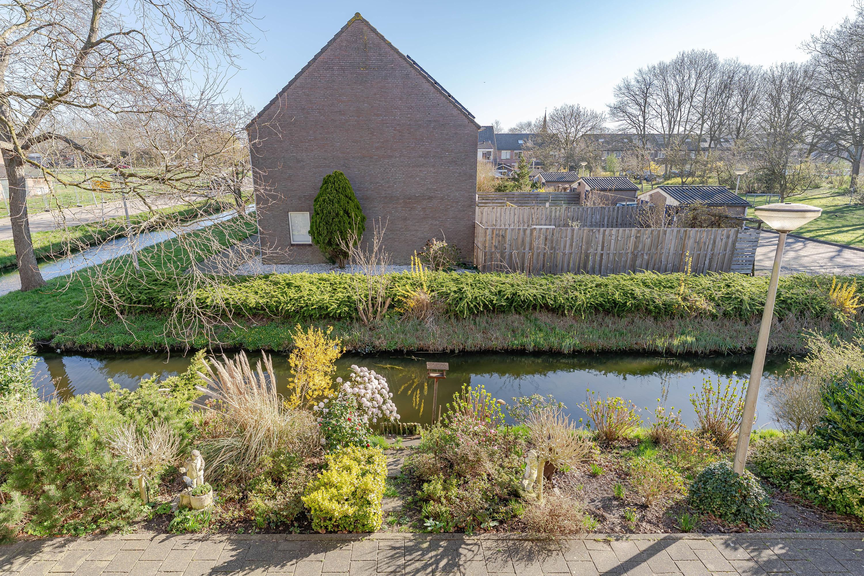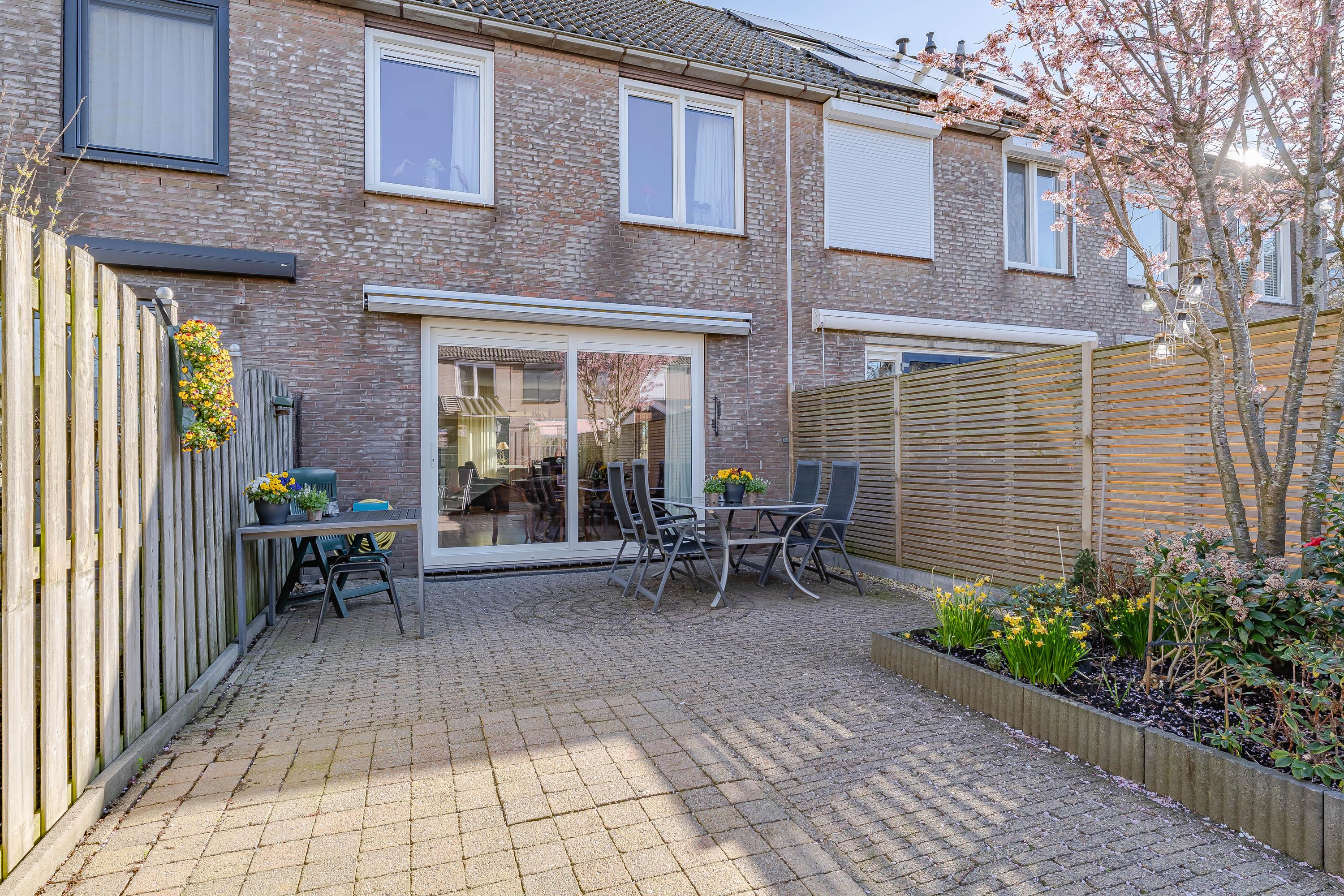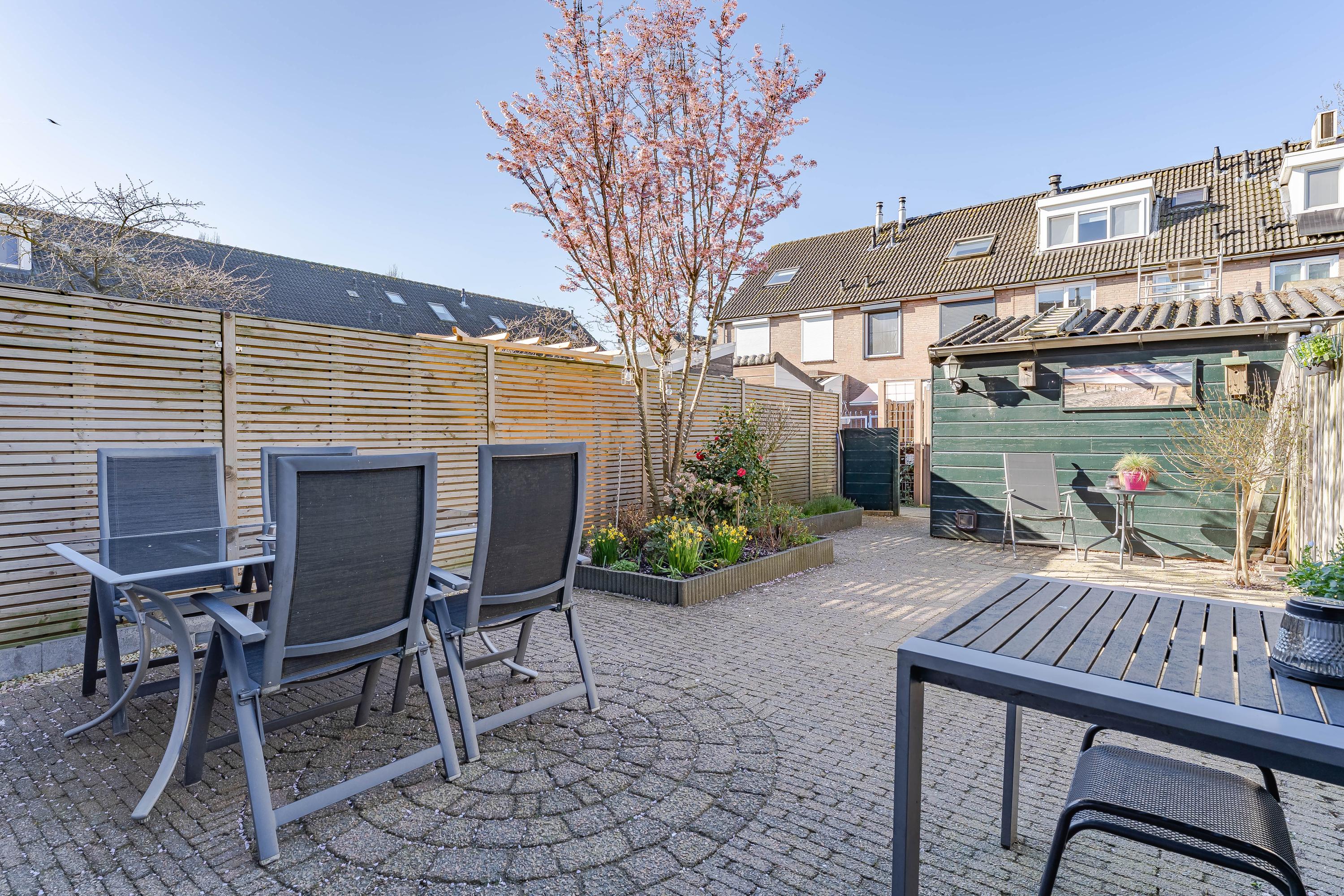 De keurig aangelegde achtertuin is 10 meter diep en beschikt over een achterom. Met een ligging op het zuidwesten is hier altijd een plekje in de zon te vinden. Achterin de tuin staat de houten berging.