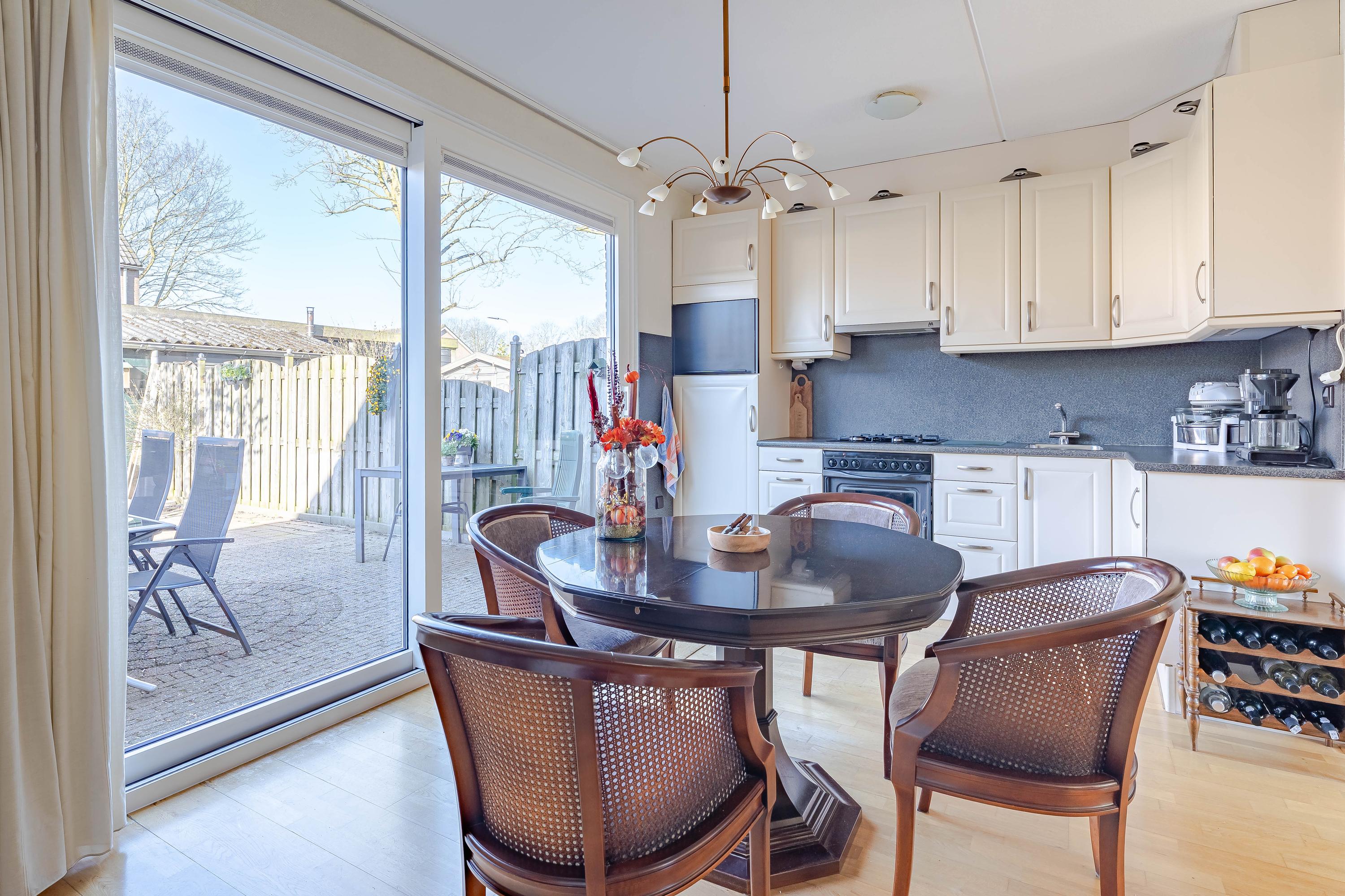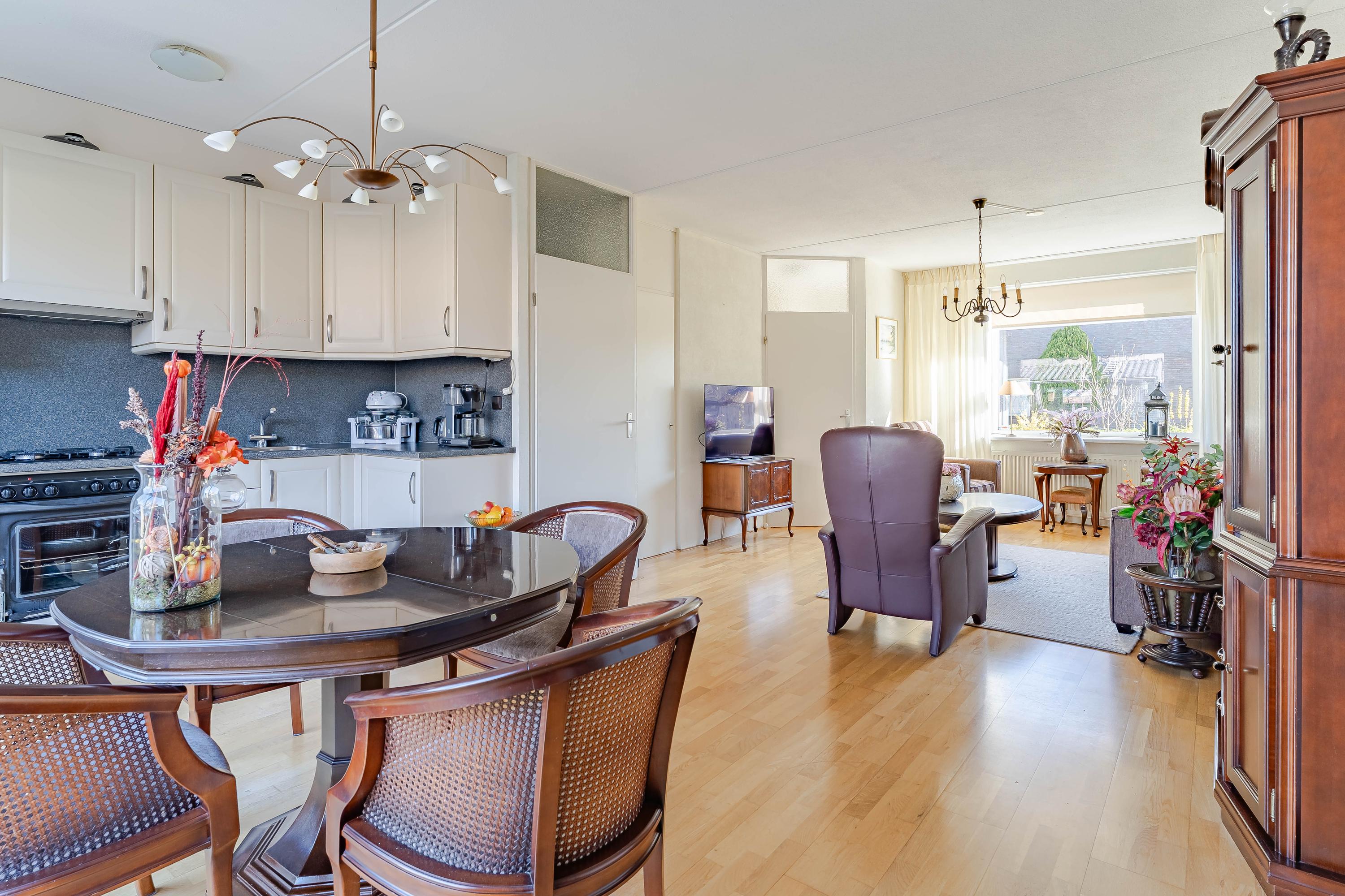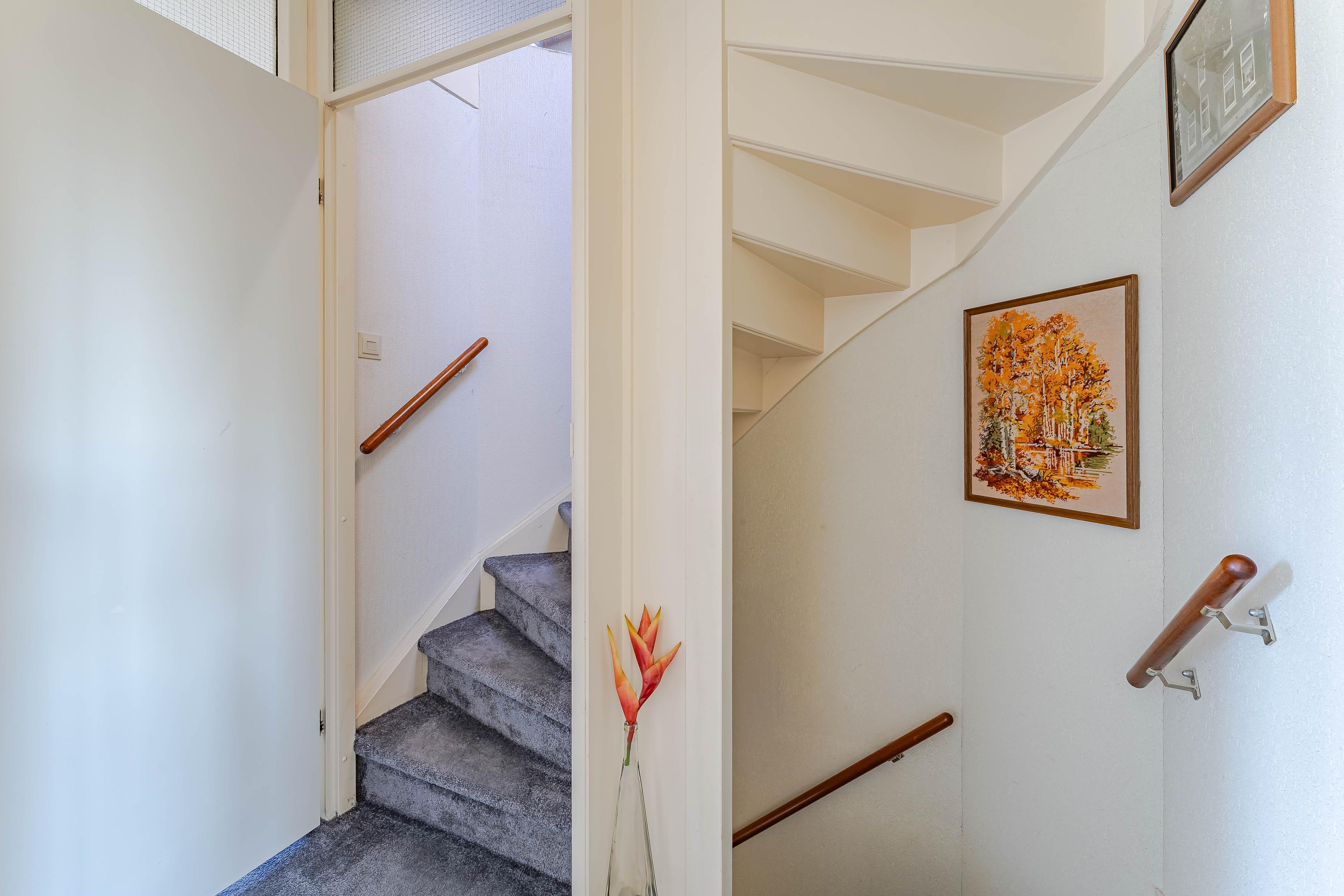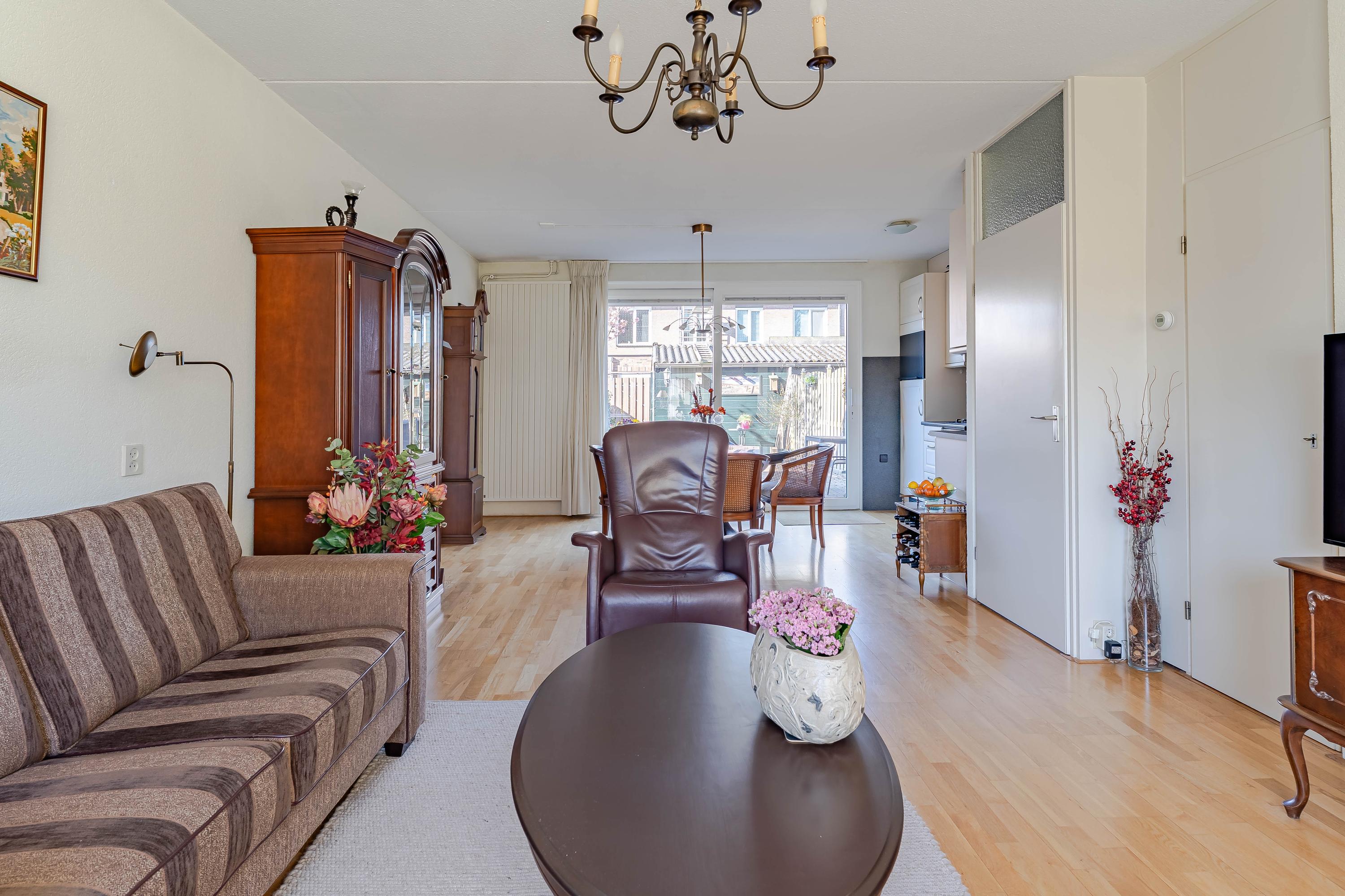 In de hal bevindt zich de meterkast en het toilet met fonteintje. In de ruime woonkamer valt gelijk de hoeveelheid daglicht op. Vanuit de zithoek kijkt u leuk groen weg. De grote schuifpui aan de achterzijde geeft mooi uitzicht op de tuin. Naast een vaste kast is de trapopgang naar de eerste verdieping afsluitbaar. De open keuken is voorzien van een gaskookplaat, afzuigkap, oven en een koelkast.