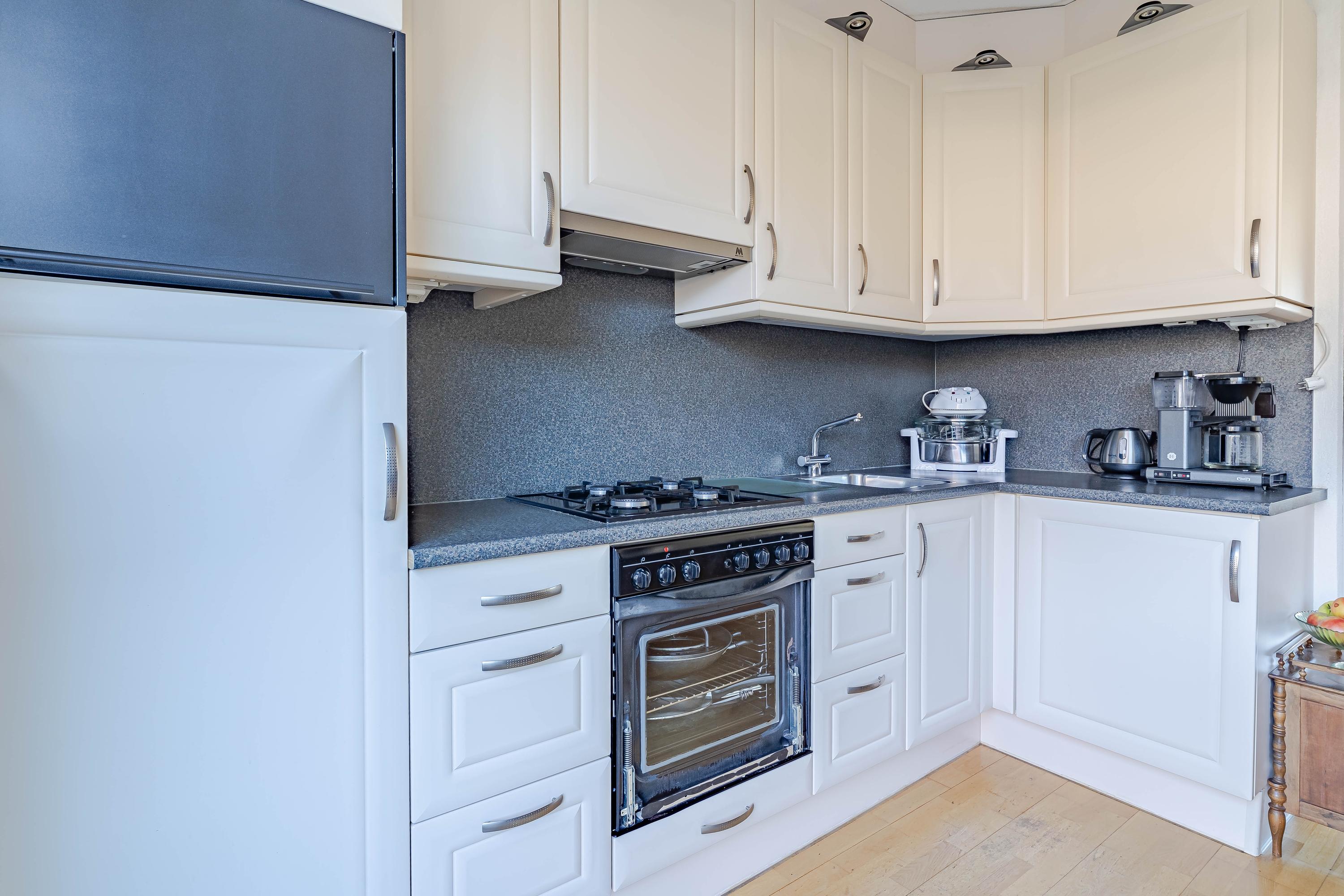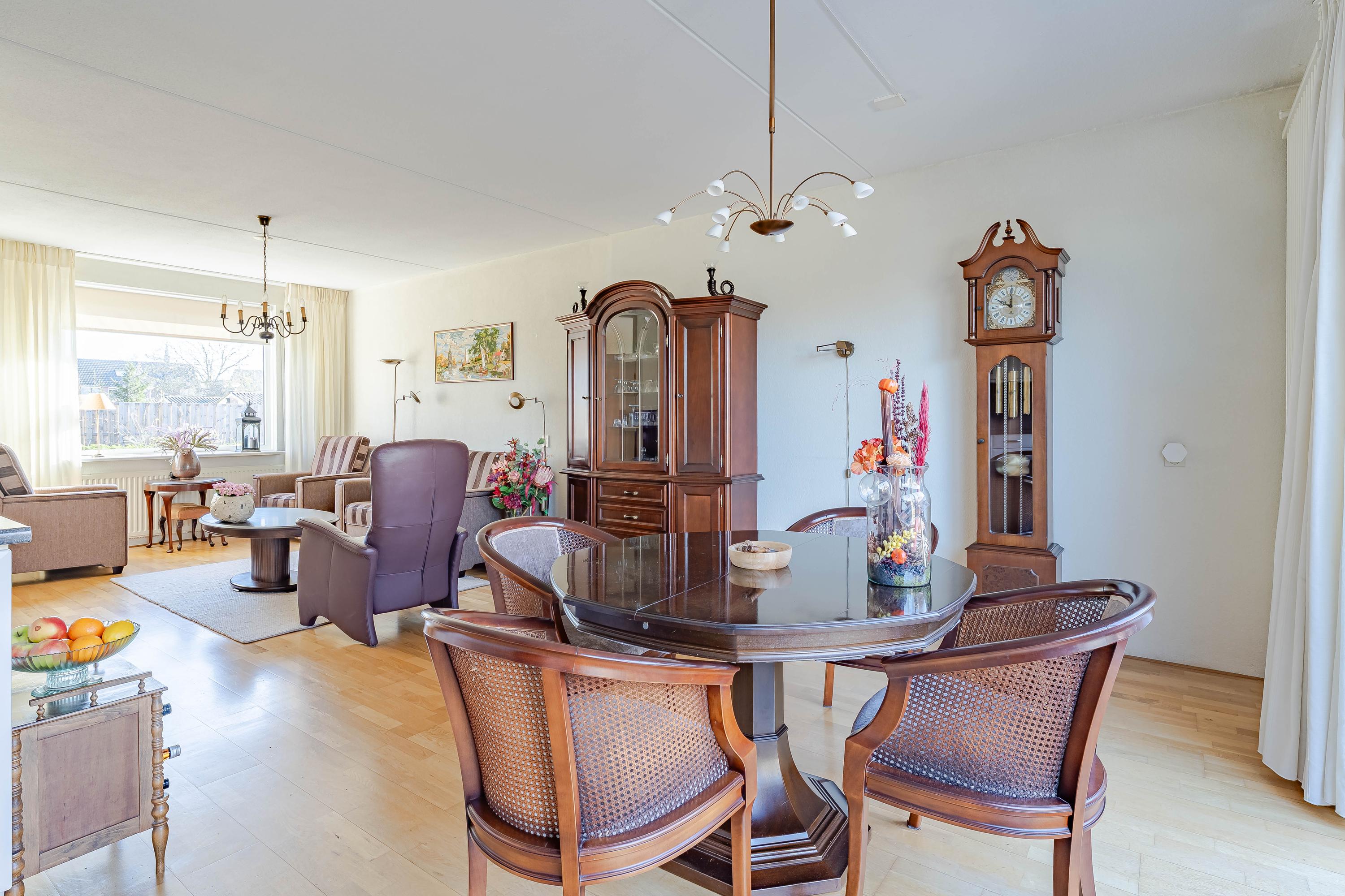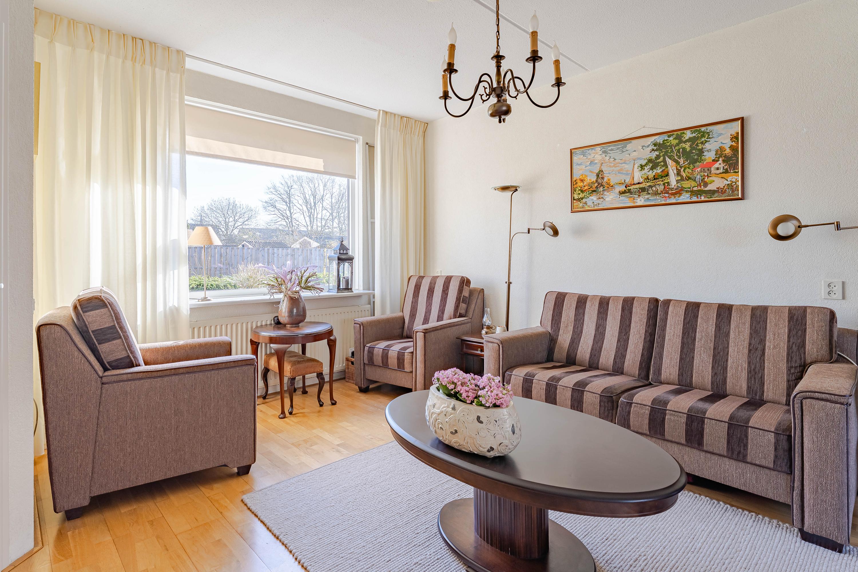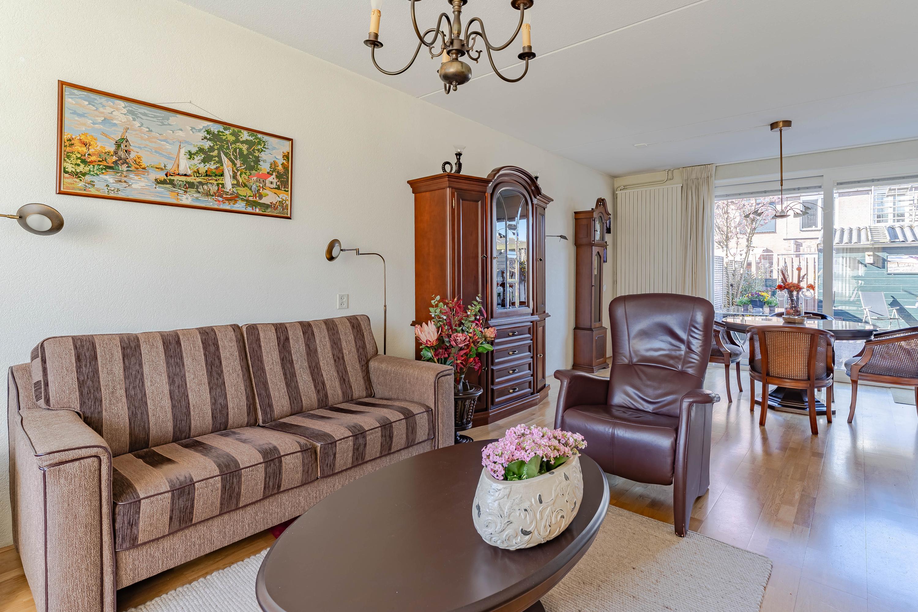 In de hal bevindt zich de meterkast en het toilet met fonteintje. In de ruime woonkamer valt gelijk de hoeveelheid daglicht op. Vanuit de zithoek kijkt u leuk groen weg. De grote schuifpui aan de achterzijde geeft mooi uitzicht op de tuin. Naast een vaste kast is de trapopgang naar de eerste verdieping afsluitbaar. De open keuken is voorzien van een gaskookplaat, afzuigkap, oven en een koelkast.