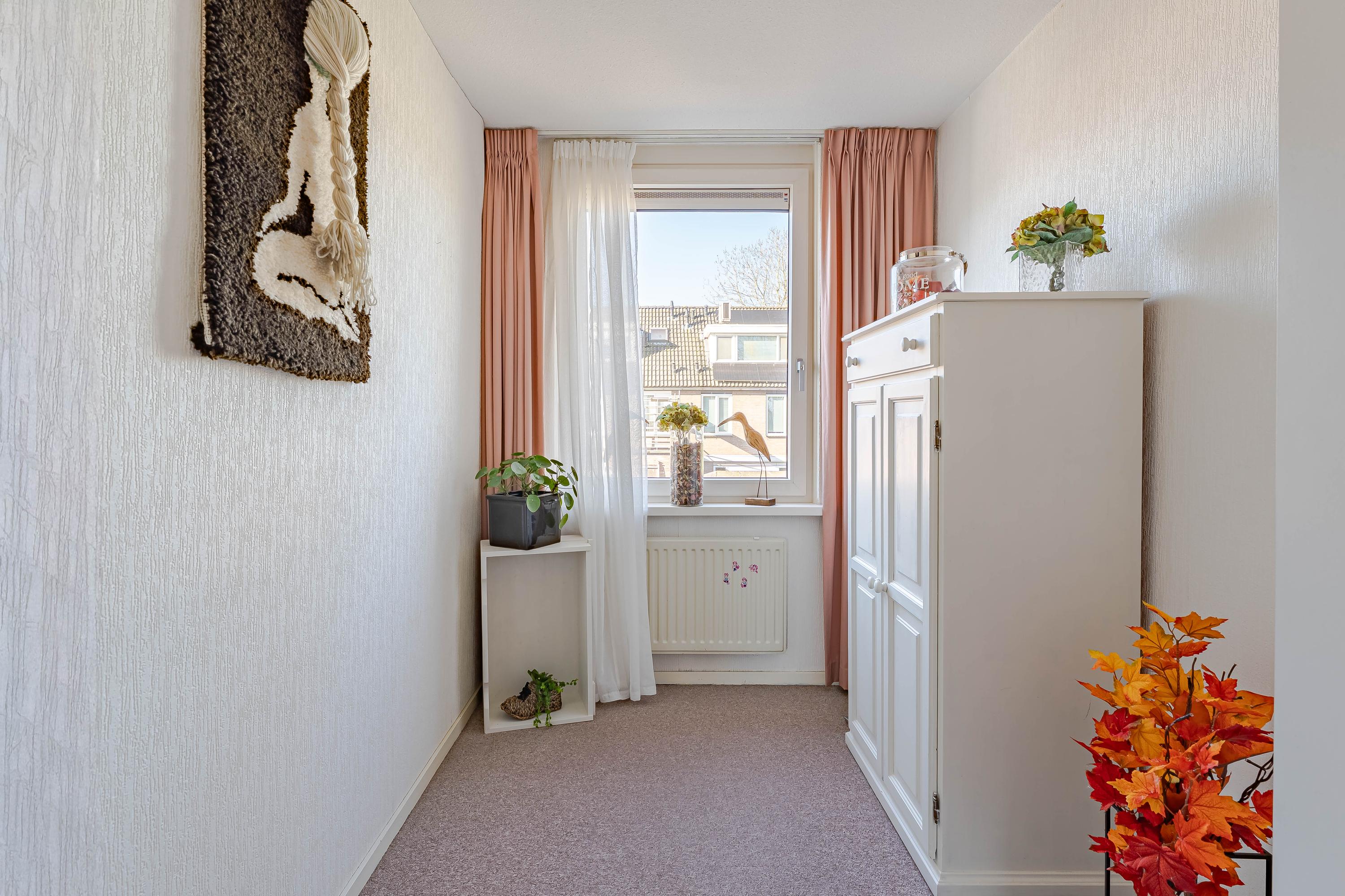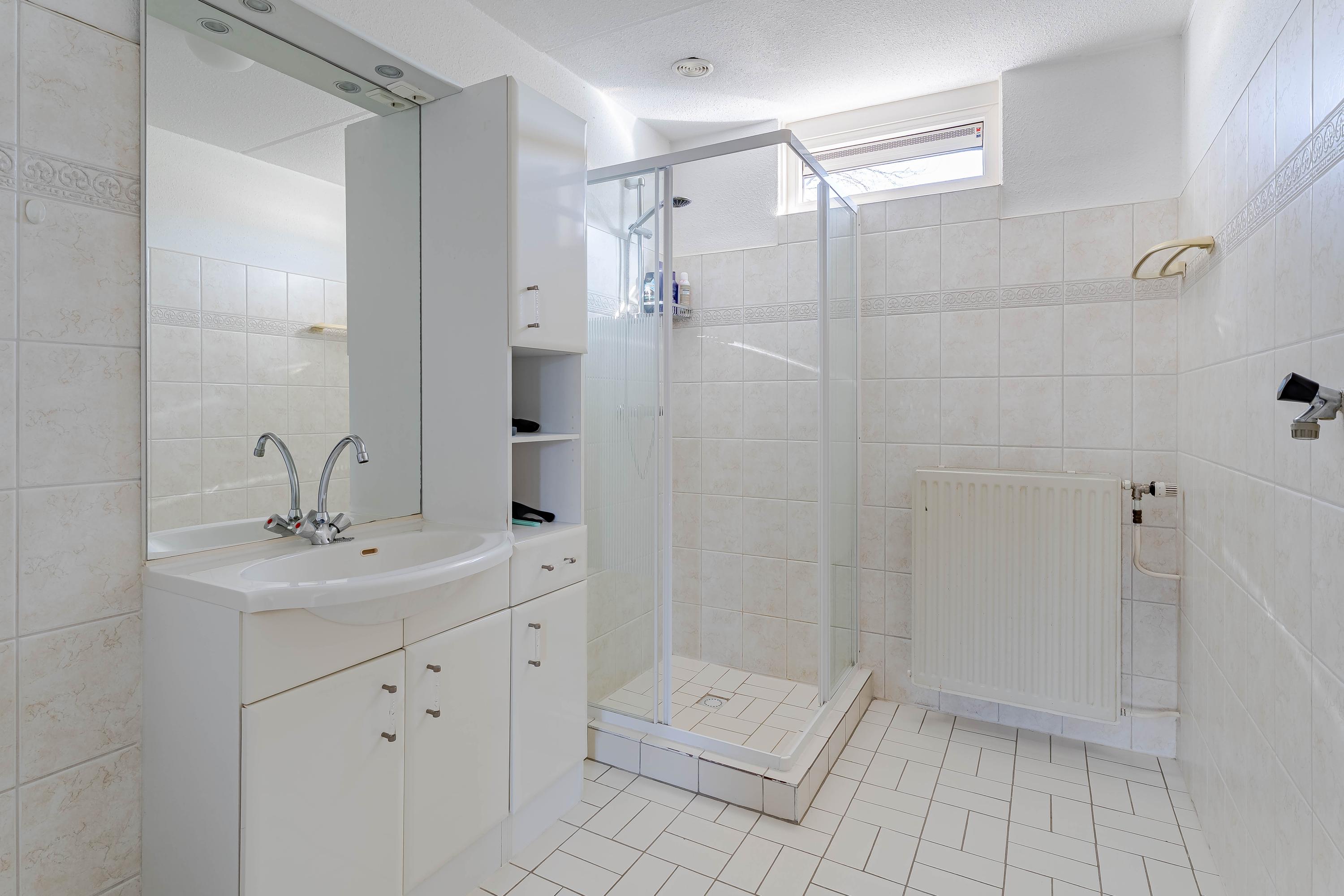 Overloop met toegang tot de drie slaapkamers en de ruime badkamer. Twee slaapkamers liggen aan de achterzijde van de woning en één aan de voorzijde naast de badkamer. Deze is ingericht met een douchecabine, toilet en wastafel met meubel.